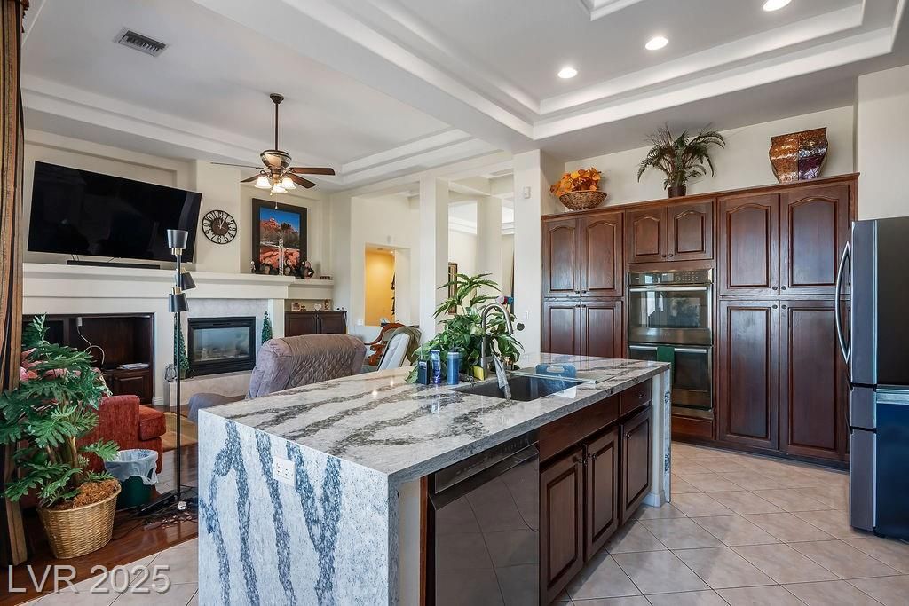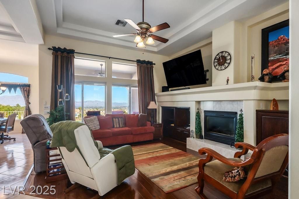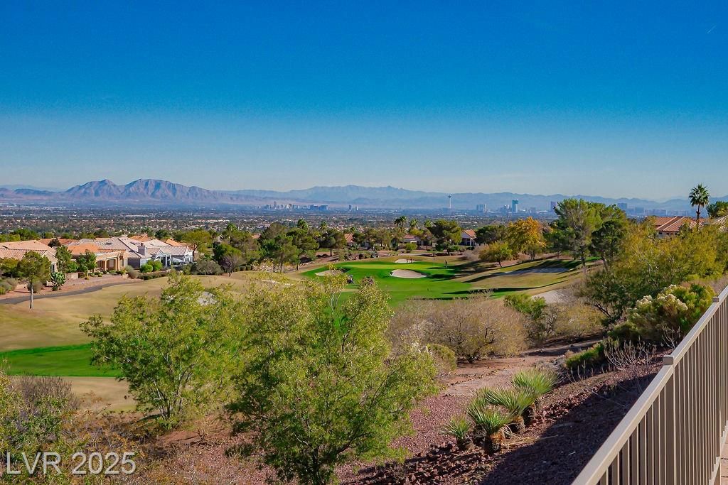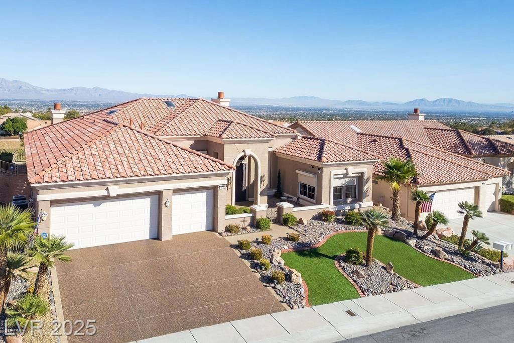 Stately 2,819 sq. ft. Aristocrat model featuring dual primary en-suites on an elevated lot overlooking the 15th fairway of Highland Falls, with shimmering views of the Las Vegas Valley. Curb appeal features permanent turf, a pebblestone driveway, and a gated courtyard, with equally inviting backyard spaces. The open floor plan is perfect for living and entertaining and is accented by elegant double tray ceilings. The home offers a third bedroom and three full baths, plus a powder room. Electric Rolladen shutters on every window add security and energy efficiency. A quartz waterfall island highlights the upgraded kitchen with premium appliances and richly finished cabinetry. The main primary en-suite includes a large walk-in closet and a cozy fireplace, apart from the secondary bedrooms and baths for ideal room separation. Experience luxury living, breathtaking views, and a truly rare floor plan—this exceptional home is designed to impress. Sun City Summerlin — active 55+ community.