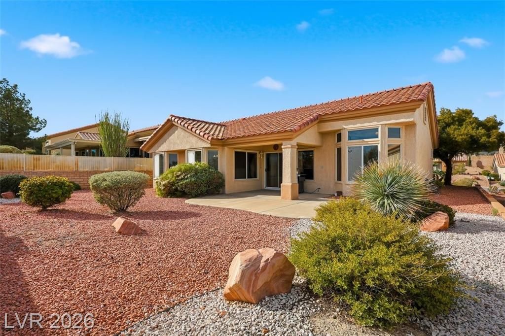 55 +SUN CITY SUMMELIN! RARE City/Strip & Mountain VIEW lot! Unbelievable value! Popular RENO 2bd split floorplan! Near Highland Falls Golf Course & clubhouse! Spacious open living & dining room with VAULTED CEILINGS! Tile floors! Sunny & bright kitchen with eat-in nook breakfast room! Primary suite SEPARATE from guest quarters! Set up as 2 bed & a office. BUILT-IN DESK & shelving, SOLAR TUBE in original laundry area, 2 baths! 2-CAR GARAGE w/GOLF CART parking & BUILT IN STORAGE! Plumbed for water conditioner. NEWER SHOWER in primary! Large low maintenance backyard w COVERED PATIO/BBQ STUB! ALL APPLIANCES included! BAY WINDOWS in both bedrooms & kitchen nook area! Formal DR could be used as office/library/den etc. RESORT STYLE 55+plus living! Golf, Tennis, multiple pools, fitness center, golf courses, clubs, activity centers, tennis, pickleball & more! Conveniently located near shopping, dining, 215 & 95. No neighbors behind! Original owner! Best priced VIEW home in Sun City Summerlin!