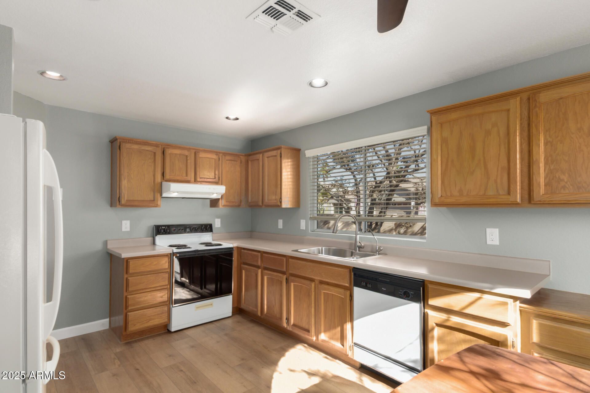 Beautifully updated 2-bedroom, 2-bath home offering 1,323 sq ft of living space on a large lot in the highly desirable Iron Oaks in the Sun Lakes Community. This immaculate residence features a bright and open living room, formal dining area, and an eat-in kitchen filled with abundant natural light. Recent upgrades include wide-plank luxury vinyl wood-look flooring, new baseboards, fresh interior paint, updated switches and receptacles, and new lighting throughout. Both bathrooms have been fully remodeled with new vanities, a new shower, new tub surround, and sleek black fixtures and accent details. The home has been meticulously maintained and is truly move-in ready. Iron Oaks is a gated active adult community offering resort-style living with exceptional amenities including golf courses, walking trails, a fitness center, multiple swimming pools, billiards, tennis courts, and a vibrant community center. Residents enjoy a wide variety of clubs, groups, and year-round community events, providing an engaging and social lifestyle.