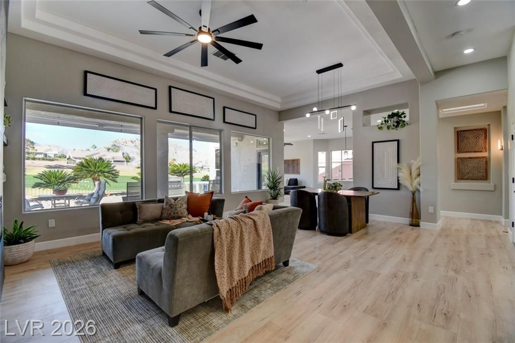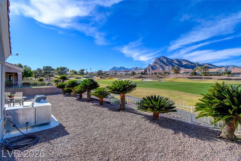 Exquisite fully renovated luxury home on the golf course with breathtaking mountain and sunset views. Designer-curated with high-end modern finishes, newly opened living spaces created by removing interior walls for an expansive, contemporary flow. Brand-new kitchen features custom cabinetry, sophisticated lighting, stainless-steel appliances. Elegant living areas showcase a striking accent wall with sleek fireplace, panoramic views from the family room, living room, & premier bedroom. Premier suite has been completely reinvented, offering enlarged his & hers closets with custom organizers, a one-of-a-kind spa-quality bathroom featuring an expansive double walk-in shower and separate soaking tub. Exceptional outdoor living includes a spacious patio, brand-new outdoor kitchen, upgraded awning, and ceiling fans indoors & out—perfect for enjoying vibrant sunsets over the mountains. A rare, ultra-luxury golf course residence with extraordinary views and meticulous upgrades throughout.