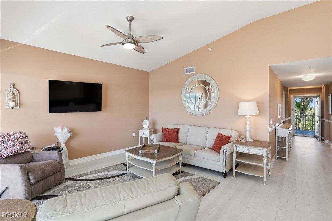 Enjoy easy Florida living in this top-floor, 2-bedroom, 2-bath condo located in the desirable Ravenna neighborhood of Pelican Preserve. Offering 1,283 square feet of open living space, this residence features volume ceilings, a light-filled great room, and sliding glass doors leading to a screened lanai with tranquil lake views. The primary suite includes an ensuite bath with a walk-in shower, while the guest bedroom and second full bath provide comfortable space for visitors. Additional highlights include elevator access, a detached carport, and concrete block construction. Pelican Preserve is a guard-gated, resort-style community known for its exceptional amenities, including pools, fitness and spa facilities, pickleball and tennis courts, walking and biking paths, golf (non-equity), on-site dining, and social activities. Conveniently located near shopping, dining, and all that Fort Myers has to offer, this home is ideal for full-time living or a seasonal retreat.