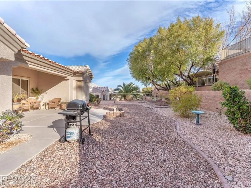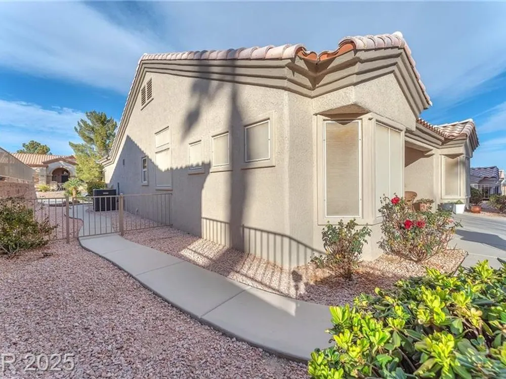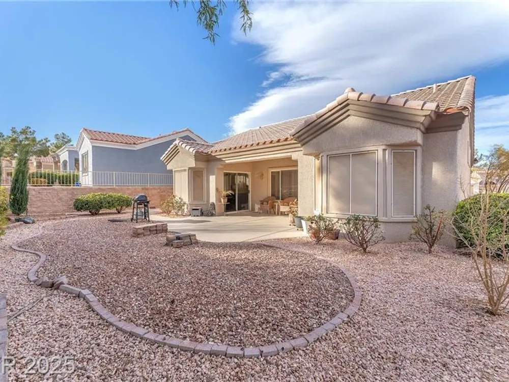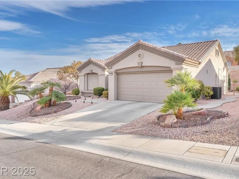This beautiful turnkey, 2 bed, 2 bath, single story home in a premier 55+ Las Vegas community offers recent upgrades including a new AC/coil, hot water heater, whole house filtration/softener, front drip system, quartz counters, new cabinets, LG appliances, updated plumbing fixtures, fans, blinds, and fresh interior/exterior paint. Light filled open living space flows into a gourmet kitchen with breakfast bar and dining area. The split bedroom layout ensures privacy with a primary suite boasting a bay window and remodeled bath and spacious guest bedroom/office, and refreshed hall bath separating the two. Desert friendly landscaping in front and back with mature vegetation and covered patio. At the Desert Vista center you'll find pools, spa, fitness, pickleball, tennis, golf and many clubs. The community centers offer ballrooms, arts and crafts rooms, bocce ball and entertainment. Just minutes from downtown Las Vegas and the Strip, and numerous outdoor areas such as Red Rock Canyon.