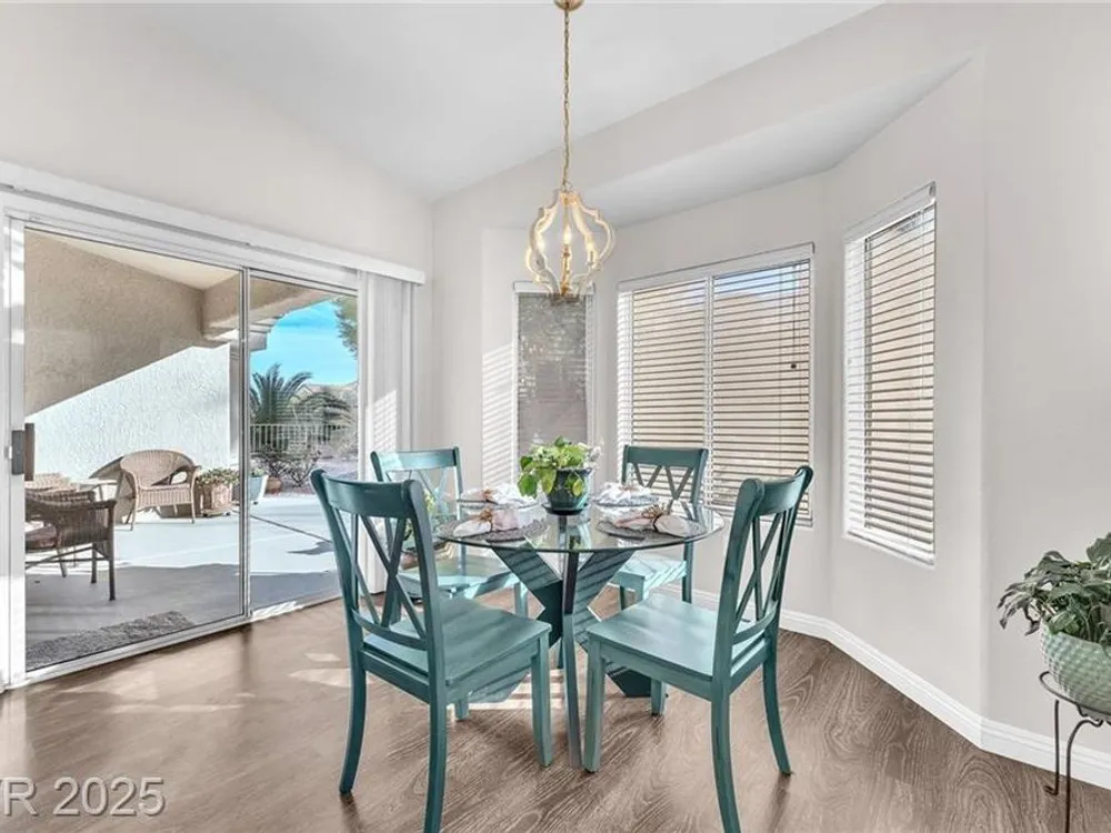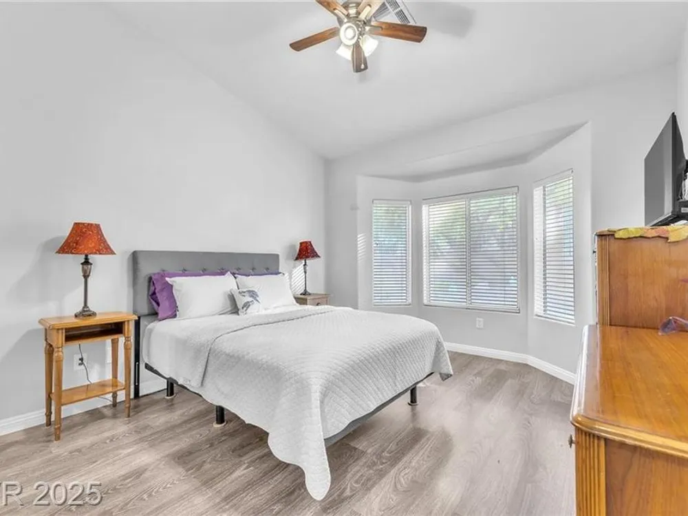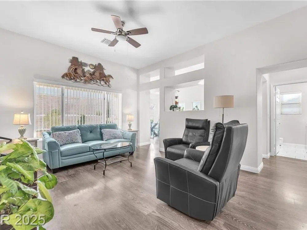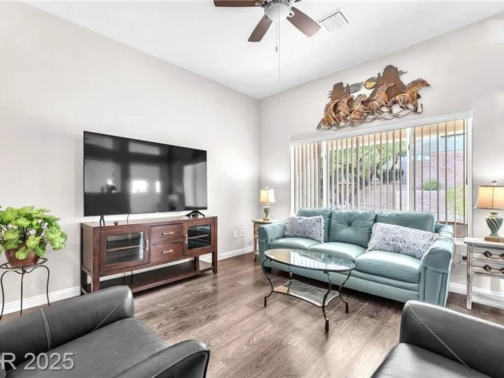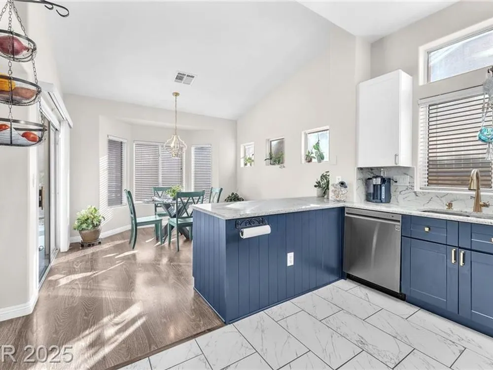 This beautiful turnkey, 2 bed, 2 bath, single story home in a premier 55+ Las Vegas community offers recent upgrades including a new AC/coil, hot water heater, whole house filtration/softener, front drip system, quartz counters, new cabinets, LG appliances, updated plumbing fixtures, fans, blinds, and fresh interior/exterior paint. Light filled open living space flows into a gourmet kitchen with breakfast bar and dining area. The split bedroom layout ensures privacy with a primary suite boasting a bay window and remodeled bath and spacious guest bedroom/office, and refreshed hall bath separating the two. Desert friendly landscaping in front and back with mature vegetation and covered patio. At the Desert Vista center you'll find pools, spa, fitness, pickleball, tennis, golf and many clubs. The community centers offer ballrooms, arts and crafts rooms, bocce ball and entertainment. Just minutes from downtown Las Vegas and the Strip, and numerous outdoor areas such as Red Rock Canyon.
