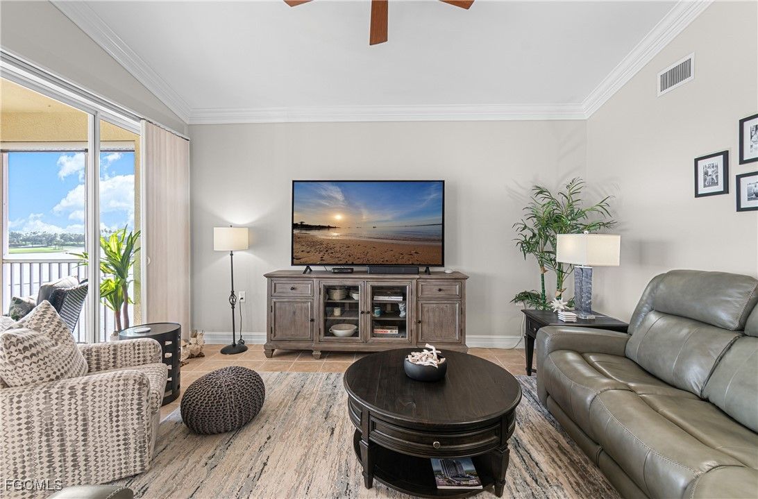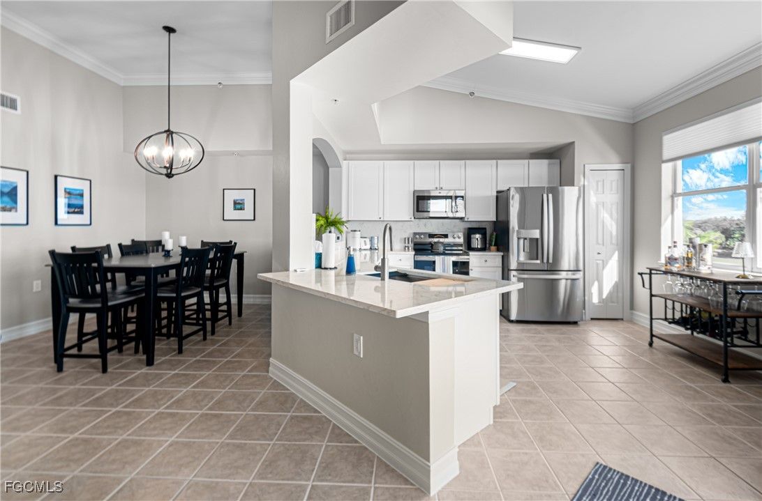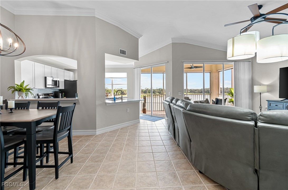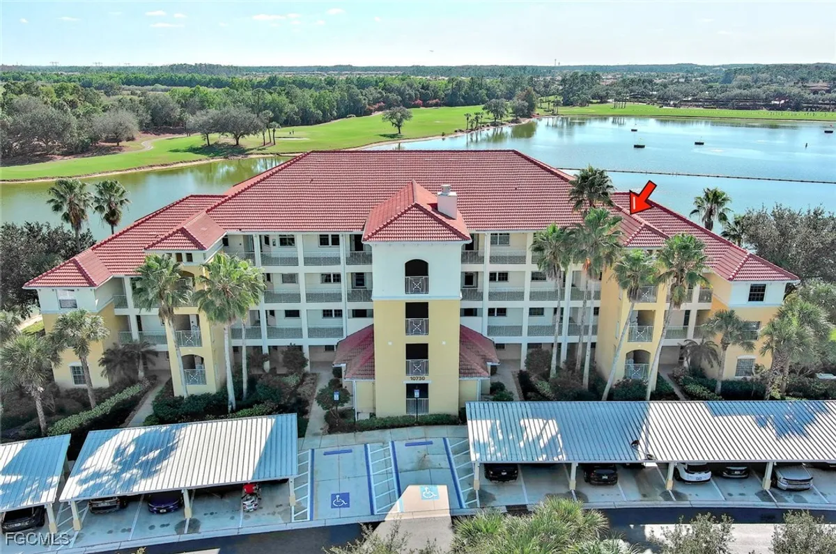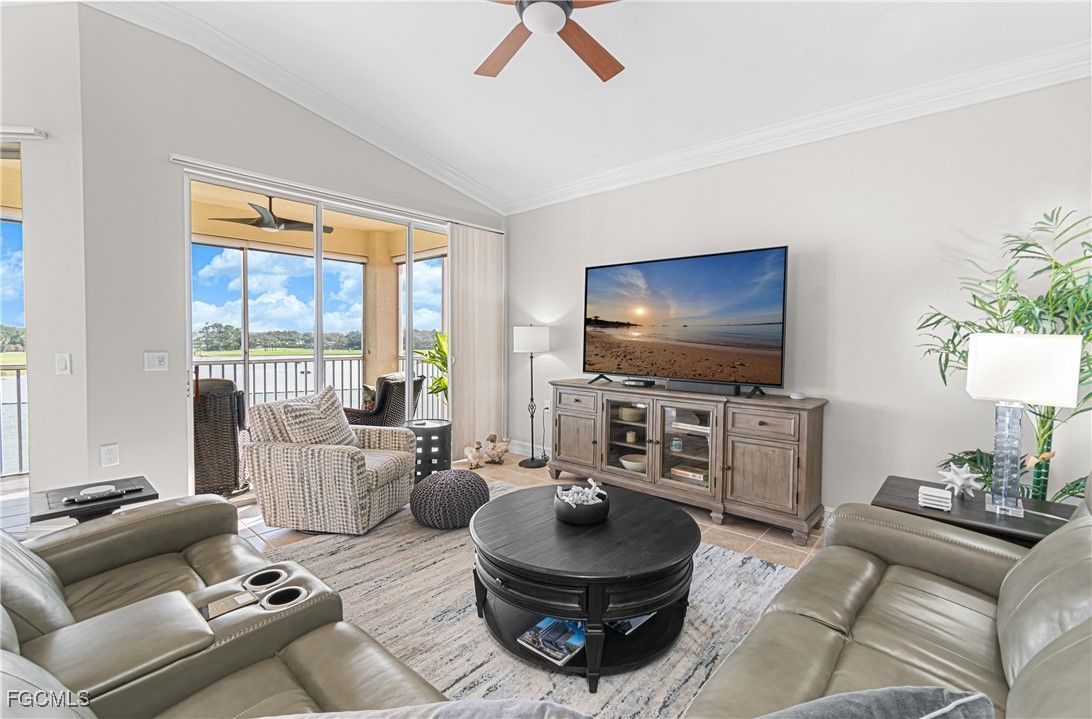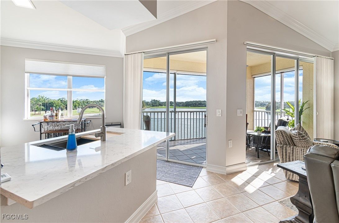 TURNKEY Ravenna 4th Floor "PENTHOUSE" Condo with the Absolute Best View in Pelican Preserve. 180 Degree View of the Best Morning Sunrises & those Amazing S.W. Florida Sunsets! Plus, perfectly located with a Middle of the "Lake Driving Range" with views of the Clubhouse & Fairways on each side of the Lake! LOCATION! LOCATION! LOCATION! AMAZING LAKE VIEW FROM YOUR PENTHOUSE 4TH FLOOR CONDO {ON THE TOP FLOOR W/NO ONE ABOVE YOU & AN END UNIT W/ TOTAL PRIVACY ON ONE SIDE } PLUS LOCATED IN PELICAN PRESERVE ONE OF THE TOP 55+ COMMUNITIES IN THE U.S. Totally Open Floor Plan with Vaulted Ceilings! You truly feel like you're in a Single Family Home with the High Ceilings! TONS of UPGRADES: (1.) FURNITURE: All Furniture is "High-End" & was purchased @ Haverty's Fine Furniture=$32,000. (2.) KITCHEN REMODEL: Countertops, Backsplash, Cupboards & Sink Taps=$21,000. (3.) NEW APPLIANCES: (Refrigerator, Stove, Microwave, Dishwasher, Washer & Dryer=$5,800. TOTAL UPDATES =$58,800. LIKE BUYING A NEW HOME! A.C. with Bacteria Filtration System & Hot Water Heater are 2018. Master Bedroom has a King Bed & Luxury Vinyl Plank=NO CARPET! QUARTZ COUNTERTOPS throughout the Home plus SOFT-CLOSE DRAWERS throughout the Home! 70" T.V. for your Entertainment in the Living Room! Laundry Room has LG Washer & Dryer about 1 1/2 years old plus White Cabinets. The Lanai has Tile Flooring & Sun Shades! Come & See this Beautiful Home in Person so You can see for Yourself why this is the Perfect Home For YOU! WELCOME TO PARADISE! YOUR FUTURE HOME IS LOCATED IN PELICAN PRESERVE ONE OF THE TOP 55+ COMMUNITIES IN THE U.S. LOCATED NEAR SWFL INTL. AIRPORT, SHOPPING & THE BEACHES!