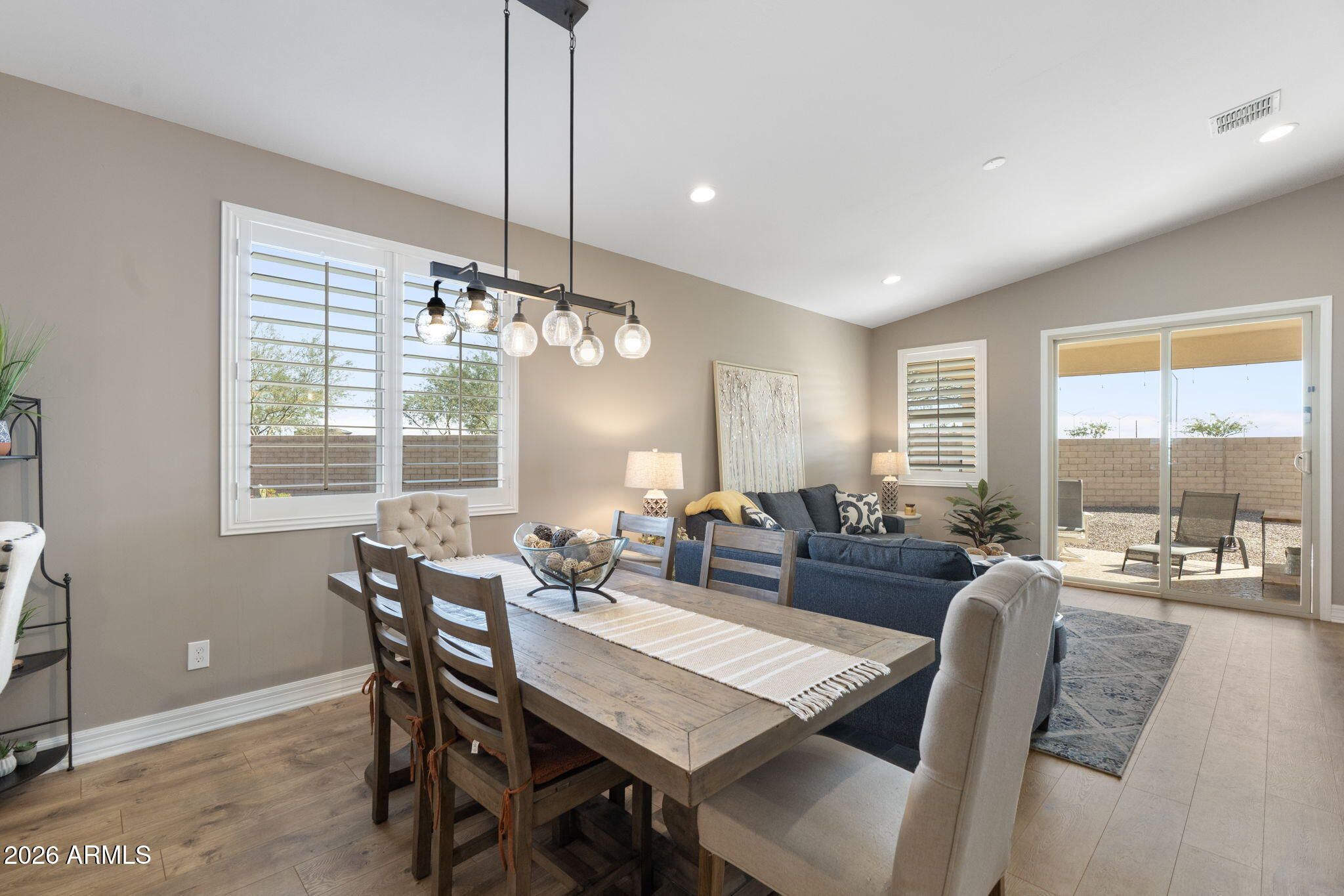 Hard to find premium corner lot, this popular 3 bed (+office!) 2 bath Rumba floorplan is the perfect blend of comfort and style. Top-of the line finishes including satin finish quartz counters, GE cafe appliances, soft close cabinets with under cabinet lighting and crown moulding, gas stove, plantation shutters throughout, laminate plank flooring, 5'' baseboards, smooth drywall finish, and 2 tone paint make this home stand out from the competition. Outside you'll find a huge corner lot with misted patio and yard space on 3 separate sides and an amazing California Pools built saltwater pool with a Baja pad, ozone, and 445 sqft of decking, misting system and an extended length garage (over 24 ft) which accommodates larger vehicles!