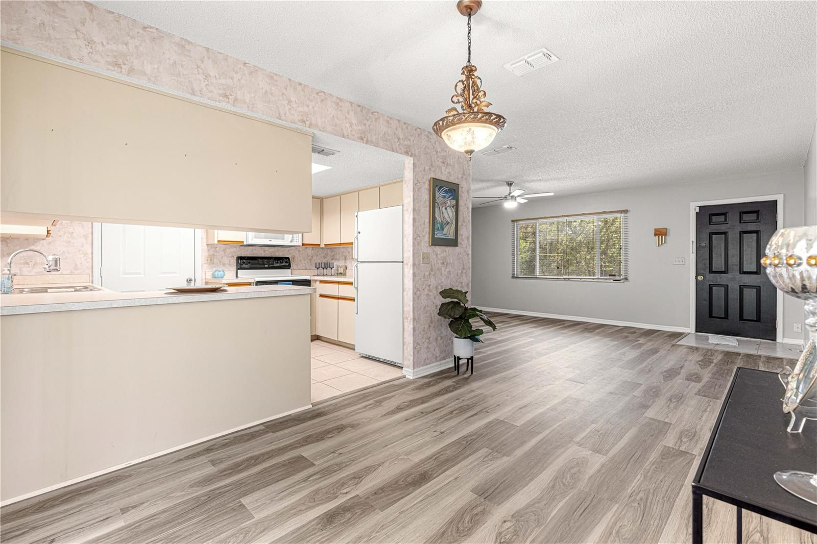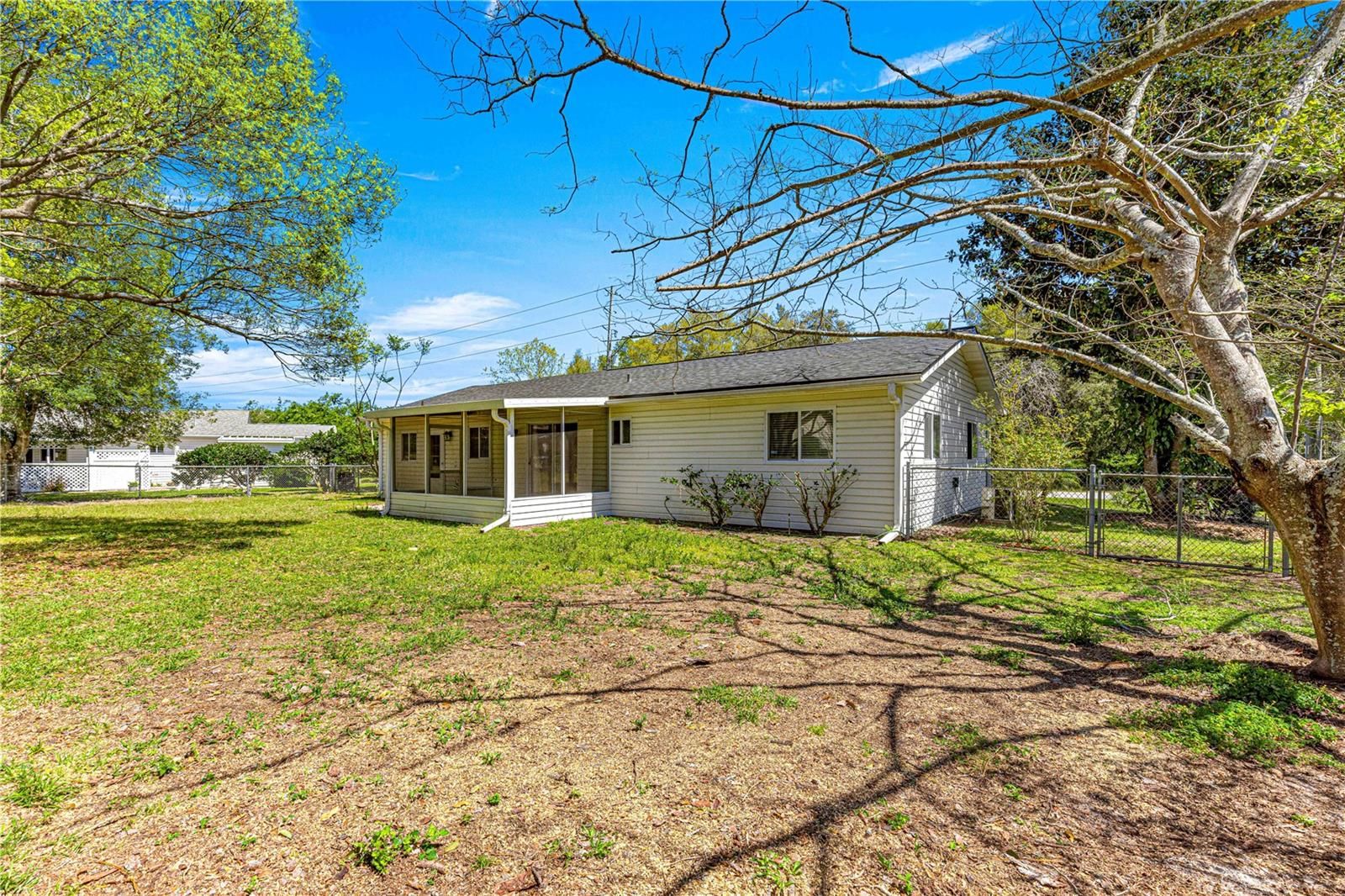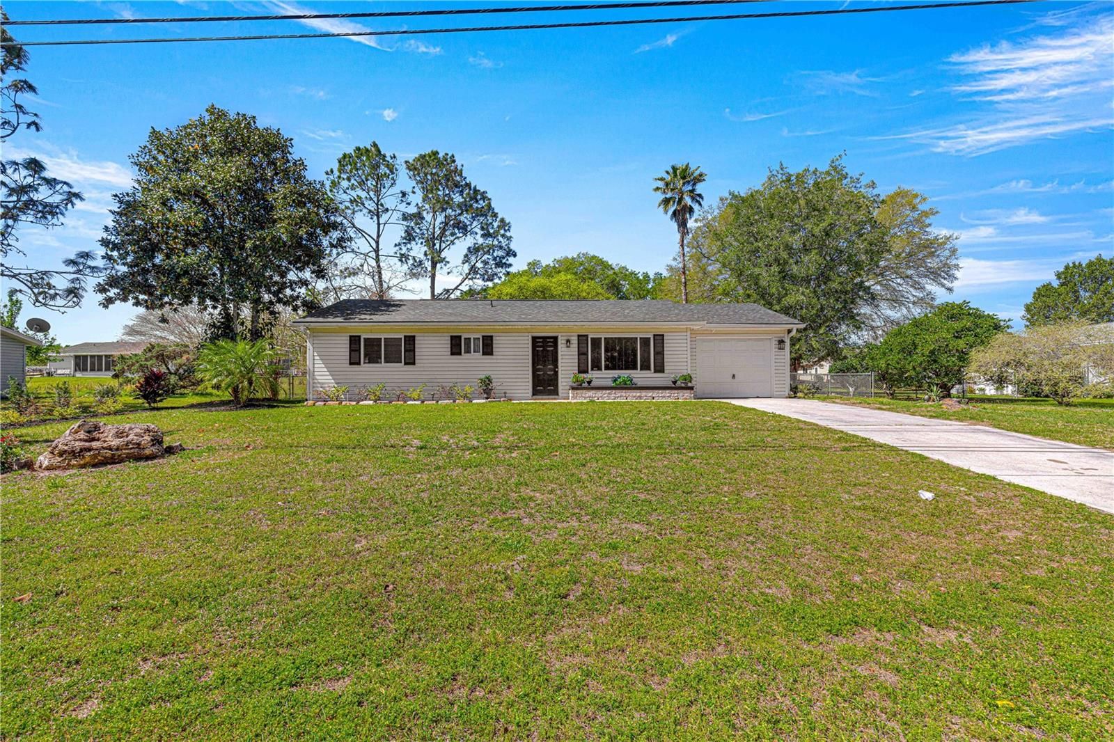 Welcome to this beautifully updated 2-bedroom, 2-bathroom home, offering modern comfort in a prime location! FRESHLY INTERIOR PAINTED, this home features new shutters, updated landscaping, and a BRAND NEW 2025 ROOF. The exterior boasts a chain-link fence, rain gutters, and a screened-in back porch lanai with new carpeting—perfect for relaxing year-round. Inside, you'll find new LUXURY VINYL PLANK flooring in the living area, tile in the kitchen and bathrooms, and BRAND NEW CARPET in the bedrooms. The master suite offers a walk-in closet and a walk-in shower, with upgraded lighting in both bathrooms. The kitchen is fully equipped and includes all appliances, plus a washer and dryer conveniently located in the garage. Located just minutes from SR-200, you’ll have easy access to restaurants, grocery stores, shopping, and a nearby Publix. Nestled in a welcoming 55+ community, this home is move-in ready and waiting for you!