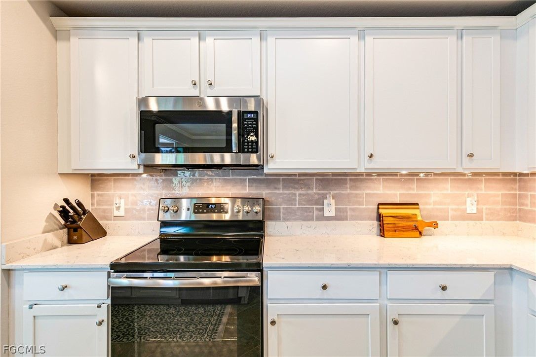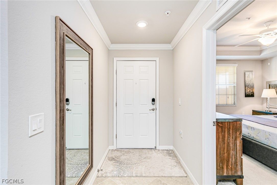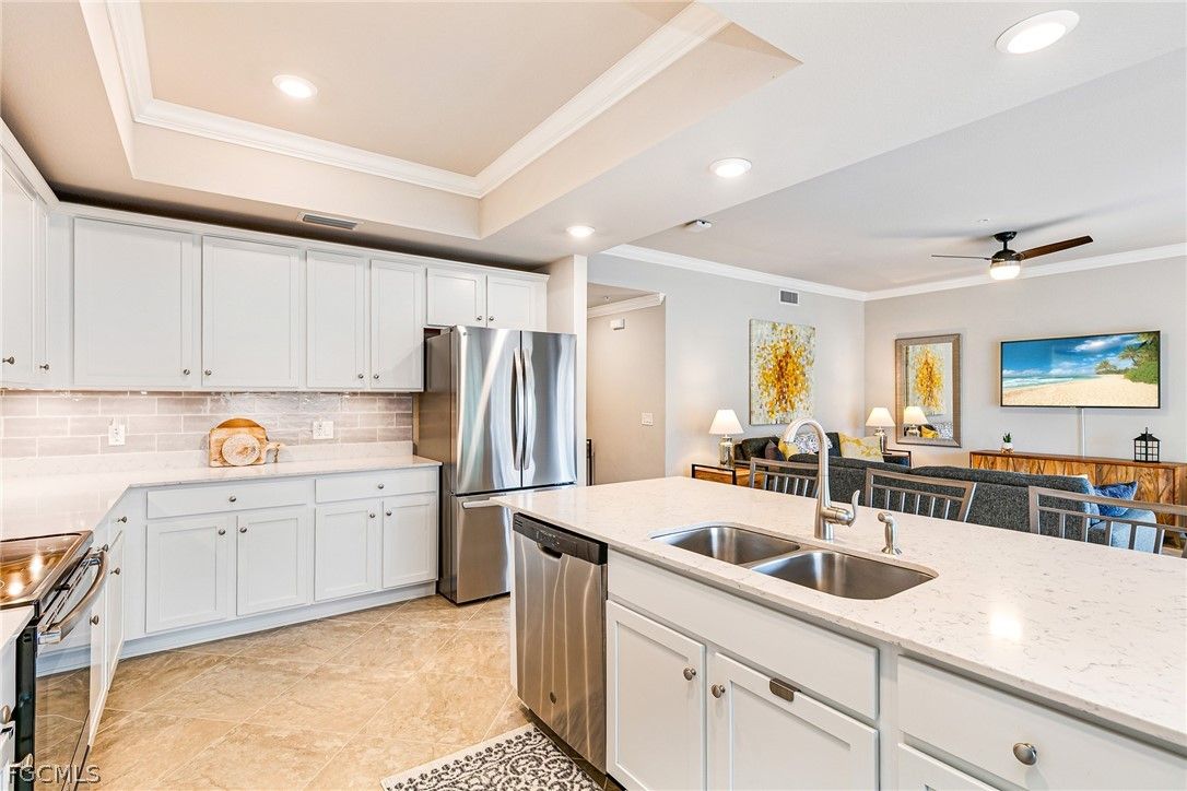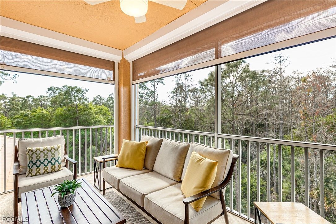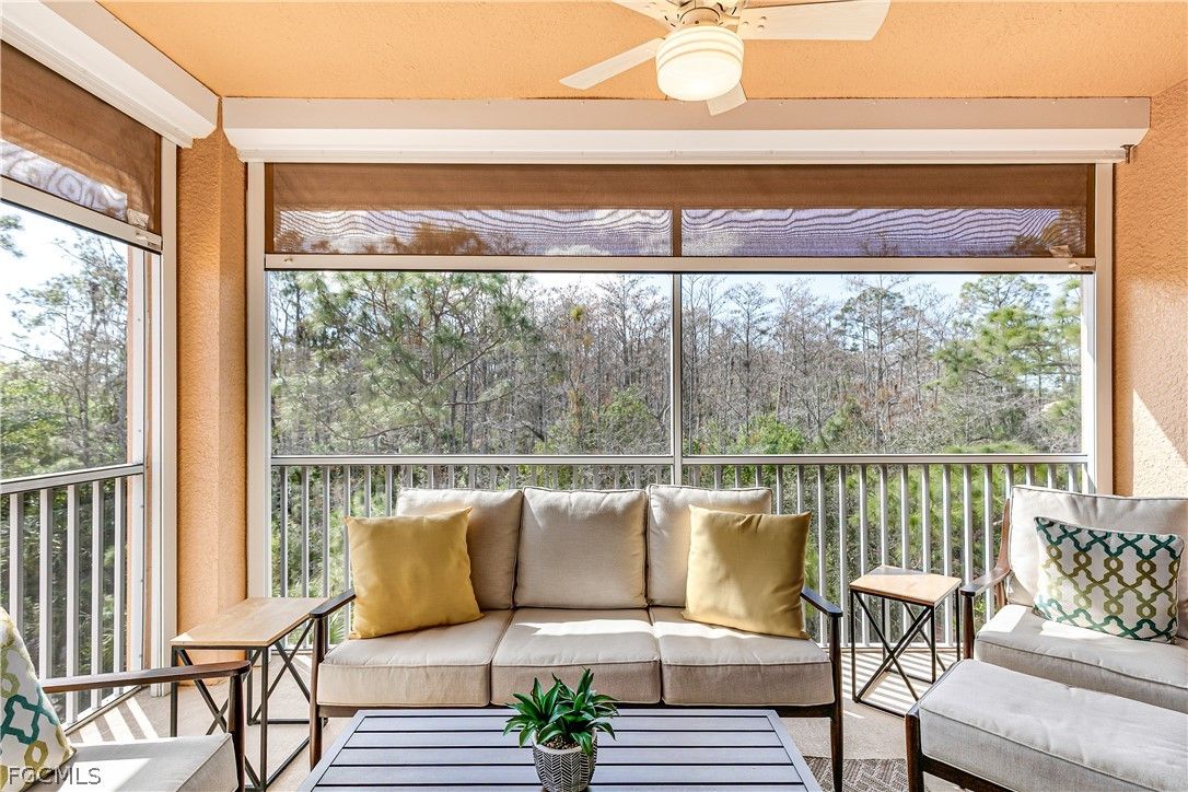 Step into a residence where style, comfort, and seamless design come together effortlessly—beautifully showcased in this furnished top-floor end unit on a quiet street in the Palazzo neighborhood of Pelican Preserve. Impeccably maintained and thoughtfully decorated, this spacious 2BR/2BA home shows like a model with pristine furnishings in every room, large closets, crown molding, stainless steel appliances, quartz countertops, under-cabinet lighting, subway tile backsplash, pantry, large island, carefully selected flooring, elegant lighting and ceiling fans throughout. Enjoy a fully private screened lanai with serene preserve views and no visible neighboring units. With impact-glass doors and windows, Storm Smart lanai screens, and comfortable outdoor seating, this is the perfect spot for morning coffee or an evening wind-down. As a top-floor end unit, you’ll appreciate exceptional quiet, added natural light, and outstanding privacy—with close proximity to the Palazzo residents-only pool. Pelican Preserve offers world class amenities, including an optional membership to the 27-hole championship golf course, resort and lap pools, indoor pool and walking track, spa, sauna, fitness center, fitness room offering various classes, dining venues, casual pool-side restaurant, miles of walking and biking trails, tennis, pickleball, bocce, dog parks, art studio, woodworking shop, movie theater, amphitheater with live entertainment, seasonal farmers market and much more. Close to grocery stores, hospitals, restaurants, shopping, performing arts, SW International Airport and a short drive to the Gulf Beaches. Additional conveniences include new A/C 2025, a covered parking space with electric outlet for golf cart and an oversized storage unit within steps to the unit and common elevator. Beautifully furnished, and perfectly positioned—this condo offers comfort, style, and exceptional Pelican Preserve living.