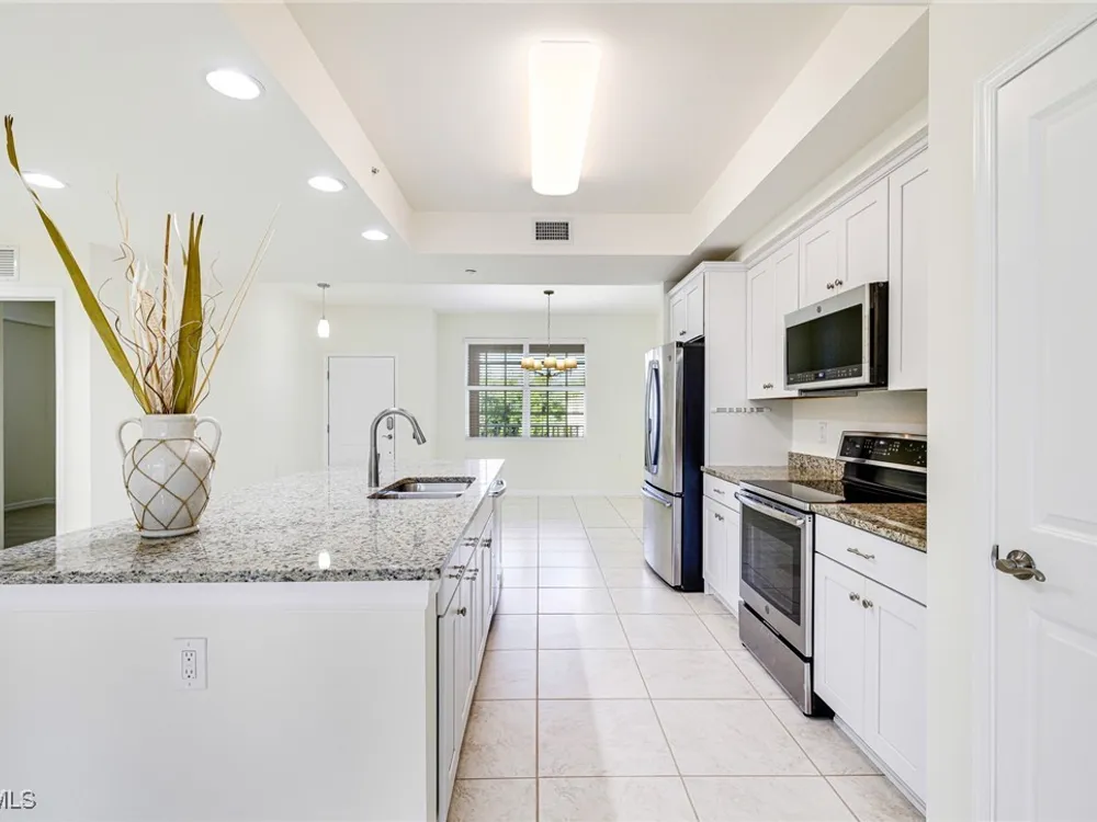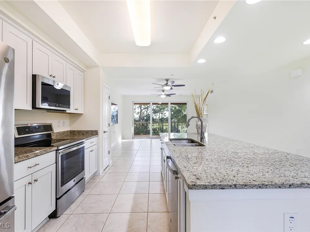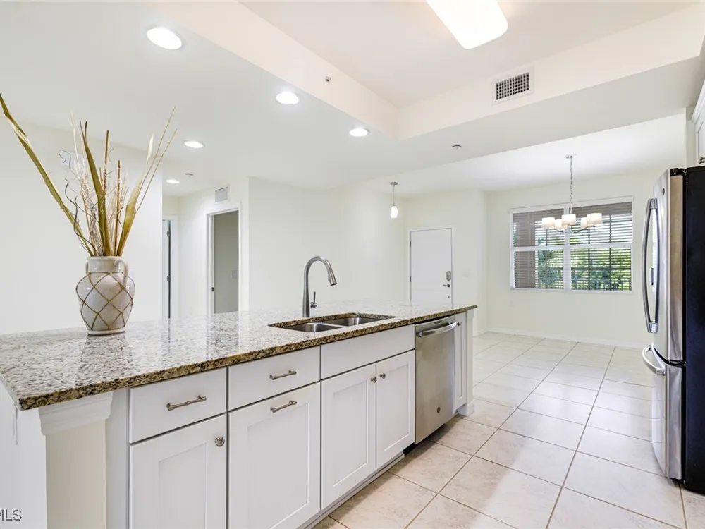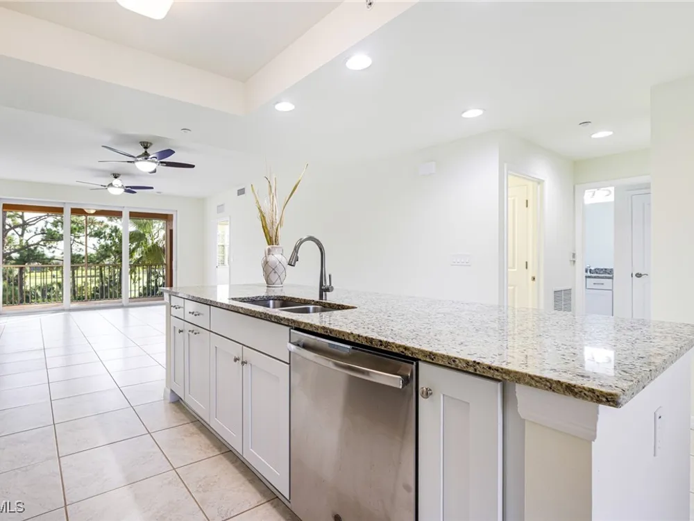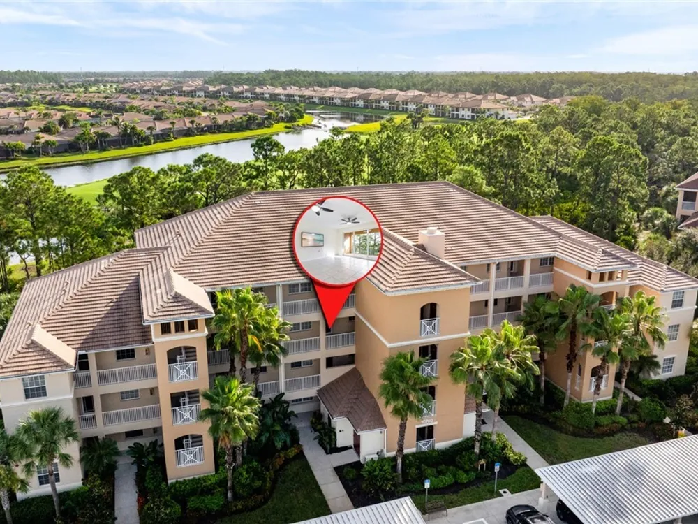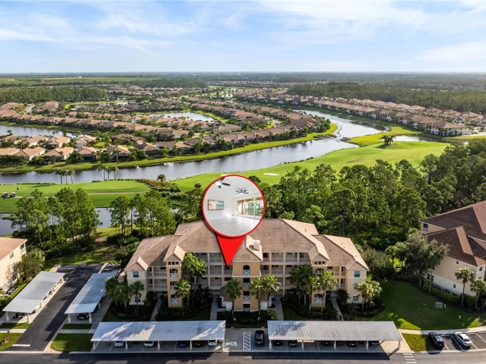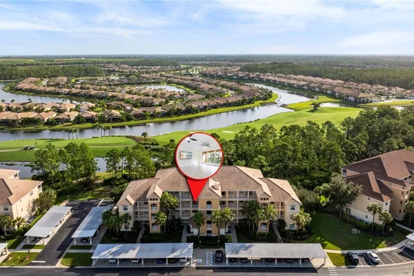 You will undoubtedly be captivated by this 3rd floor unit that shows like it's brand new! MOVE IN READY AND PRICED TO SELL! It has a fresh coat of paint on all walls and doors and trim, floors have been cleaned and grout sealed. There are newer GE profile appliances in the kitchen and WH was replaced in 2022. There is granite on counters in kitchen and bathrooms. Beautiful tile floors in the living area and luxury vinyl in the primary bedroom. 75" Television is included. LOCATION, LOCATION, LOCATION! The view is amazing from the lanai with morning sun, golf course and water. You will love sitting here in the morning with your coffee or afternoons with your favorite beverage, as you relax after a full day of activities. The covered parking area is close to the elevator and has electric outlet for charging your golf cart...a popular way to get around the community. The convenience of a private resort-style pool and spa just steps away adds to the allure of this property. Pelican Preserve has been ranked as the fifth-best community for individuals aged 55 and older in the entire nation. This gated community is highly sought-after and offers a plethora of amenities, including pickle ball, tennis, bocce ball, outdoor amphitheater, spa, fitness, walking trails, dog parks, swimming pools, restaurants, craft rooms, card rooms, clubs for all interests and so much more. Golf membership is optional. Isn't it time to turn your dreams into reality and start living the life you've always envisioned?