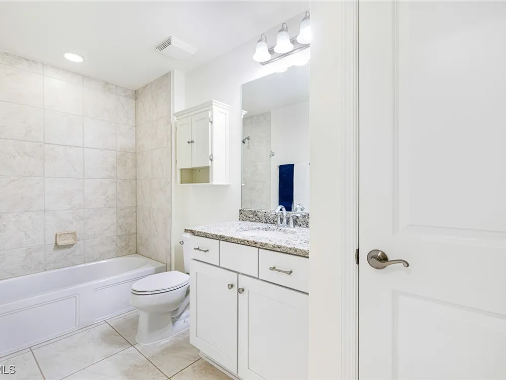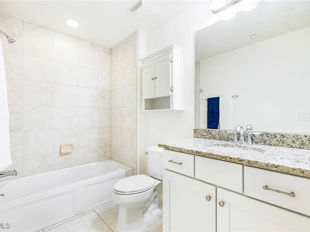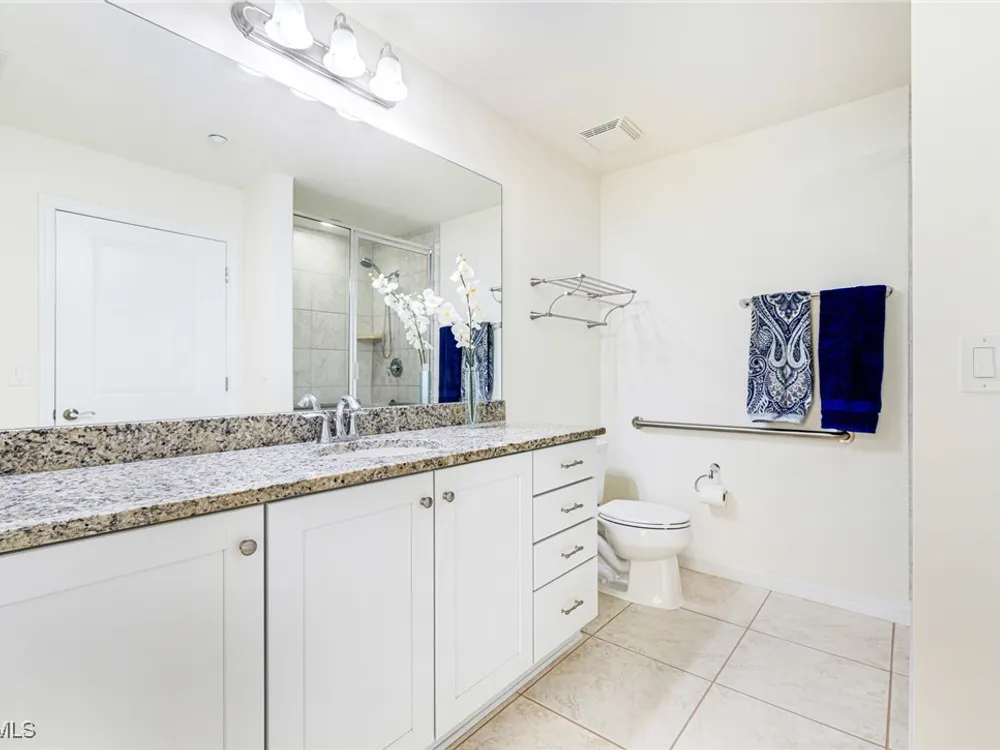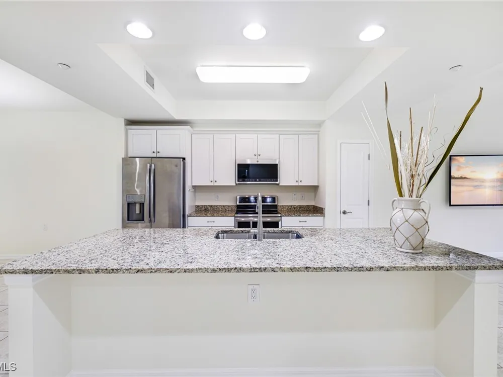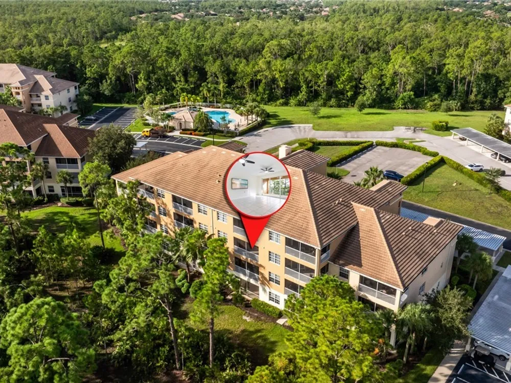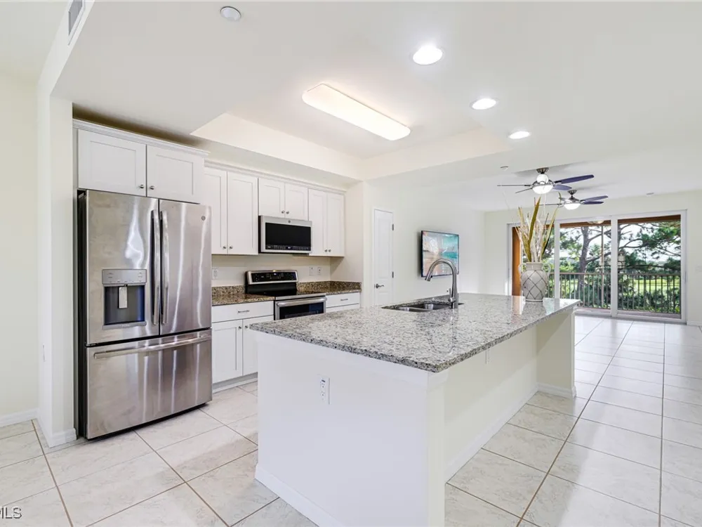 You will undoubtedly be captivated by this 3rd floor unit that shows like it's brand new! MOVE IN READY AND PRICED TO SELL! It has a fresh coat of paint on all walls and doors and trim, floors have been cleaned and grout sealed. There are newer GE profile appliances in the kitchen and WH was replaced in 2022. There is granite on counters in kitchen and bathrooms. Beautiful tile floors in the living area and luxury vinyl in the primary bedroom. 75" Television is included. LOCATION, LOCATION, LOCATION! The view is amazing from the lanai with morning sun, golf course and water. You will love sitting here in the morning with your coffee or afternoons with your favorite beverage, as you relax after a full day of activities. The covered parking area is close to the elevator and has electric outlet for charging your golf cart...a popular way to get around the community. The convenience of a private resort-style pool and spa just steps away adds to the allure of this property. Pelican Preserve has been ranked as the fifth-best community for individuals aged 55 and older in the entire nation. This gated community is highly sought-after and offers a plethora of amenities, including pickle ball, tennis, bocce ball, outdoor amphitheater, spa, fitness, walking trails, dog parks, swimming pools, restaurants, craft rooms, card rooms, clubs for all interests and so much more. Golf membership is optional. Isn't it time to turn your dreams into reality and start living the life you've always envisioned?