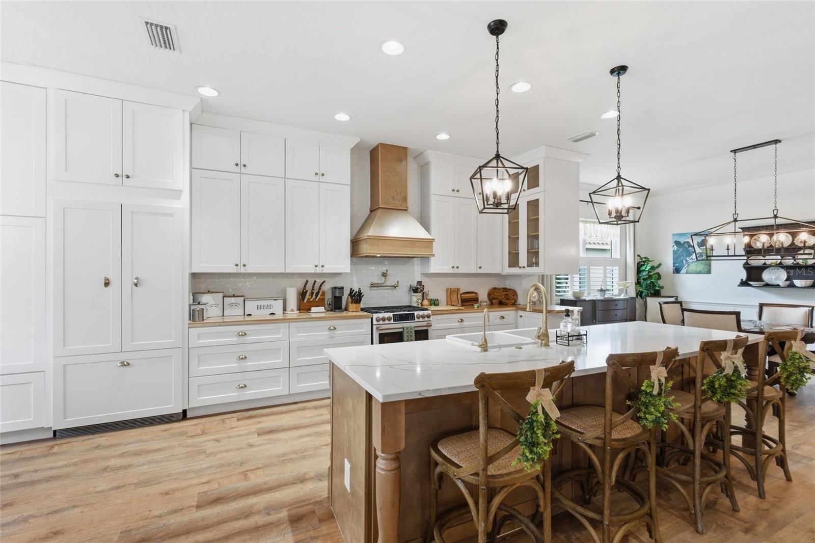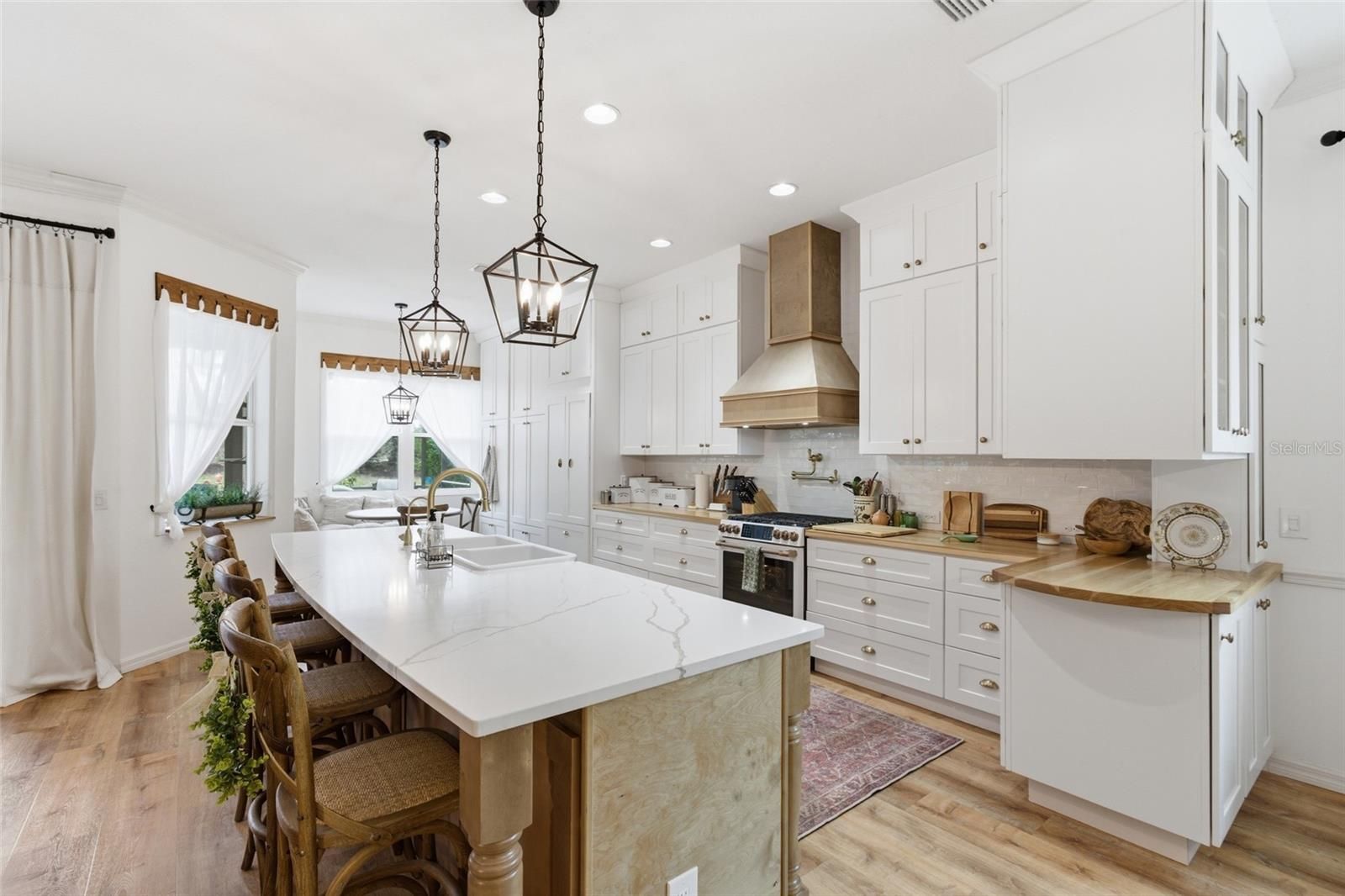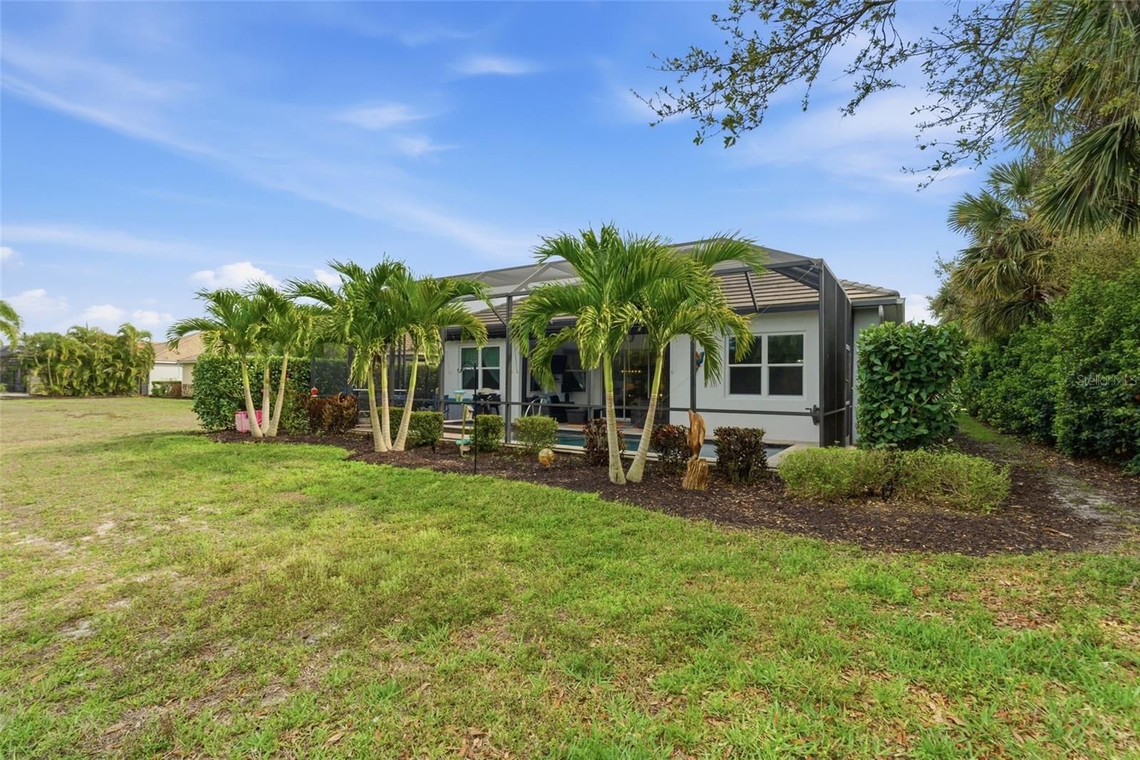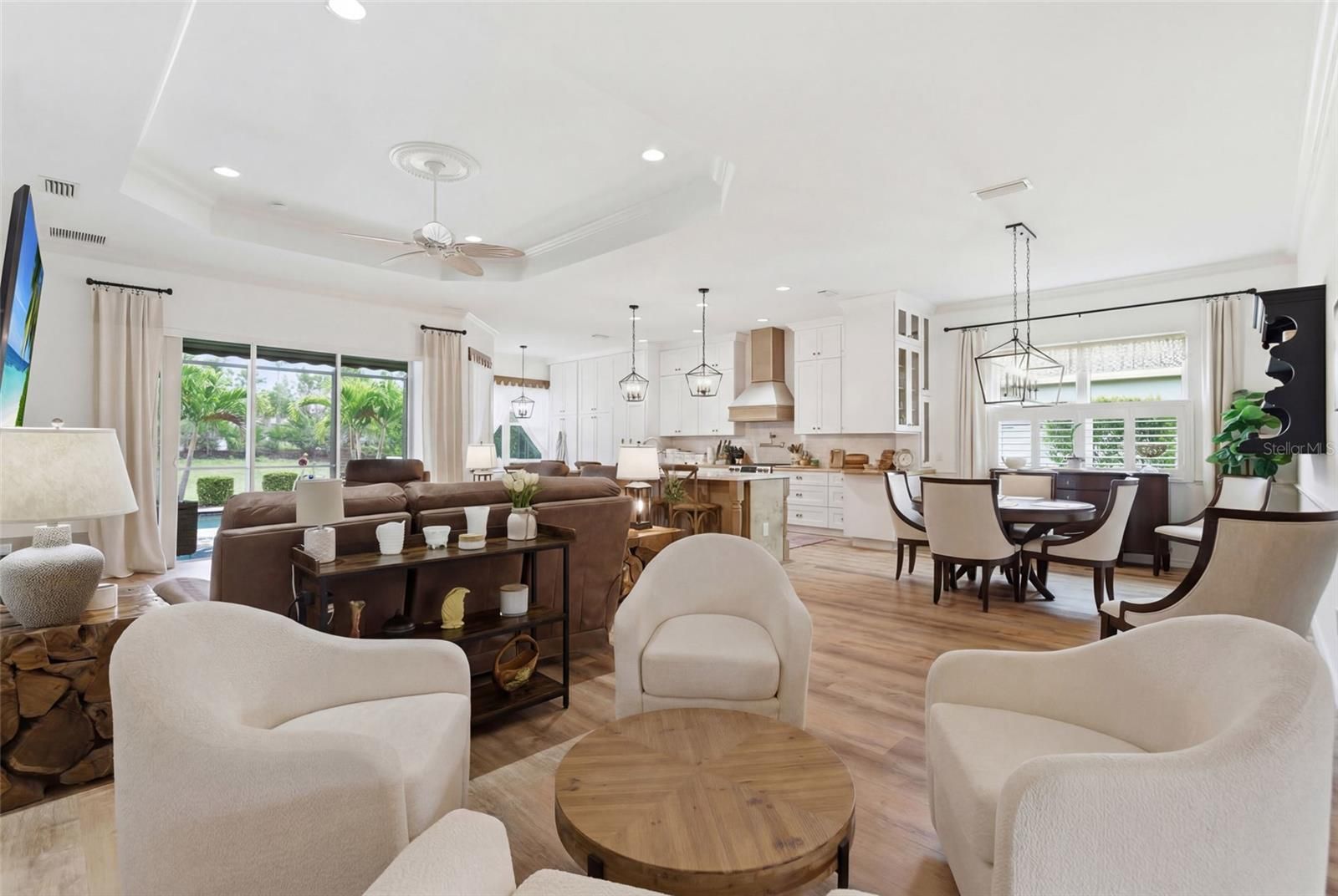 Tucked inside the gates of Boca Royale, this exceptional residence showcases modern elegance, thoughtful design, and a refined sense of luxury at every turn. From the moment you enter, the home reveals a bright and expansive layout accented by soaring tray ceilings, rich wood flooring, and an effortless flow that feels both sophisticated and inviting. The kitchen is a true showpiece, designed with both beauty and performance in mind. A striking quartz island anchors the space, complemented by warm butcher block countertops that add depth and character. Features include a farmhouse sink, gas range with pot filler, extensive cabinetry and pantry storage, and a seamlessly integrated hidden refrigerator that preserves the clean architectural aesthetic. Every detail has been carefully curated to create a space worthy of a chef while remaining ideal for both everyday living and elevated entertaining. The living area opens seamlessly through sliding glass doors to a private outdoor retreat. The screened lanai reveals a resort-style pool and spa overlooking lush, tranquil greenspace, creating a serene and private setting perfect for quiet relaxation or hosting guests in style. Retractable awnings provide an added layer of comfort and shade, allowing you to enjoy the outdoor space throughout the day. The primary suite offers a peaceful escape with tray ceilings, generous proportions, and a custom barn door leading into the spa-inspired bath. Dual vanities, a spacious walk-in shower, and an expansive walk-in closet complete the suite with both comfort and refined design. Two additional bedrooms provide flexibility for guests or family, including one featuring a built-in Murphy bed. A private office with elegant French doors creates a refined and quiet space ideal for working from home, reading, or pursuing creative interests. Positioned on a desirable corner lot, the property enjoys added privacy and a distinguished presence within the community. Additional features that will make you feel right at home include the hurricane windows, generator and whole house water filtration system. Life within Boca Royale Golf and Country Club is defined by elegance, connection, and resort-style living. Centered around a beautifully restored Georgian-style clubhouse, the community offers an elevated social experience with both fine and casual dining, a vibrant calendar of events, and welcoming gathering spaces. Residents enjoy a championship 18 hole golf course set among lush natural surroundings, along with a full practice facility including a driving range and putting green. Har Tru clay tennis courts and lighted pickleball courts provide exceptional racquet amenities, while a resort style pool, fitness center, scenic walking paths, and a dedicated dog park further enhance the lifestyle. Located just minutes from the Gulf beaches of Manasota Key and near Wellen Park, Boca Royale offers a rare balance of privacy, recreation, and coastal convenience. Elegant, inviting, and impeccably designed, this residence delivers a level of comfort and sophistication that defines the very best of Florida living.