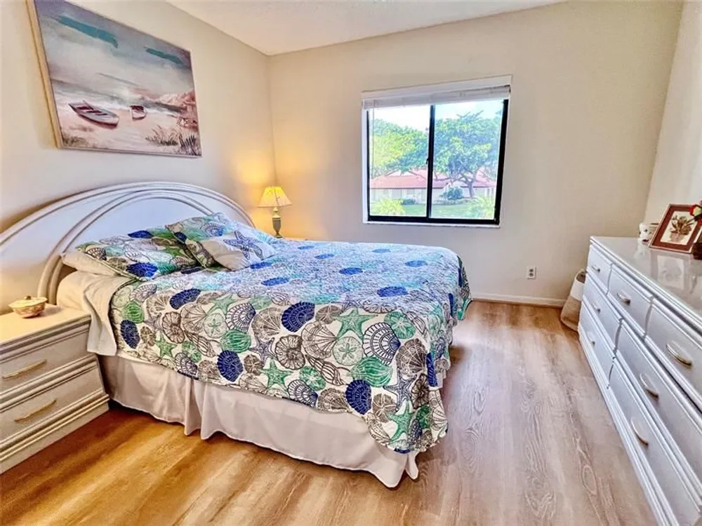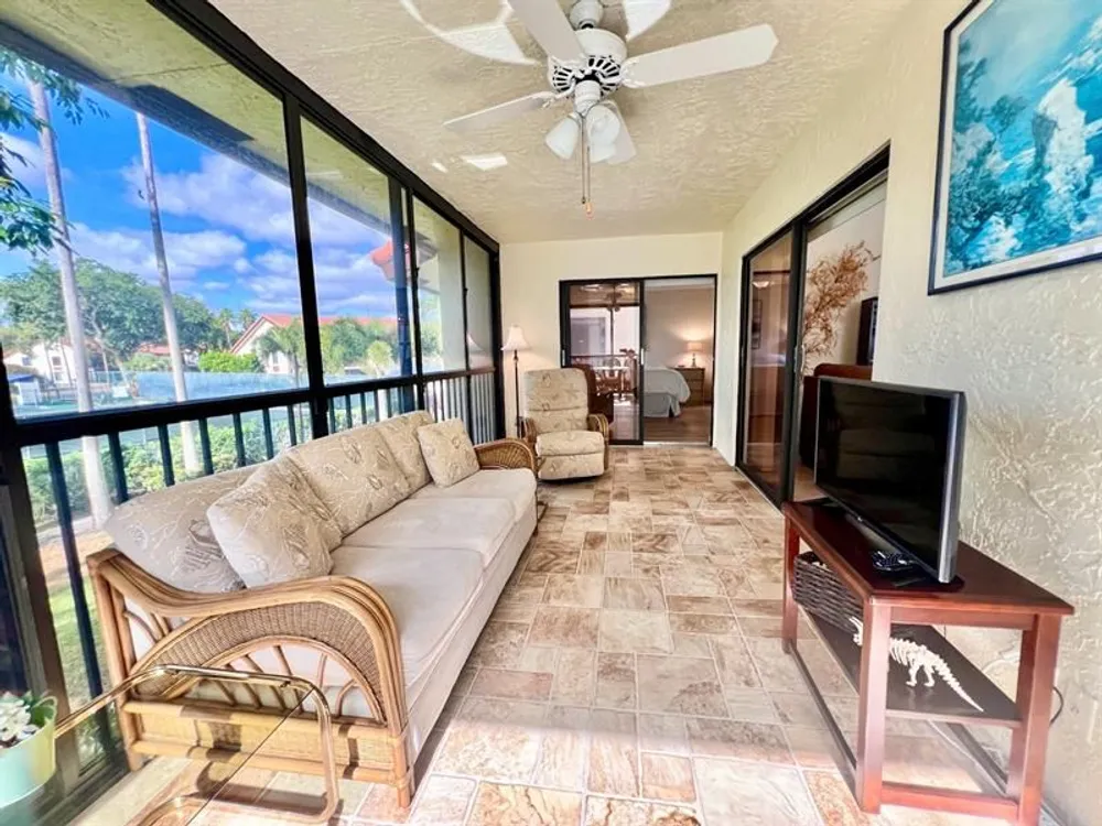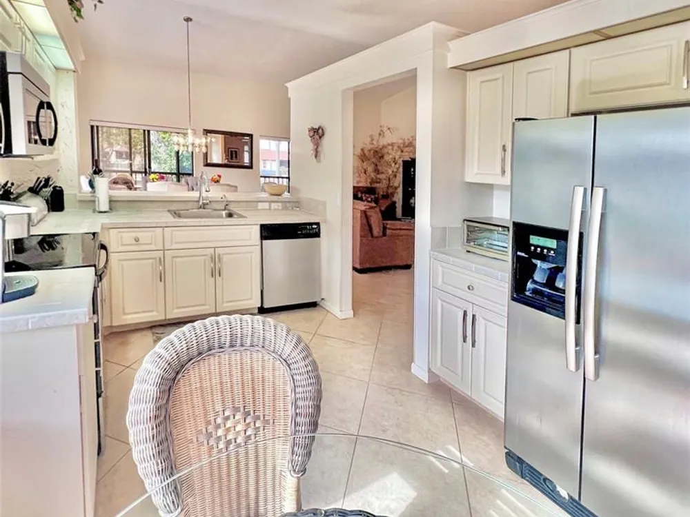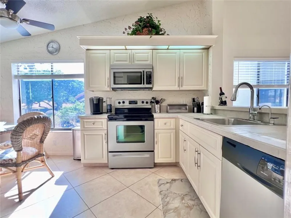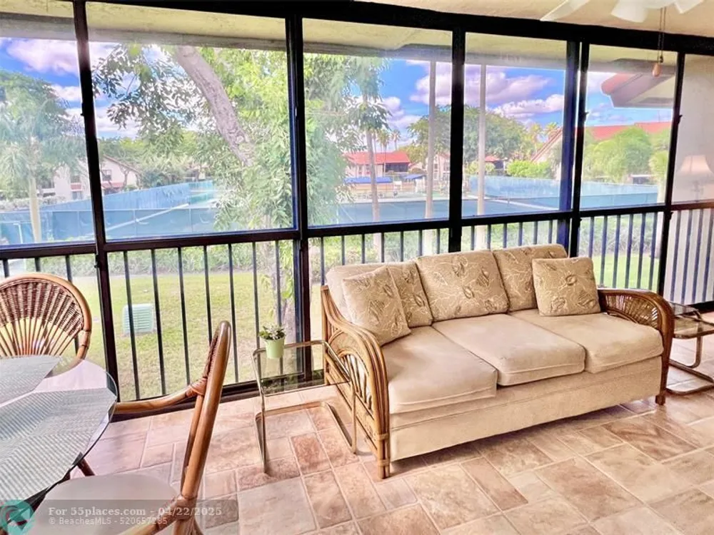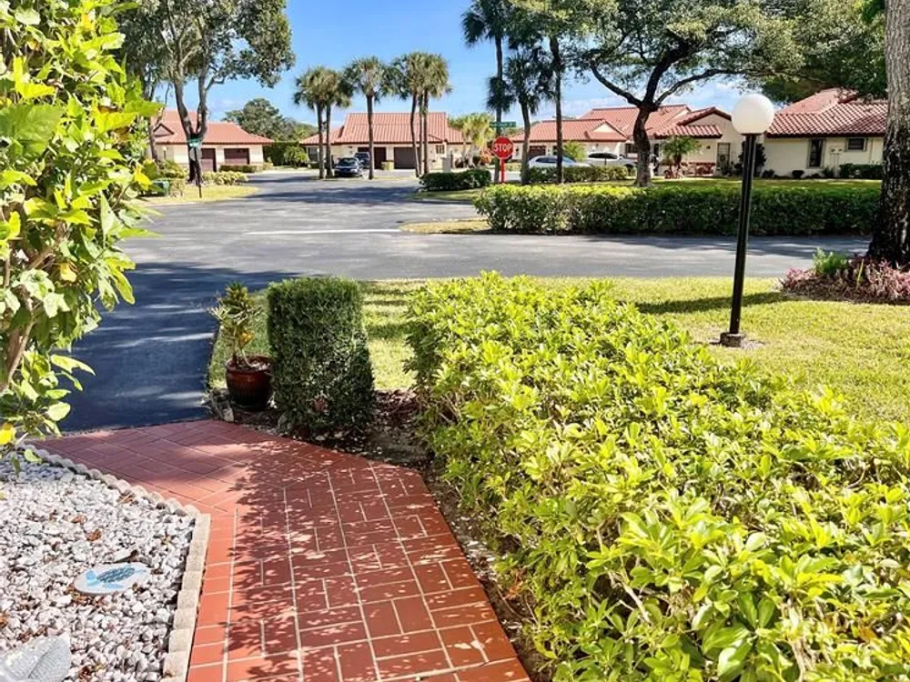 What a Welcoming Condo! 2-Bedroom, 2-Bath plus a Den. Bright & Open Concept with Vaulted Ceilings & many upgrades throughout. Kitchen boasts an abundance of White Cabinetry including Pantry and Stainless Steel Appliances. Master Retreat includes Walk-in Closet & Gorgeous Walk-in Shower. Sliders lead to your Spacious Enclosed Patio with Private Peaceful Views with a perfect peak at the lake. Washer/Dryer inside unit. Palm Chase is a Desirable 55+ Active Community Nestled Behind a Church & Seminary with a quarter-mile Drive to the Gate. Many Activities along with Temperature-Controlled Pool (Heated and Cooled!) Including Billiards, Card Games, Fitness Rooms, Ping Pong, Pickleball, Bocce & Tennis. Maintenance Fee includes Roof Repairs/Replacement, Fiber-optic Cable/Internet, Insurance & More!