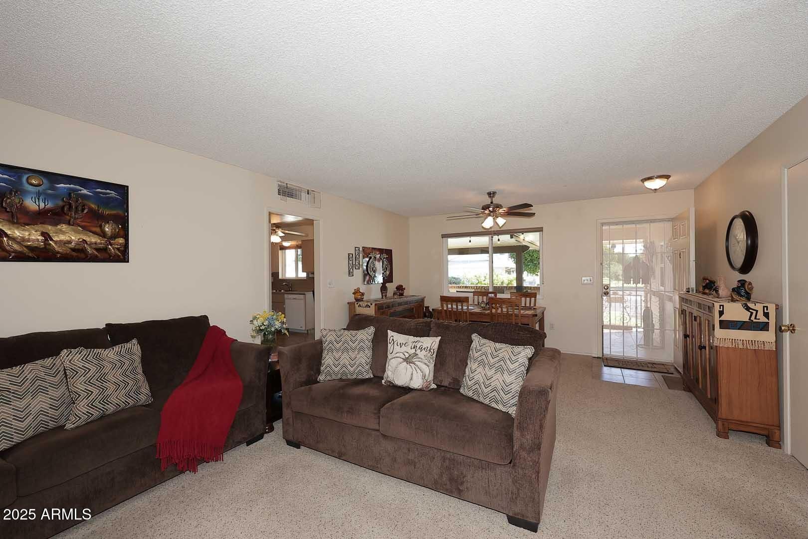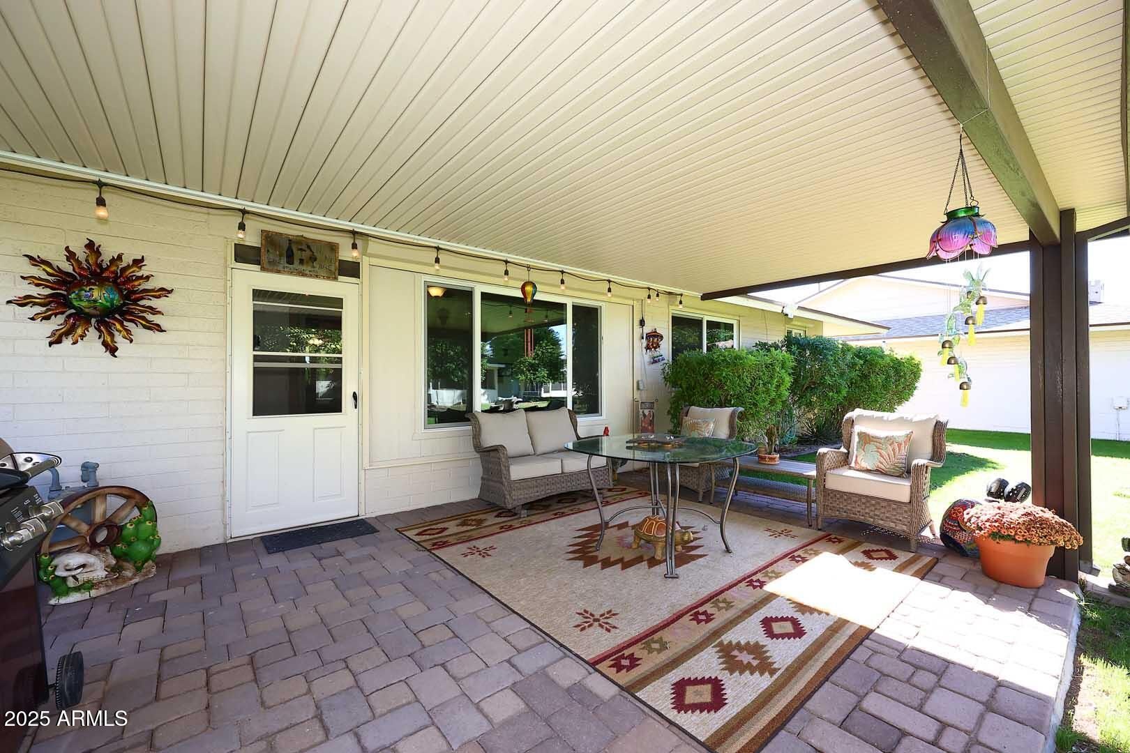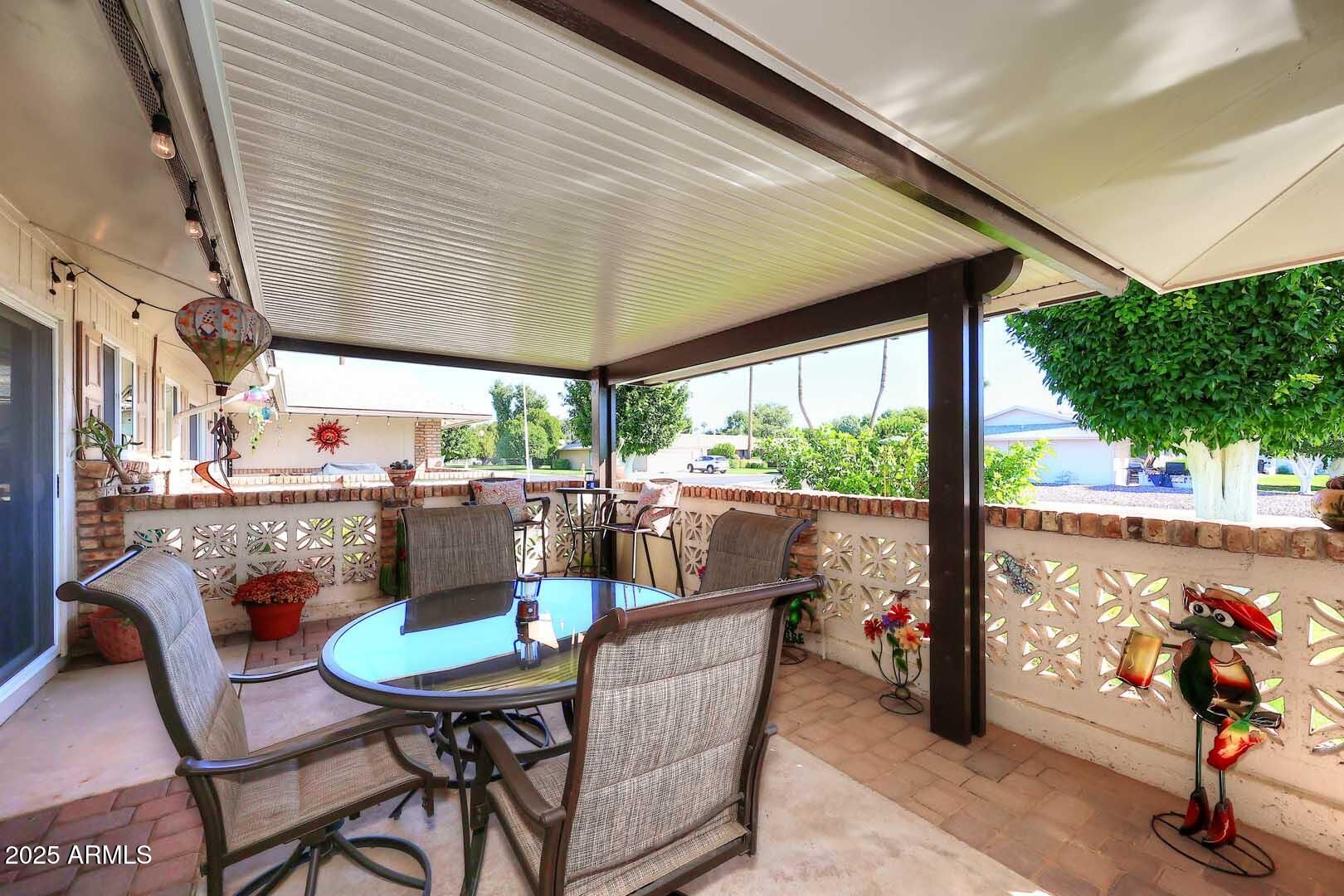 LET'S BEGIN WITH NEARLY $80,000 IN UPGRADES AND UPDATES! PLEASE SEE PHOTOS FOR DETAILED LIST. Warm & inviting best describes this beautifully maintained 2-bedroom, 1.75-bath home ideally located near the Mountain View and Fairway Recreation Centers. Lovingly cared for by the current owners for nearly a decade, this residence showcases pride of ownership throughout. Upon arrival, you'll be welcomed by a charming and private courtyard featuring an Alumawood® pergola-perfect for staying cool and shaded year-round. The paver patio offers an ideal space for relaxing or entertaining neighbors and friends. Inside, the open concept great room seamlessly combines the living and dining areas, creating a comfortable and spacious setting. (Please push ''more'' for additional details.) Large windows invite in natural light and capture views of the lush, park-like greenbelt--bringing the outdoors in. The desirable split-bedroom floor plan ensures privacy for both you and your guests. Visitors will appreciate their own private bath and comfortable accommodations. Start your morning with a fresh cup of joe in the inviting eat-in kitchen before stepping through the patio door to the front courtyard, where you can enjoy a peaceful sunrise or relax with a good book. In the evenings, unwind with a glass of wine in the fully enclosed Arizona room - your own private retreat after a long day. When the weather is perfect, move outside to your private paver patio, complete with an Alumawood® pergola - ideal for entertaining guests or simply taking in the tranquil, park-like surroundings. Lets not forget about the spacious utility/flex room offers endless possibilities - perfect for a home office, craft space or hobby room. Hey guys the two-car garage provides ample space for your classic car, additional storage or your favorite outdoor toys. This home is an excellent choice for snowbirds seeking a convenient lock-and-leave lifestyle. With professionally maintained landscaping, you can enjoy all the beauty without the upkeep. Whether you're home or away, automatic roll-down security shutters ensure peace, privacy, and protection at the touch of a button. Perfect as either a seasonal retreat or a year-round Arizona residence, this home offers everything you need to enjoy desert living at its finest. Come see for yourself what makes it so special!