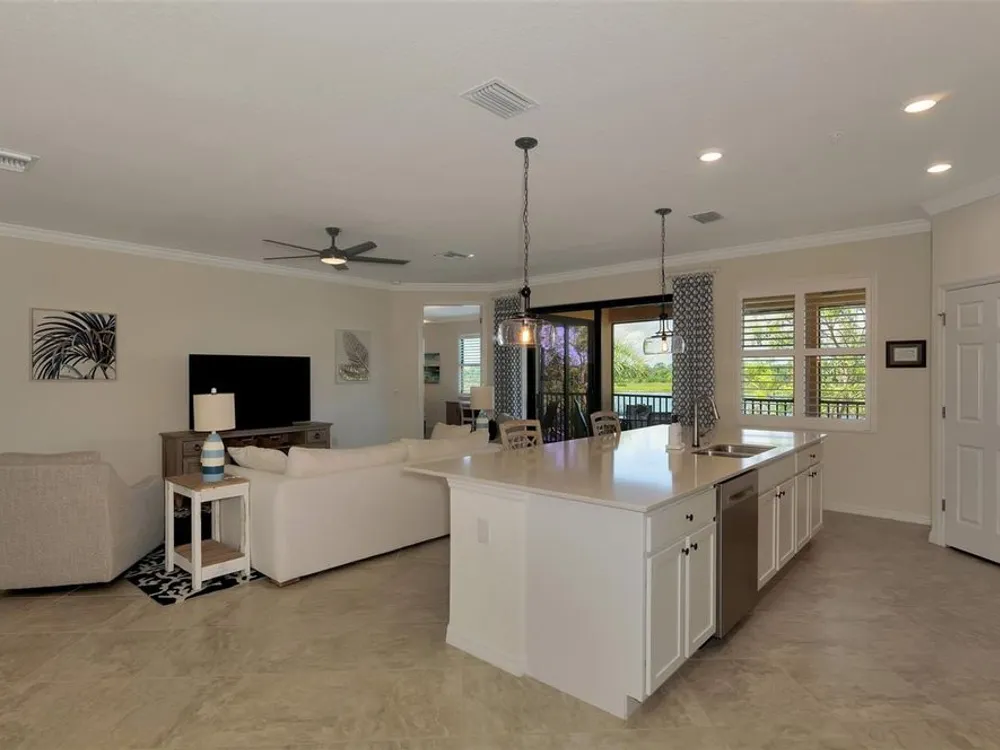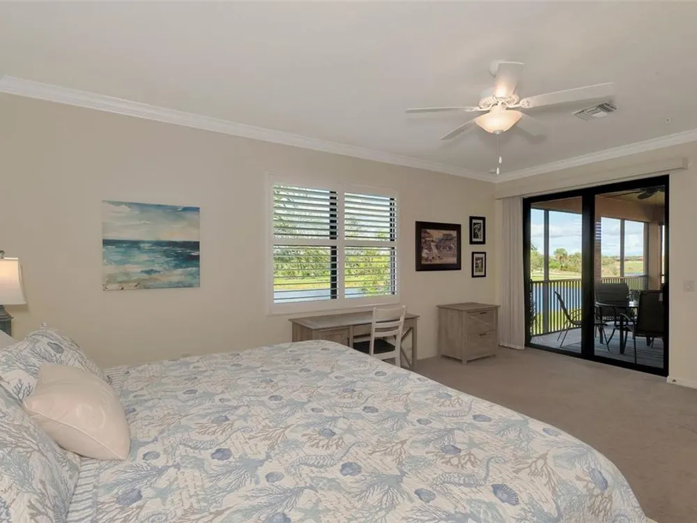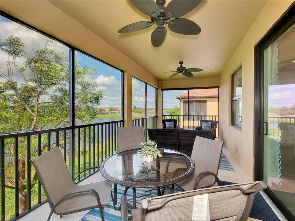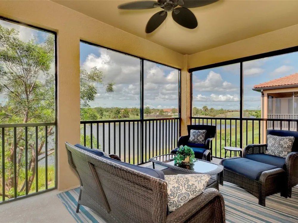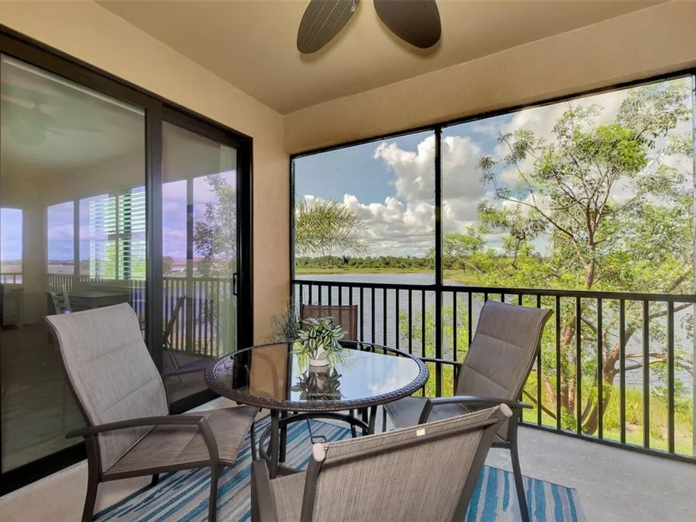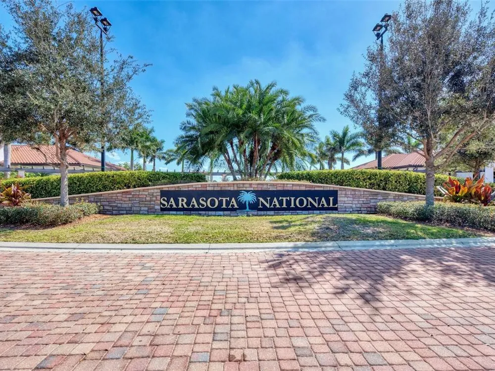 SELLER OFFERING $2500 TOWARDS ONE-TIME CAPITAL CONTRIBUTION! Live in this beautiful TOP FLOOR END UNIT condo, located in the highly sought after guard gated community of Sarasota National. Enjoy SOUTH FACING water, preserve, and golf course views stretching in all directions that will bring you hours of peace and enjoyment right from the comfort of your oversized screened lanai with custom sun shade. Boasting a grand 2-story foyer entrance, this condo is flooded with light and has an open concept floor plan featuring 3 bedrooms and 2 bathrooms, as well as a 2 car garage with a 3rd tandem. From the moment you walk through the decorative lead glass front door, you will notice upgrades such as tile on the diagonal and decorative crown moldings that run throughout all of the main living areas, as well as custom plantation shutters and custom drapery in the living room. The kitchen is a chef's dream that features white shaker style cabinets, beautiful quartz countertops, and an upgraded stainless steel appliance package with new Bosch dishwasher, LG refrigerator, and upgraded Delta faucet. Enjoy stunning views while you prepare a fantastic meal that is easily served buffet style on the oversized island. The pantry has custom built-ins by Closet-Tec and the oversized dining area showcases a beautiful chandelier. The entire space is filled with light thanks to large windows throughout and oversized sliders that all feature the highest rated HURRICANE IMPACT GLASS! The primary suite is huge on space with room to create a home office or extra sitting area. Large sliders lead out to the lanai, and a huge window will allow you to enjoy the stunning views from every angle. 2 walk-in closets give you ample space and you will enjoy more custom built-ins by Closet-Tec. The en suite bathroom showcases dual vanities with tons of storage, an oversized walk-in shower with seamless glass enclosure, and a separate water closet. Across the condo you will find 2 additional bedrooms that are generous in size, and a large full bathroom that features a tub/shower combo. With a pocket door at the end of the hall, it is easy to create privacy for guests from the main living areas of the home. There is an in-unit laundry room with upgraded stackable washer and dryer, freeing up space for extra storage. This building is completely maintenance free and includes all landscaping maintenance, pest control, cable tv, water, sewer, and trash pick up. Your monthly HOA fee also includes 2 GOLF MEMBERSHIPS that require no extra buy-in fee! This condo is perfect to use as a full time residence, a part-time seasonal home, or even a great investment... one that will generate substantial rental income! Live like you are on a 5-star vacation with a 30,000sf clubhouse with resort style pool, hot tub, outdoor tiki bar serving food and drinks daily, a coffee house, fine dining restaurant, 7,000sf fitness center with top-of-the-line equipment and classes, day spa, card room, bocce ball, pickle ball, tennis, dog park, playground, event lawn, and 18-hole championship golf course. Sarasota National is a guard gated 2400-acre International Audubon Bird Sanctuary that offers some of the most beautiful water and preserve views in all of Venice. This home is just minutes to the new Atlanta Brave's spring training camp at the CoolToday Park Stadium, as well as the town center of Wellen Park. Explore 3 local beaches and historic downtown Venice, all less than 15 minutes from your front door!