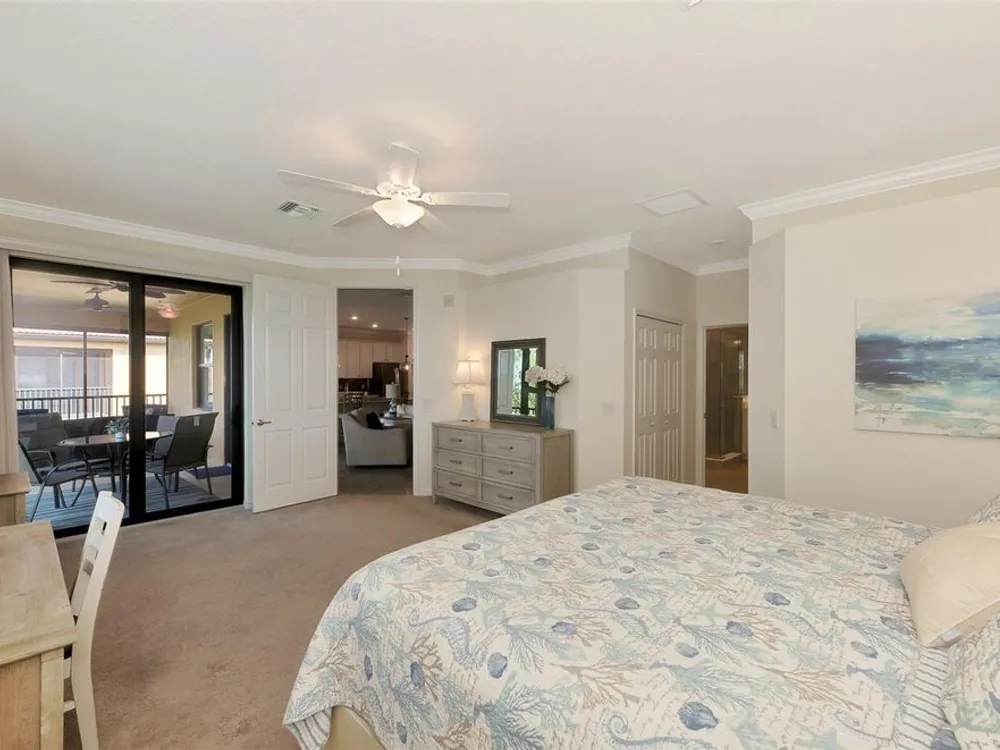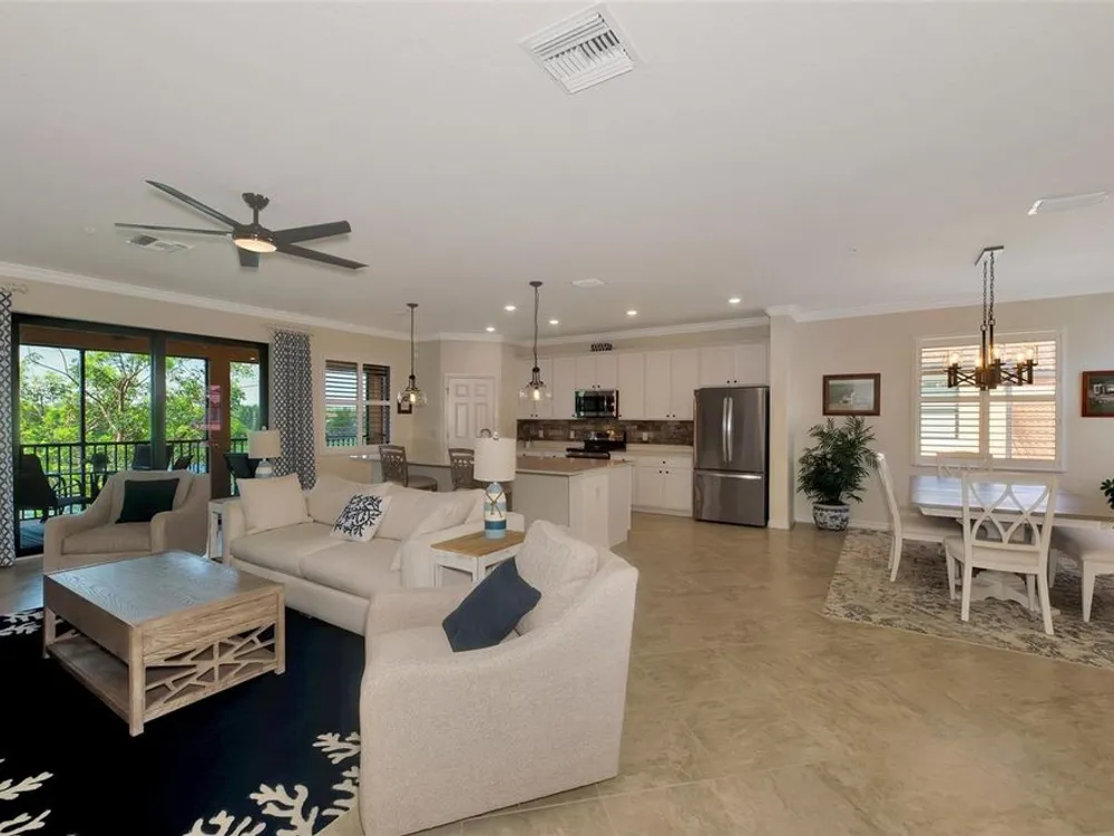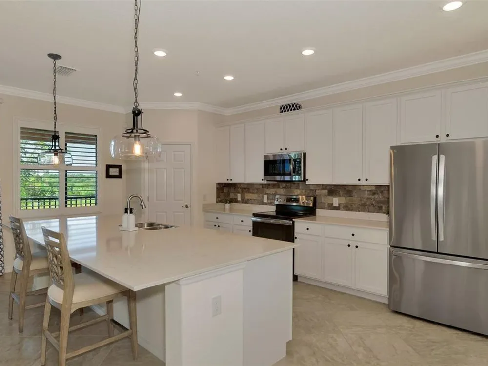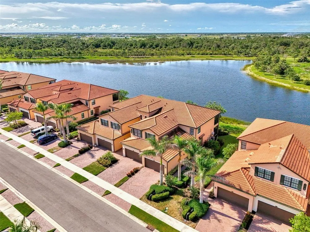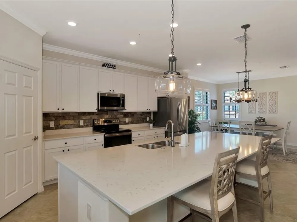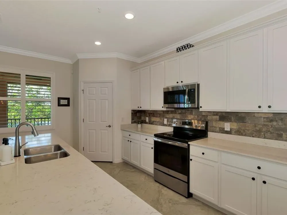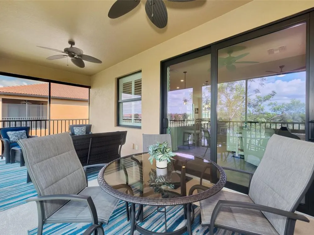 SELLER OFFERING $2500 TOWARDS ONE-TIME CAPITAL CONTRIBUTION! Live in this beautiful TOP FLOOR END UNIT condo, located in the highly sought after guard gated community of Sarasota National. Enjoy SOUTH FACING water, preserve, and golf course views stretching in all directions that will bring you hours of peace and enjoyment right from the comfort of your oversized screened lanai with custom sun shade. Boasting a grand 2-story foyer entrance, this condo is flooded with light and has an open concept floor plan featuring 3 bedrooms and 2 bathrooms, as well as a 2 car garage with a 3rd tandem. From the moment you walk through the decorative lead glass front door, you will notice upgrades such as tile on the diagonal and decorative crown moldings that run throughout all of the main living areas, as well as custom plantation shutters and custom drapery in the living room. The kitchen is a chef's dream that features white shaker style cabinets, beautiful quartz countertops, and an upgraded stainless steel appliance package with new Bosch dishwasher, LG refrigerator, and upgraded Delta faucet. Enjoy stunning views while you prepare a fantastic meal that is easily served buffet style on the oversized island. The pantry has custom built-ins by Closet-Tec and the oversized dining area showcases a beautiful chandelier. The entire space is filled with light thanks to large windows throughout and oversized sliders that all feature the highest rated HURRICANE IMPACT GLASS! The primary suite is huge on space with room to create a home office or extra sitting area. Large sliders lead out to the lanai, and a huge window will allow you to enjoy the stunning views from every angle. 2 walk-in closets give you ample space and you will enjoy more custom built-ins by Closet-Tec. The en suite bathroom showcases dual vanities with tons of storage, an oversized walk-in shower with seamless glass enclosure, and a separate water closet. Across the condo you will find 2 additional bedrooms that are generous in size, and a large full bathroom that features a tub/shower combo. With a pocket door at the end of the hall, it is easy to create privacy for guests from the main living areas of the home. There is an in-unit laundry room with upgraded stackable washer and dryer, freeing up space for extra storage. This building is completely maintenance free and includes all landscaping maintenance, pest control, cable tv, water, sewer, and trash pick up. Your monthly HOA fee also includes 2 GOLF MEMBERSHIPS that require no extra buy-in fee! This condo is perfect to use as a full time residence, a part-time seasonal home, or even a great investment... one that will generate substantial rental income! Live like you are on a 5-star vacation with a 30,000sf clubhouse with resort style pool, hot tub, outdoor tiki bar serving food and drinks daily, a coffee house, fine dining restaurant, 7,000sf fitness center with top-of-the-line equipment and classes, day spa, card room, bocce ball, pickle ball, tennis, dog park, playground, event lawn, and 18-hole championship golf course. Sarasota National is a guard gated 2400-acre International Audubon Bird Sanctuary that offers some of the most beautiful water and preserve views in all of Venice. This home is just minutes to the new Atlanta Brave's spring training camp at the CoolToday Park Stadium, as well as the town center of Wellen Park. Explore 3 local beaches and historic downtown Venice, all less than 15 minutes from your front door!