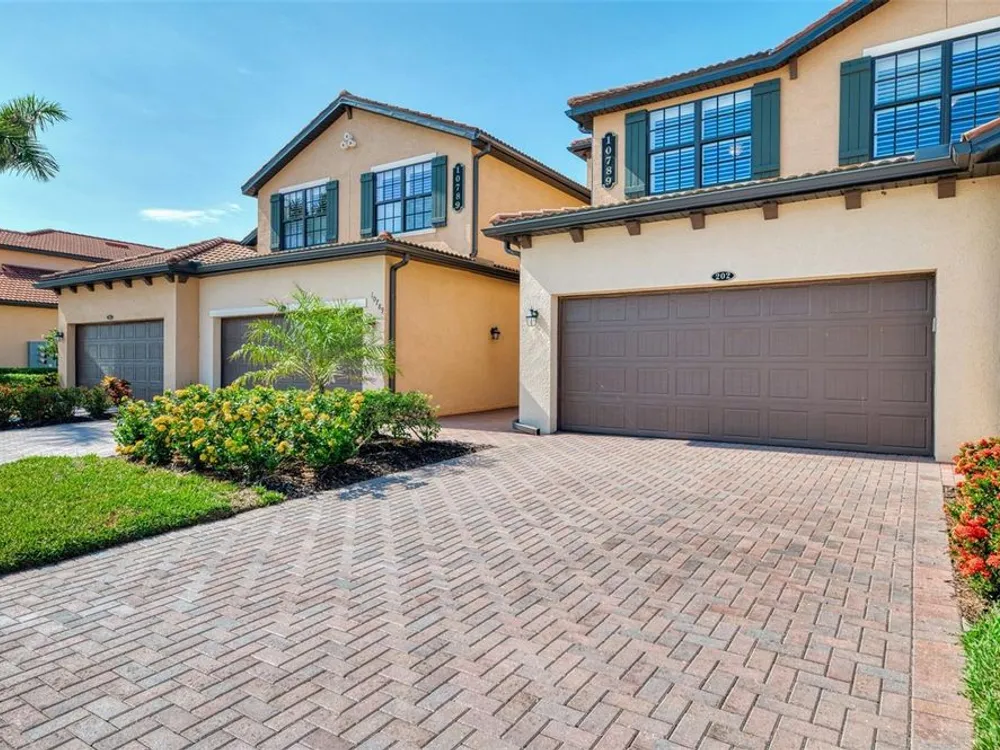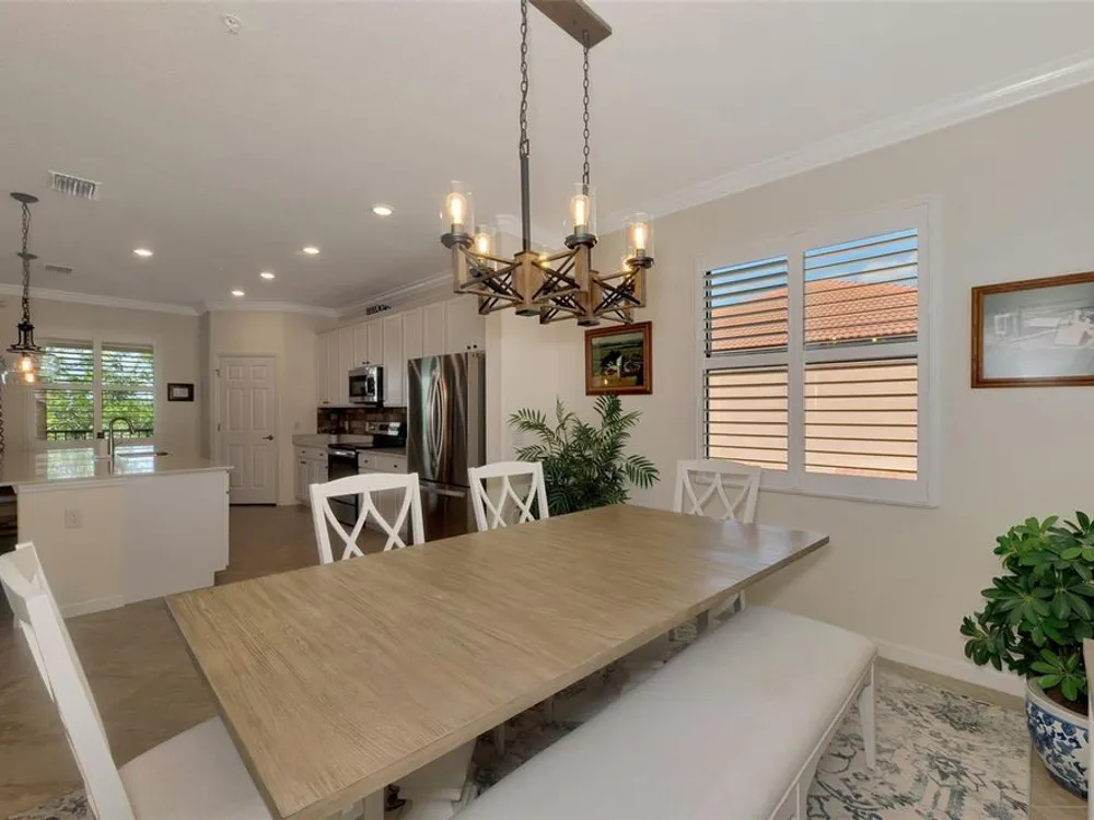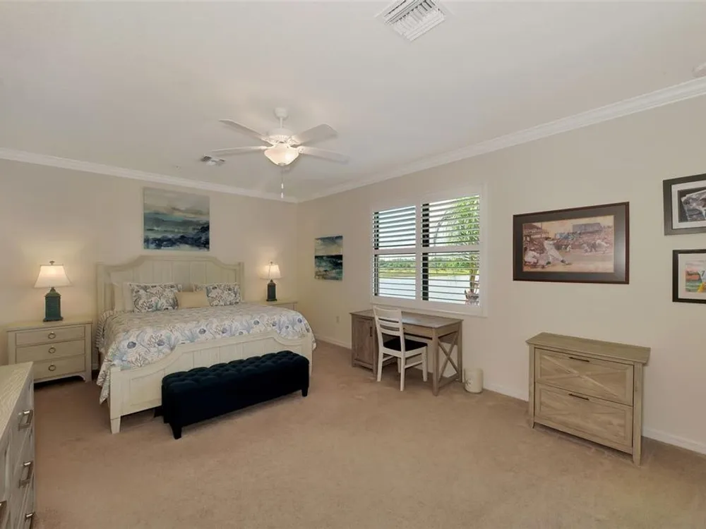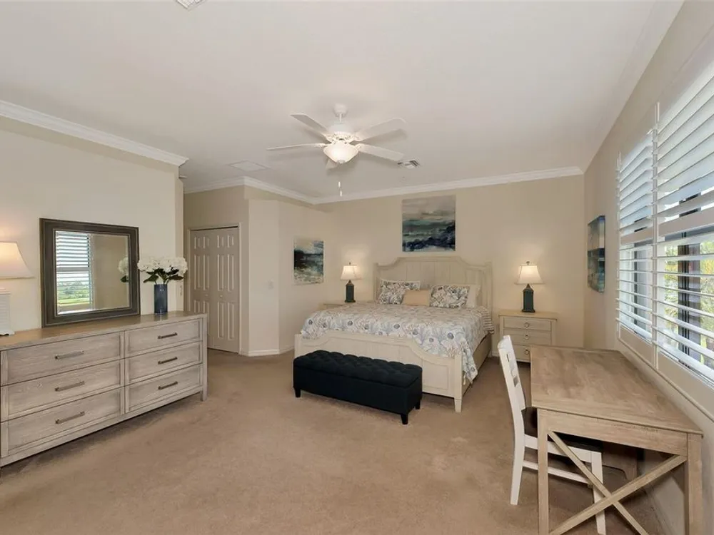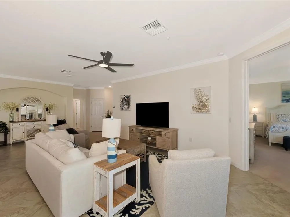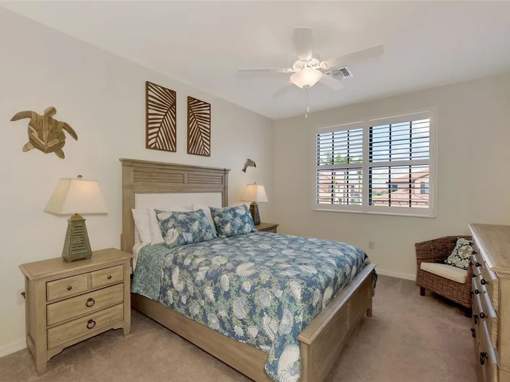 SELLER OFFERING $2500 TOWARDS ONE-TIME CAPITAL CONTRIBUTION! Live in this beautiful TOP FLOOR END UNIT condo, located in the highly sought after guard gated community of Sarasota National. Enjoy SOUTH FACING water, preserve, and golf course views stretching in all directions that will bring you hours of peace and enjoyment right from the comfort of your oversized screened lanai with custom sun shade. Boasting a grand 2-story foyer entrance, this condo is flooded with light and has an open concept floor plan featuring 3 bedrooms and 2 bathrooms, as well as a 2 car garage with a 3rd tandem. From the moment you walk through the decorative lead glass front door, you will notice upgrades such as tile on the diagonal and decorative crown moldings that run throughout all of the main living areas, as well as custom plantation shutters and custom drapery in the living room. The kitchen is a chef's dream that features white shaker style cabinets, beautiful quartz countertops, and an upgraded stainless steel appliance package with new Bosch dishwasher, LG refrigerator, and upgraded Delta faucet. Enjoy stunning views while you prepare a fantastic meal that is easily served buffet style on the oversized island. The pantry has custom built-ins by Closet-Tec and the oversized dining area showcases a beautiful chandelier. The entire space is filled with light thanks to large windows throughout and oversized sliders that all feature the highest rated HURRICANE IMPACT GLASS! The primary suite is huge on space with room to create a home office or extra sitting area. Large sliders lead out to the lanai, and a huge window will allow you to enjoy the stunning views from every angle. 2 walk-in closets give you ample space and you will enjoy more custom built-ins by Closet-Tec. The en suite bathroom showcases dual vanities with tons of storage, an oversized walk-in shower with seamless glass enclosure, and a separate water closet. Across the condo you will find 2 additional bedrooms that are generous in size, and a large full bathroom that features a tub/shower combo. With a pocket door at the end of the hall, it is easy to create privacy for guests from the main living areas of the home. There is an in-unit laundry room with upgraded stackable washer and dryer, freeing up space for extra storage. This building is completely maintenance free and includes all landscaping maintenance, pest control, cable tv, water, sewer, and trash pick up. Your monthly HOA fee also includes 2 GOLF MEMBERSHIPS that require no extra buy-in fee! This condo is perfect to use as a full time residence, a part-time seasonal home, or even a great investment... one that will generate substantial rental income! Live like you are on a 5-star vacation with a 30,000sf clubhouse with resort style pool, hot tub, outdoor tiki bar serving food and drinks daily, a coffee house, fine dining restaurant, 7,000sf fitness center with top-of-the-line equipment and classes, day spa, card room, bocce ball, pickle ball, tennis, dog park, playground, event lawn, and 18-hole championship golf course. Sarasota National is a guard gated 2400-acre International Audubon Bird Sanctuary that offers some of the most beautiful water and preserve views in all of Venice. This home is just minutes to the new Atlanta Brave's spring training camp at the CoolToday Park Stadium, as well as the town center of Wellen Park. Explore 3 local beaches and historic downtown Venice, all less than 15 minutes from your front door!