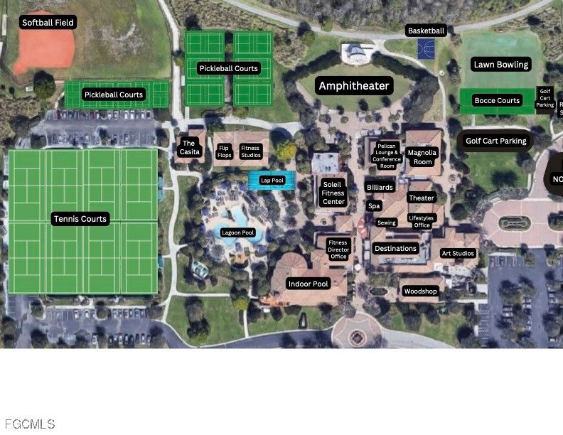 - Includes: Basketball Court, Bocce Court, Billiard Room, Business Center, Clubhouse, Dog Park, Fitness Center, Golf Course, Hobby Room, Library, Media Room, Pier, Pickleball, Pool, Restaurant, Sauna, Spa/Hot Tub, Sidewalks, Tennis Court(s), Trail(s), Management