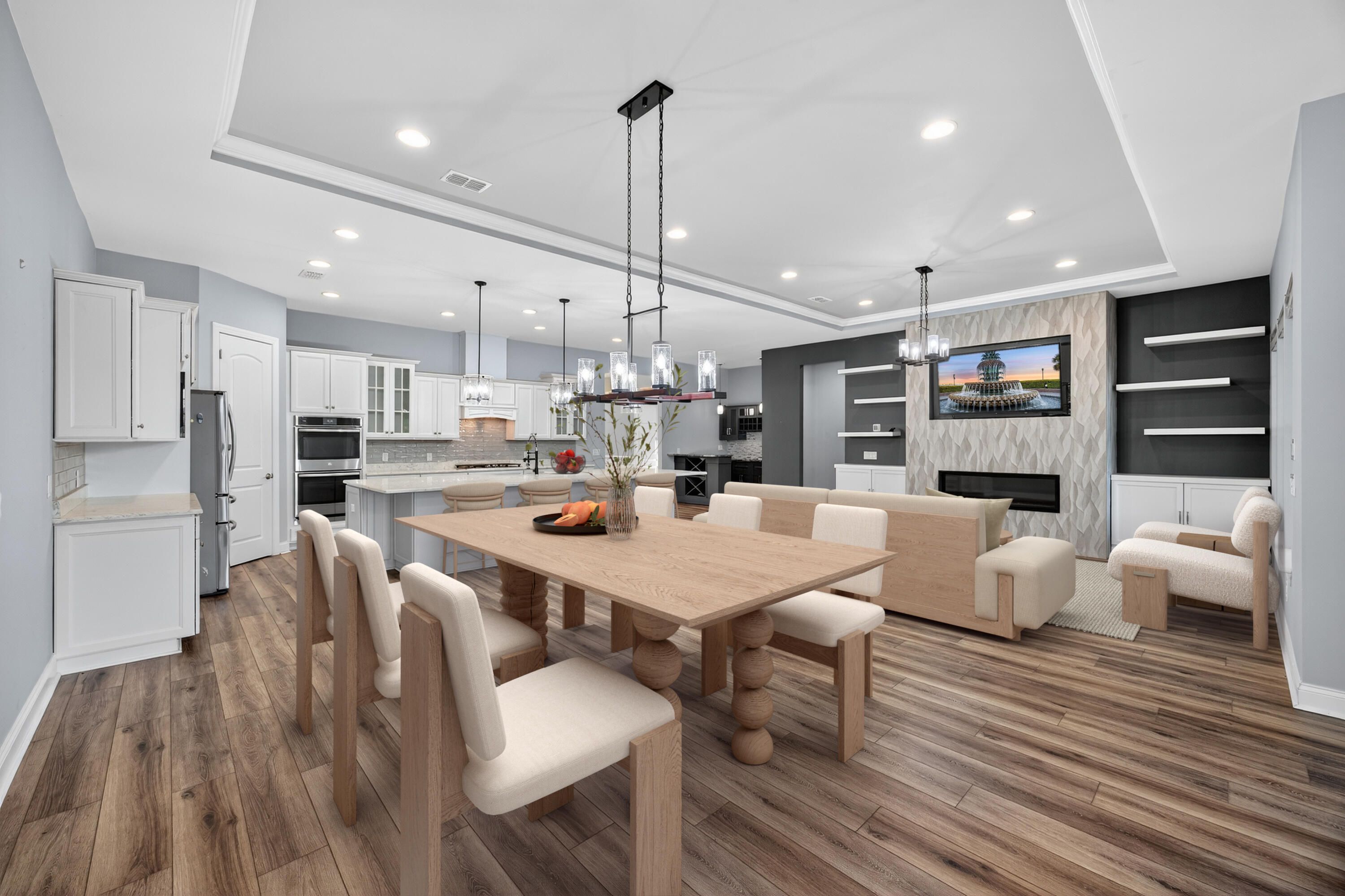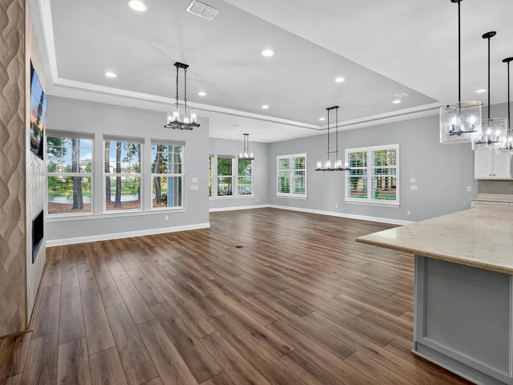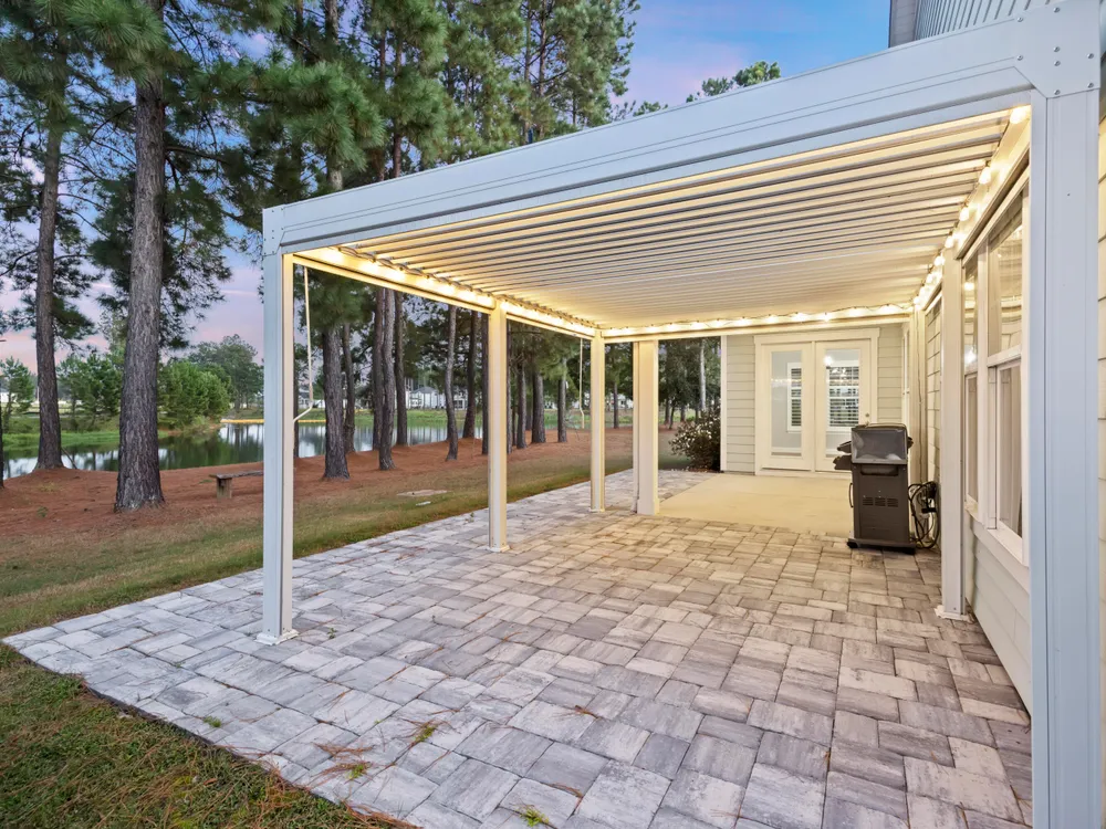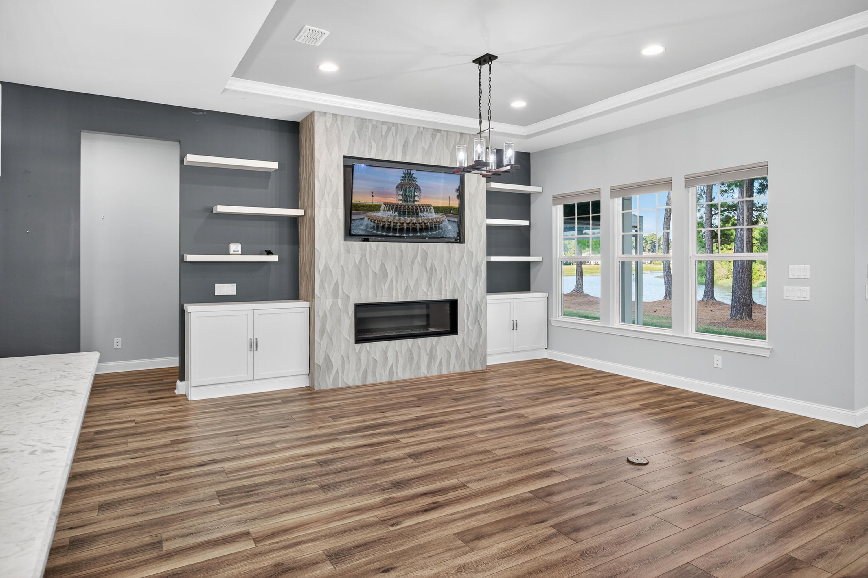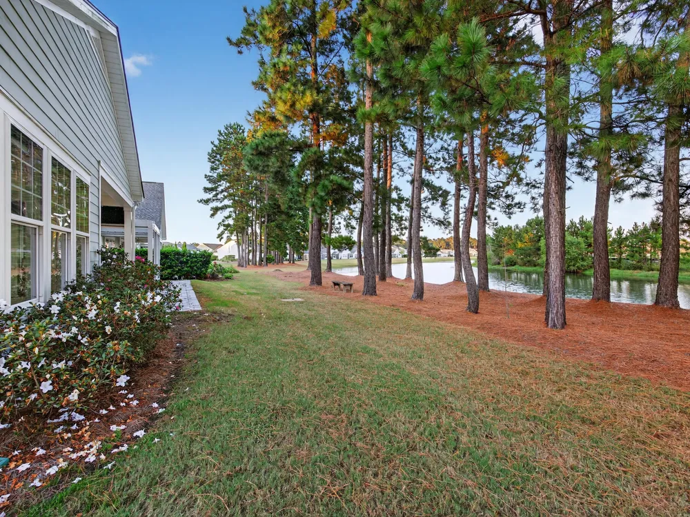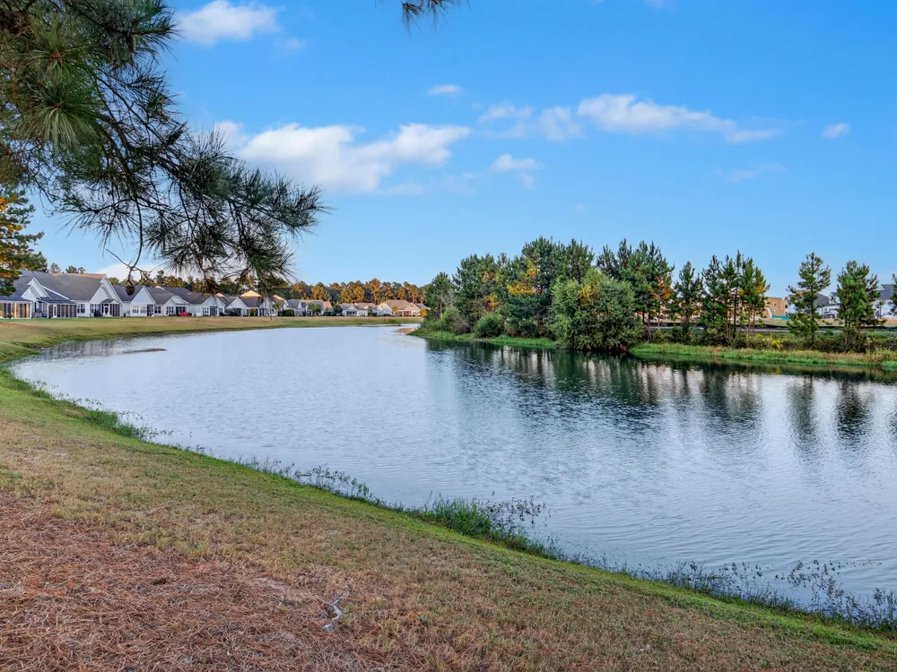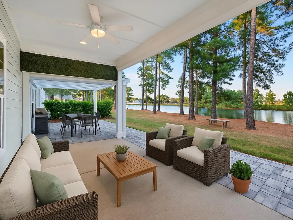 Welcome to 108 Bluff Isle Court, a stunning single-story lakefront home in the sought-after 55+ community of Four Seasons at Lakes of Cane Bay. Thoughtfully designed and *extensively upgraded*, this elegant 3,049 sq. ft. San Sebastian floor plan offers 3 bedrooms, 2.5 baths, and two garages accommodating 3 cars, all situated on a private cul-de-sac with peaceful east-facing views of the water.Step inside and you'll find 10-foot ceilings, tray details with crown molding, and an inviting open-concept layout perfect for entertaining. The gourmet kitchen is a chef's dream, featuring GE Profile appliances, double ovens, a five-burner gas cooktop, quartz countertops, a farmhouse sink, custom soft-close cabinetry, a vented hood, and pendant lighting over the oversized island. The great room centers around a modern, remote-controlled gas fireplace and flows seamlessly into the sunroom, where natural light and lake views fill the space. The owner's suite offers a luxurious retreat with a tray ceiling, spa-style bathroom with a frameless glass shower, soaking tub, soft-close cabinets, upgraded tile, and a custom-built walk-in closet complete with shelving and drawers. Enjoy year-round outdoor living on the extended paver patio, featuring a covered seating area with a ceiling fan, gas line for grilling, and a pergola with lighting overlooking the water. The garages are equipped with digital openers, 220-volt outlets, added lighting, and a mini-split HVAC system in the workshop bay, providing comfort and utility. Every inch of the home reflects careful attention to detailfrom custom blinds and plantation shutters to enhanced insulation and Sherwin-Williams Duration paint throughout. Beyond the home itself, Four Seasons at Lakes of Cane Bay offers one of the Lowcountry's most impressive amenity packages, including resort-style outdoor pools, a heated indoor lap pool and spa, pickleball and tennis courts, bocce, a fitness center, game and billiard rooms, a demonstration kitchen, ballroom, dog park, boat and kayak launch on the community's 300-acre lake, and 24/7 gated security. A full-time lifestyle director curates year-round events, and all lawn care is included, ensuring maintenance-free living at its finest. This home combines luxury finishes, functional upgrades, and a premium lakefront setting to deliver one of the most complete offerings in Four Seasons.