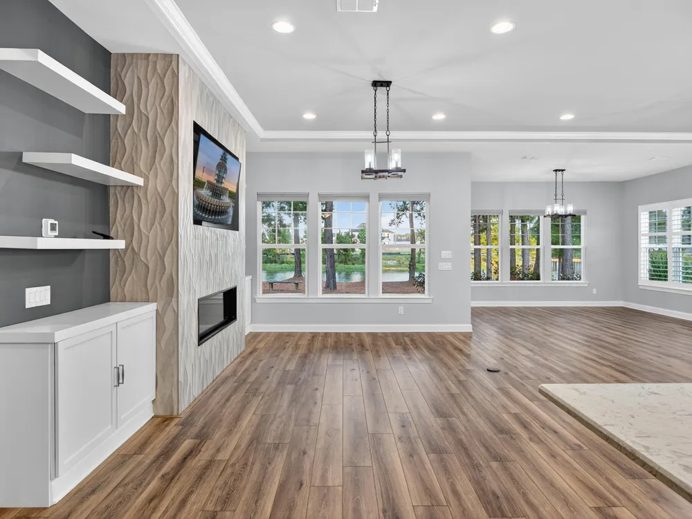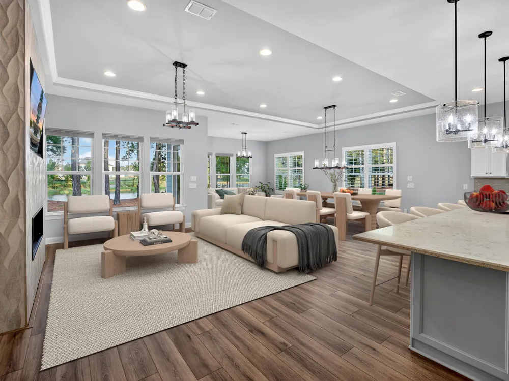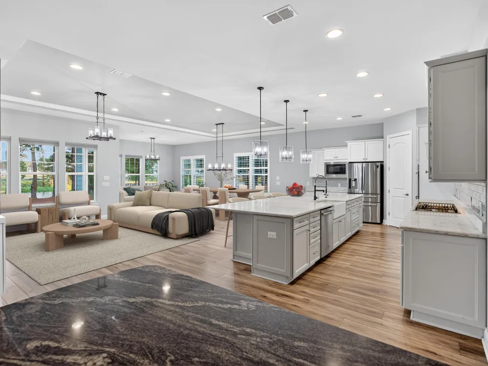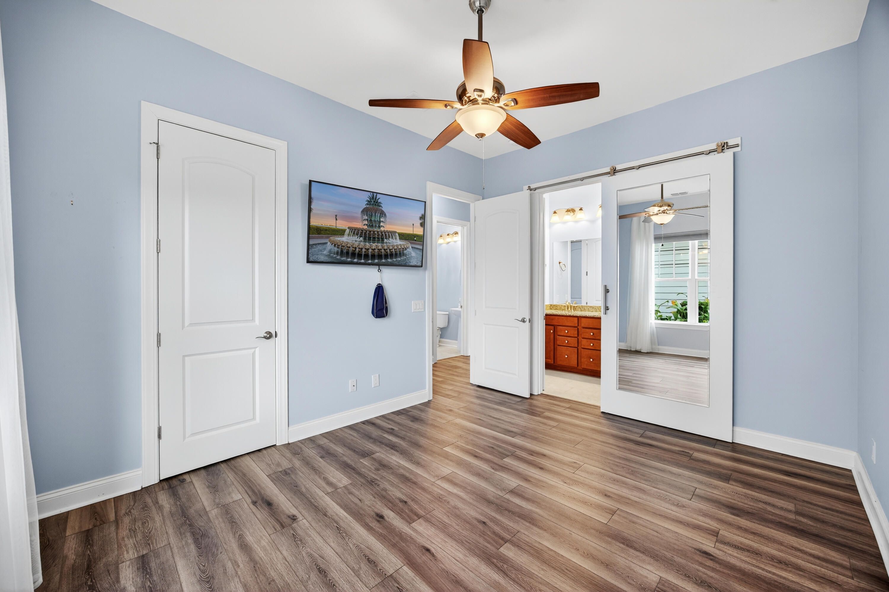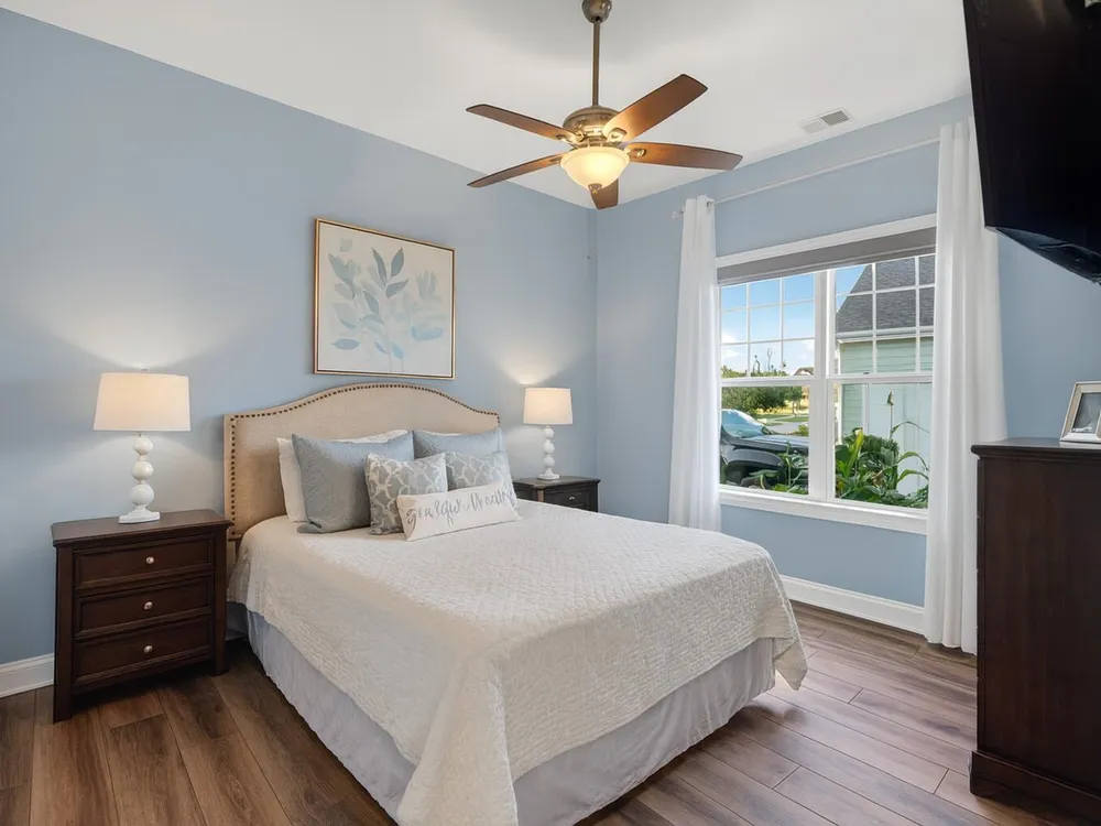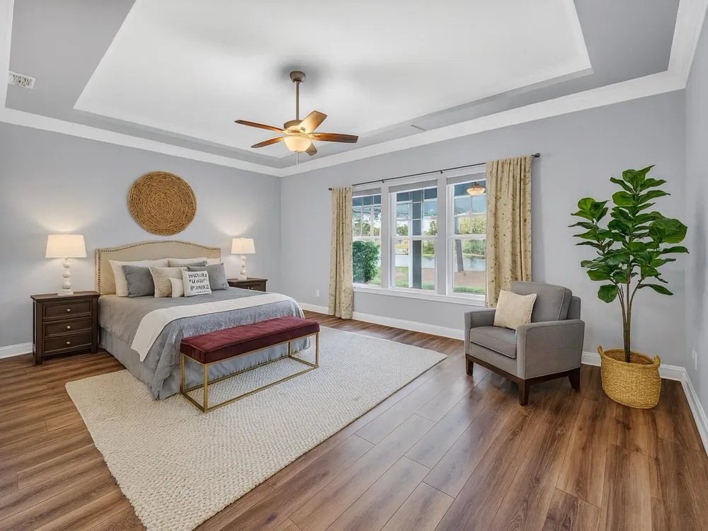 Welcome to 108 Bluff Isle Court, a stunning single-story lakefront home in the sought-after 55+ community of Four Seasons at Lakes of Cane Bay. Thoughtfully designed and *extensively upgraded*, this elegant 3,049 sq. ft. San Sebastian floor plan offers 3 bedrooms, 2.5 baths, and two garages accommodating 3 cars, all situated on a private cul-de-sac with peaceful east-facing views of the water.Step inside and you'll find 10-foot ceilings, tray details with crown molding, and an inviting open-concept layout perfect for entertaining. The gourmet kitchen is a chef's dream, featuring GE Profile appliances, double ovens, a five-burner gas cooktop, quartz countertops, a farmhouse sink, custom soft-close cabinetry, a vented hood, and pendant lighting over the oversized island. The great room centers around a modern, remote-controlled gas fireplace and flows seamlessly into the sunroom, where natural light and lake views fill the space. The owner's suite offers a luxurious retreat with a tray ceiling, spa-style bathroom with a frameless glass shower, soaking tub, soft-close cabinets, upgraded tile, and a custom-built walk-in closet complete with shelving and drawers. Enjoy year-round outdoor living on the extended paver patio, featuring a covered seating area with a ceiling fan, gas line for grilling, and a pergola with lighting overlooking the water. The garages are equipped with digital openers, 220-volt outlets, added lighting, and a mini-split HVAC system in the workshop bay, providing comfort and utility. Every inch of the home reflects careful attention to detailfrom custom blinds and plantation shutters to enhanced insulation and Sherwin-Williams Duration paint throughout. Beyond the home itself, Four Seasons at Lakes of Cane Bay offers one of the Lowcountry's most impressive amenity packages, including resort-style outdoor pools, a heated indoor lap pool and spa, pickleball and tennis courts, bocce, a fitness center, game and billiard rooms, a demonstration kitchen, ballroom, dog park, boat and kayak launch on the community's 300-acre lake, and 24/7 gated security. A full-time lifestyle director curates year-round events, and all lawn care is included, ensuring maintenance-free living at its finest. This home combines luxury finishes, functional upgrades, and a premium lakefront setting to deliver one of the most complete offerings in Four Seasons.
