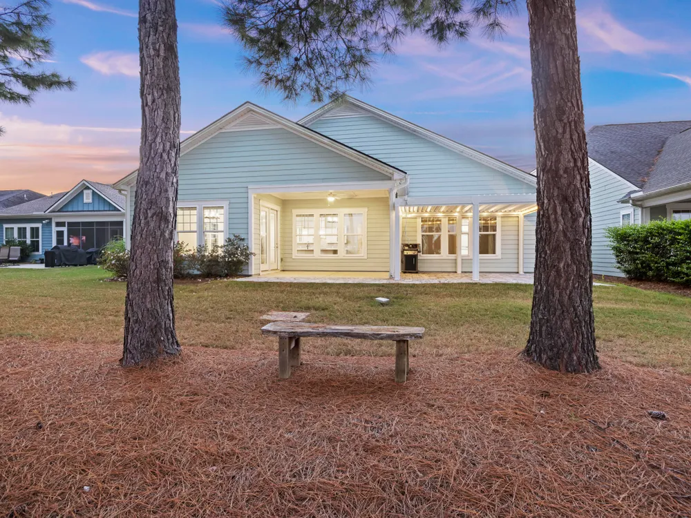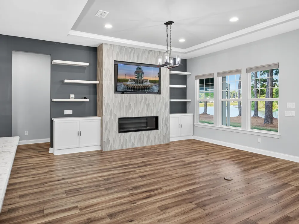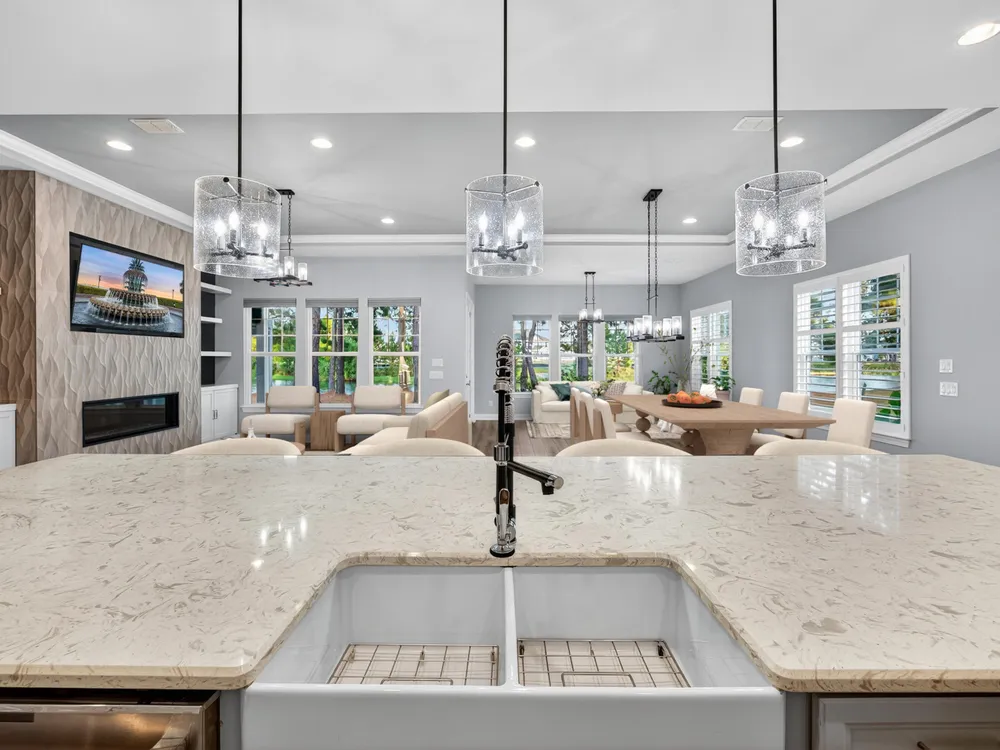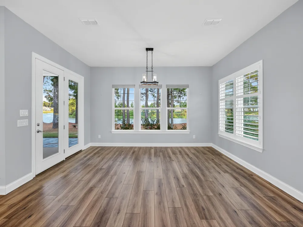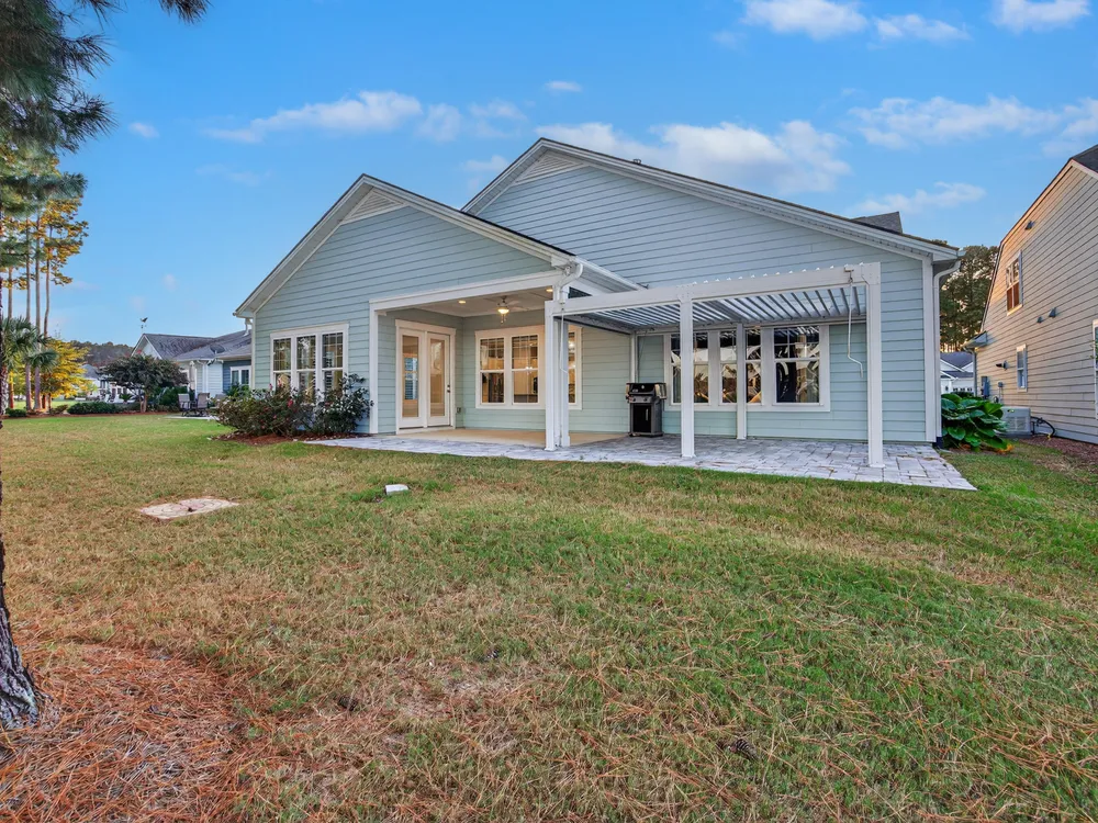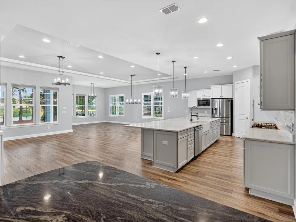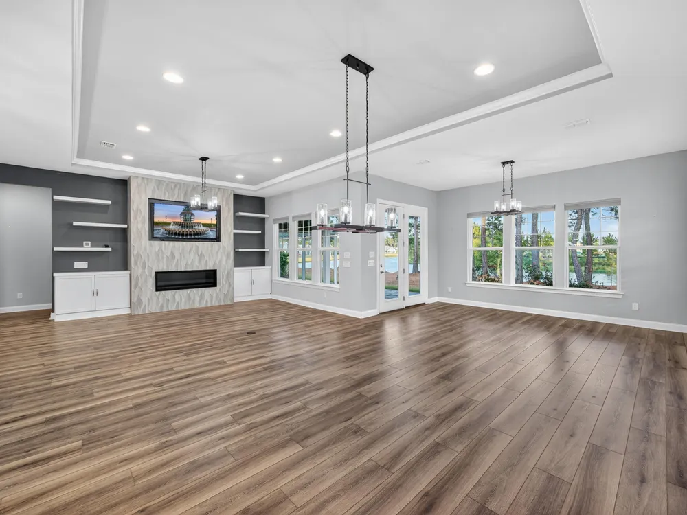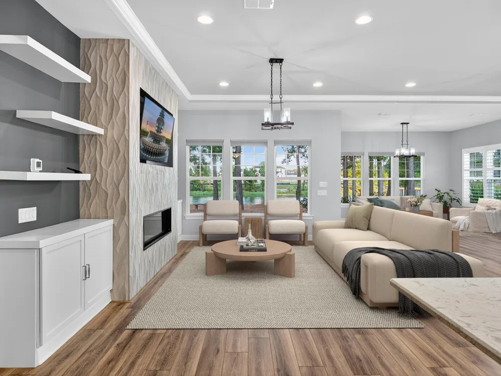 Welcome to 108 Bluff Isle Court, a stunning single-story lakefront home in the sought-after 55+ community of Four Seasons at Lakes of Cane Bay. Thoughtfully designed and *extensively upgraded*, this elegant 3,049 sq. ft. San Sebastian floor plan offers 3 bedrooms, 2.5 baths, and two garages accommodating 3 cars, all situated on a private cul-de-sac with peaceful east-facing views of the water.Step inside and you'll find 10-foot ceilings, tray details with crown molding, and an inviting open-concept layout perfect for entertaining. The gourmet kitchen is a chef's dream, featuring GE Profile appliances, double ovens, a five-burner gas cooktop, quartz countertops, a farmhouse sink, custom soft-close cabinetry, a vented hood, and pendant lighting over the oversized island. The great room centers around a modern, remote-controlled gas fireplace and flows seamlessly into the sunroom, where natural light and lake views fill the space. The owner's suite offers a luxurious retreat with a tray ceiling, spa-style bathroom with a frameless glass shower, soaking tub, soft-close cabinets, upgraded tile, and a custom-built walk-in closet complete with shelving and drawers. Enjoy year-round outdoor living on the extended paver patio, featuring a covered seating area with a ceiling fan, gas line for grilling, and a pergola with lighting overlooking the water. The garages are equipped with digital openers, 220-volt outlets, added lighting, and a mini-split HVAC system in the workshop bay, providing comfort and utility. Every inch of the home reflects careful attention to detailfrom custom blinds and plantation shutters to enhanced insulation and Sherwin-Williams Duration paint throughout. Beyond the home itself, Four Seasons at Lakes of Cane Bay offers one of the Lowcountry's most impressive amenity packages, including resort-style outdoor pools, a heated indoor lap pool and spa, pickleball and tennis courts, bocce, a fitness center, game and billiard rooms, a demonstration kitchen, ballroom, dog park, boat and kayak launch on the community's 300-acre lake, and 24/7 gated security. A full-time lifestyle director curates year-round events, and all lawn care is included, ensuring maintenance-free living at its finest. This home combines luxury finishes, functional upgrades, and a premium lakefront setting to deliver one of the most complete offerings in Four Seasons.