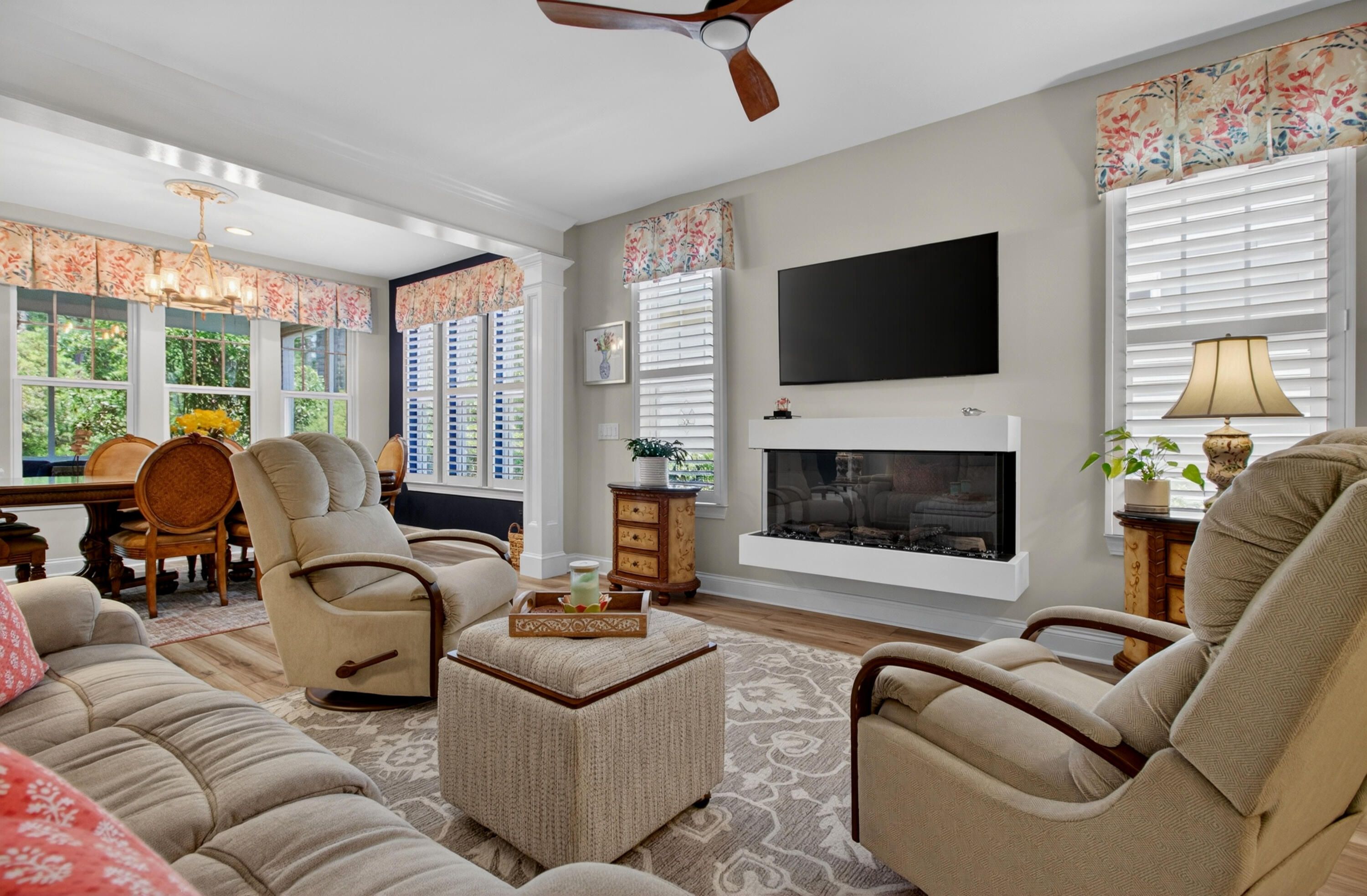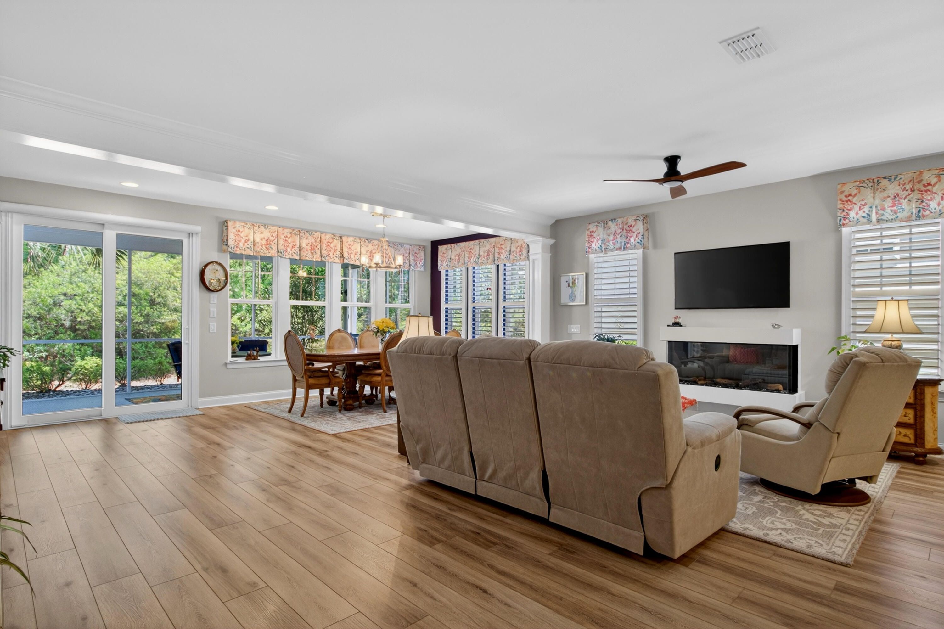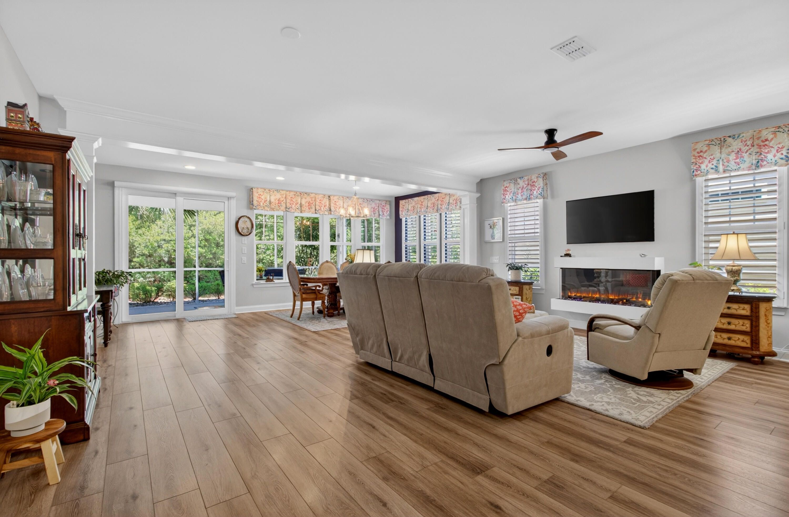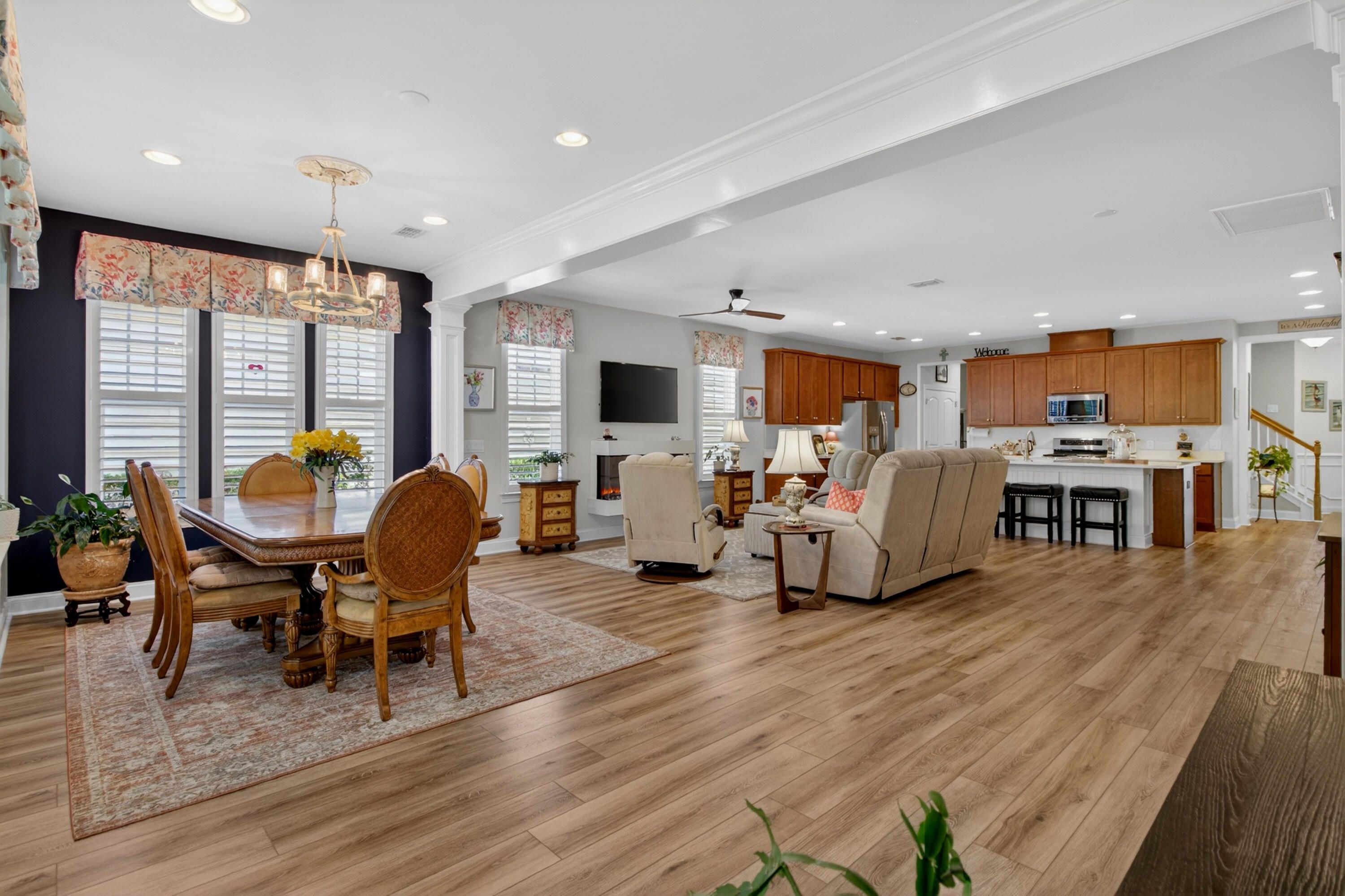 Charming 3-Bedroom, 3-Bath Home in Four Seasons at Cane Bay - Premier 55+ Living. Welcome to this beautifully maintained two-story home located in one of Cane Bay's premier 55+ communities, Four Seasons at Lakes of Cane Bay. From the moment you enter, you'll notice the craftsmanship and attention to detail -- from the elegant foyer to the custom trim work that adds warmth and sophistication throughout the main floor. The open-concept design creates a welcoming flow from room to room. Luxury vinyl flooring spans the main level, including both downstairs bedrooms. The family room features a custom-built electric fireplace with blowers and color-changing effects, complemented by crown molding and decorative trim columns that define the adjoining dining area while maintaining an open layout.