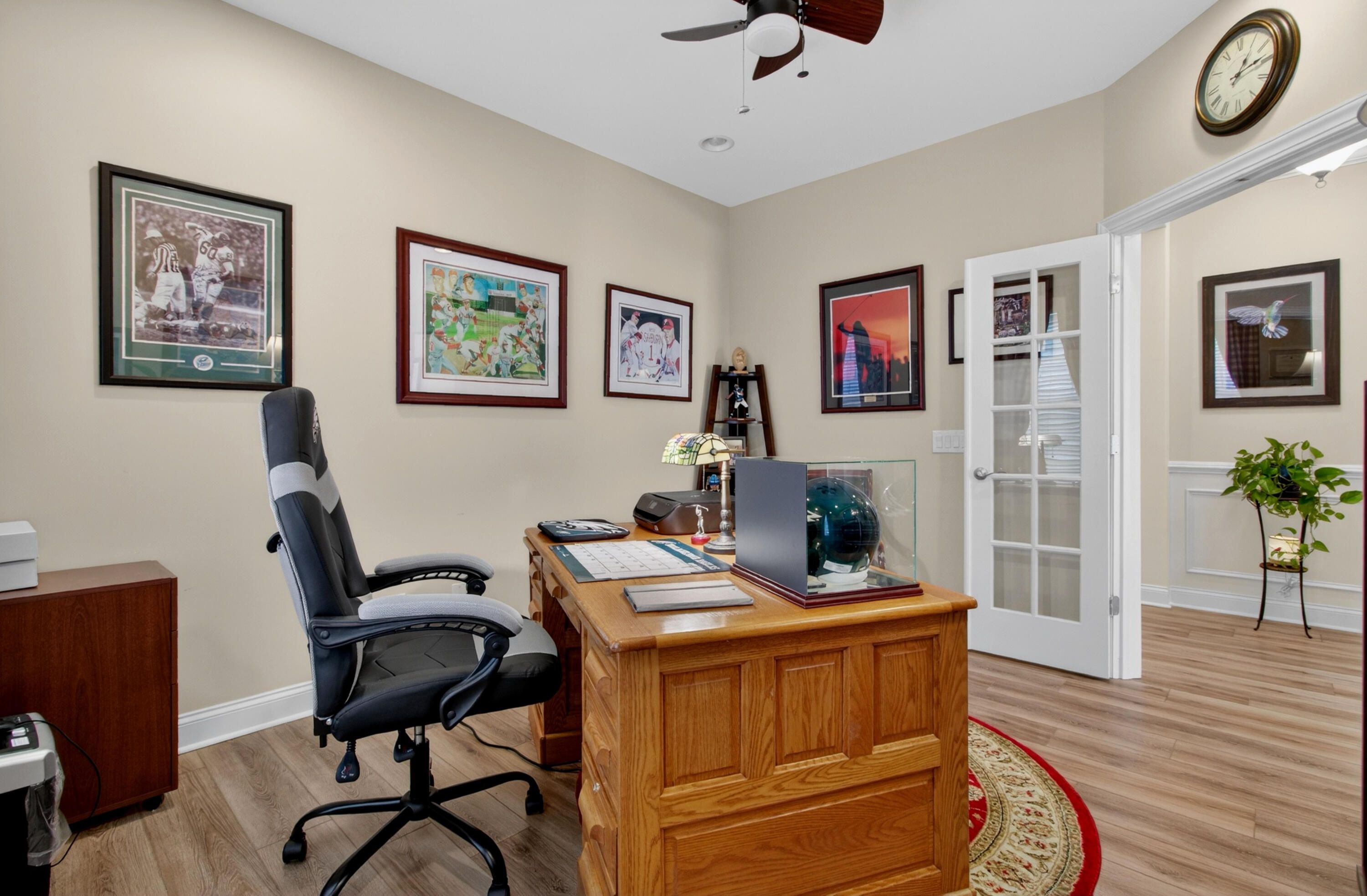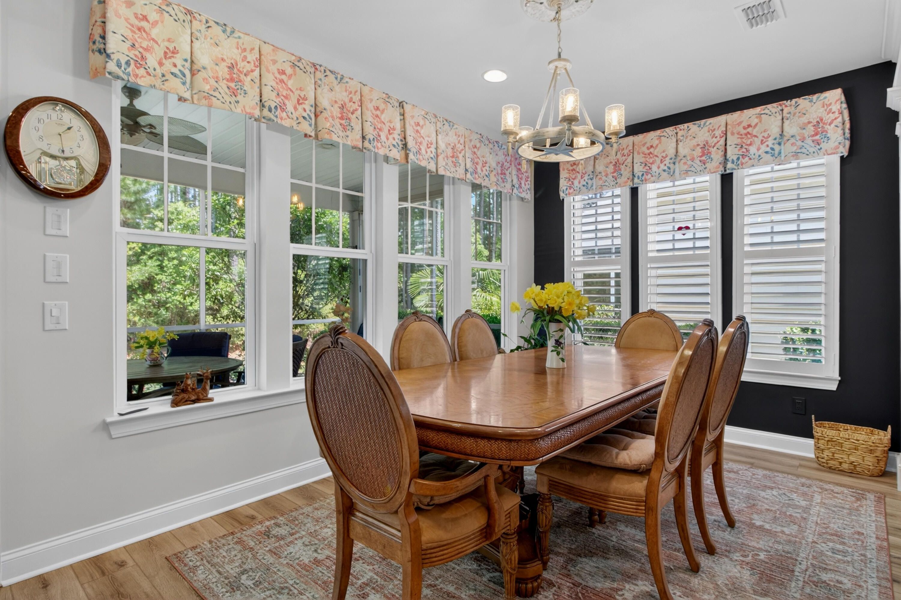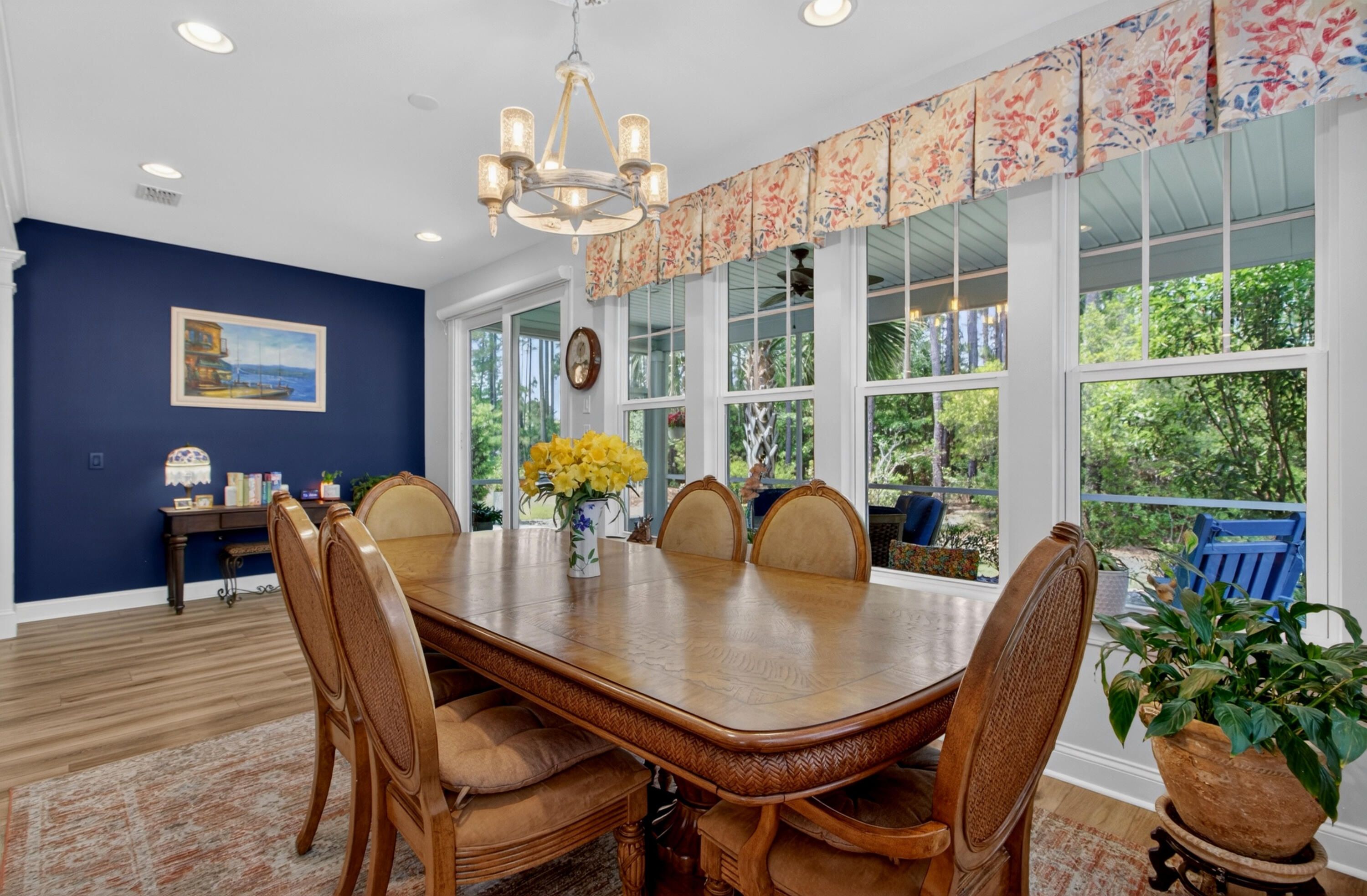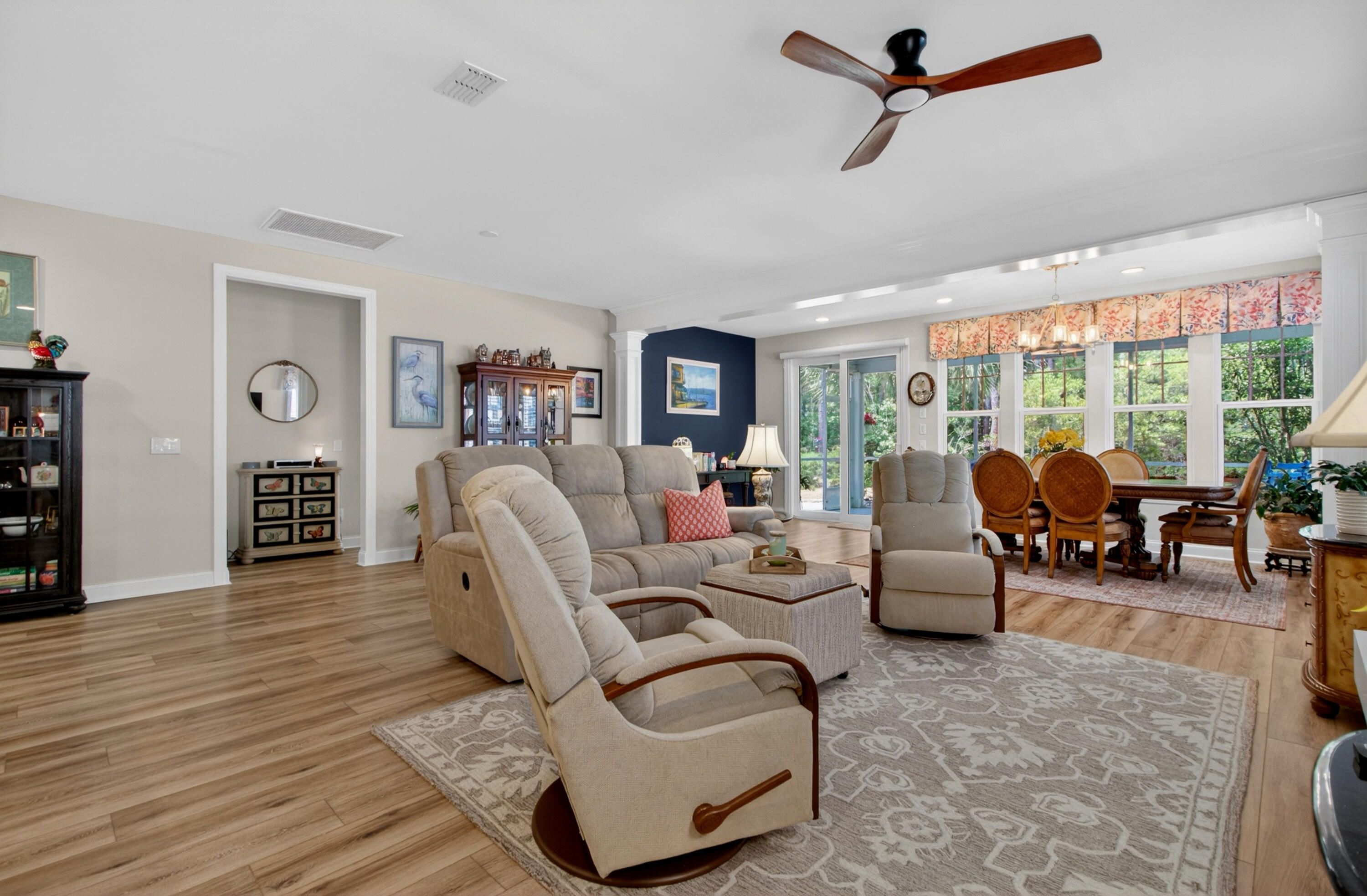 Charming 3-Bedroom, 3-Bath Home in Four Seasons at Cane Bay - Premier 55+ Living. Welcome to this beautifully maintained two-story home located in one of Cane Bay's premier 55+ communities, Four Seasons at Lakes of Cane Bay. From the moment you enter, you'll notice the craftsmanship and attention to detail -- from the elegant foyer to the custom trim work that adds warmth and sophistication throughout the main floor. The open-concept design creates a welcoming flow from room to room. Luxury vinyl flooring spans the main level, including both downstairs bedrooms. The family room features a custom-built electric fireplace with blowers and color-changing effects, complemented by crown molding and decorative trim columns that define the adjoining dining area while maintaining an open layout.