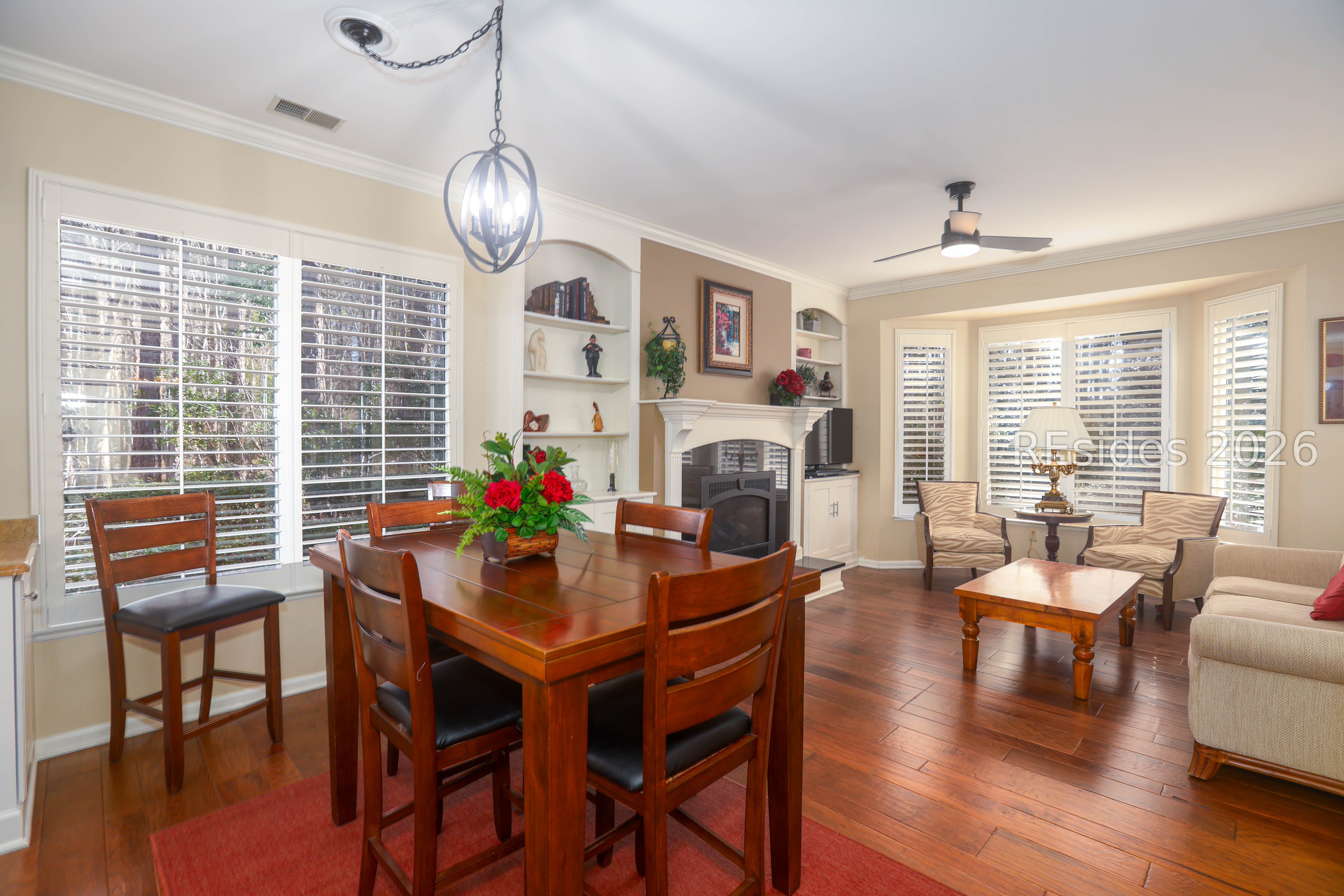 - Attic Access, Bookcases, Built-in Features, Ceiling Fan(s), Fire Extinguisher, Fireplace, Accessibility Features, Main Level Primary, Pull Down Attic Stairs, Smooth Ceilings, Cable TV, Window Treatments, Entrance Foyer, Eat-in Kitchen, Pantry