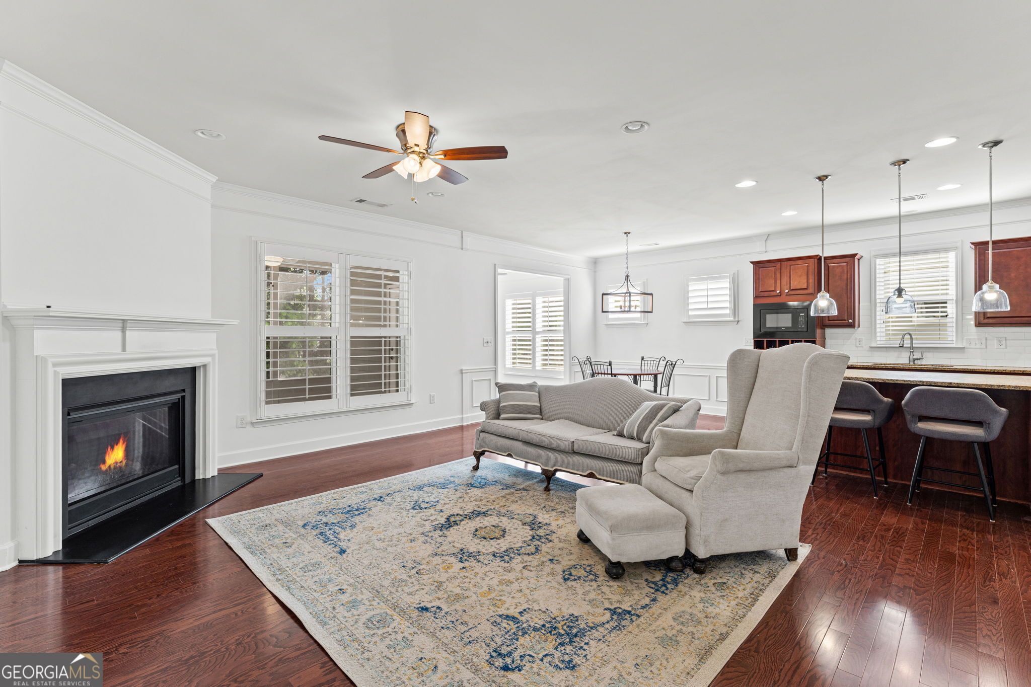 Welcome to this beautifully updated Abbeyville plan in the highly sought-after Sun City Peachtree active adult community in Griffin, Georgia. Built in 2015, this 2-bedroom, 2- bath home offers 1,808 square feet of thoughtfully designed living space, perfectly situated on a private wooded lot for added peace and privacy. Step inside to find fresh interior paint, hardwood floors throughout, and no carpet, creating a clean, modern feel. The open-concept layout is enhanced by elegant crown molding and abundant natural light. The spacious living area features cozy fireplace, ideal for relaxing and entertaining. The kitchen is both functional and stylish, offering granite countertops, gas cooking, pull-out drawers, and ample cabinetry, along with plantation shutters that continue throughout the home for a refined touch. The owner's suite is a true retreat, featuring a large shower, cultured marble sinks, and a well-appointed bath designed for comfort and convenience. A dedicated laundry room adds everyday practicality. Enjoy outdoor living year-round in the screened lanai overlooking the private wooded backyard-perfect for morning coffee or unwinding in the evenings. This move-in ready home combines quality upgrades, low maintenance living, and access to the exceptional amenities of Sun City Peachtree.
