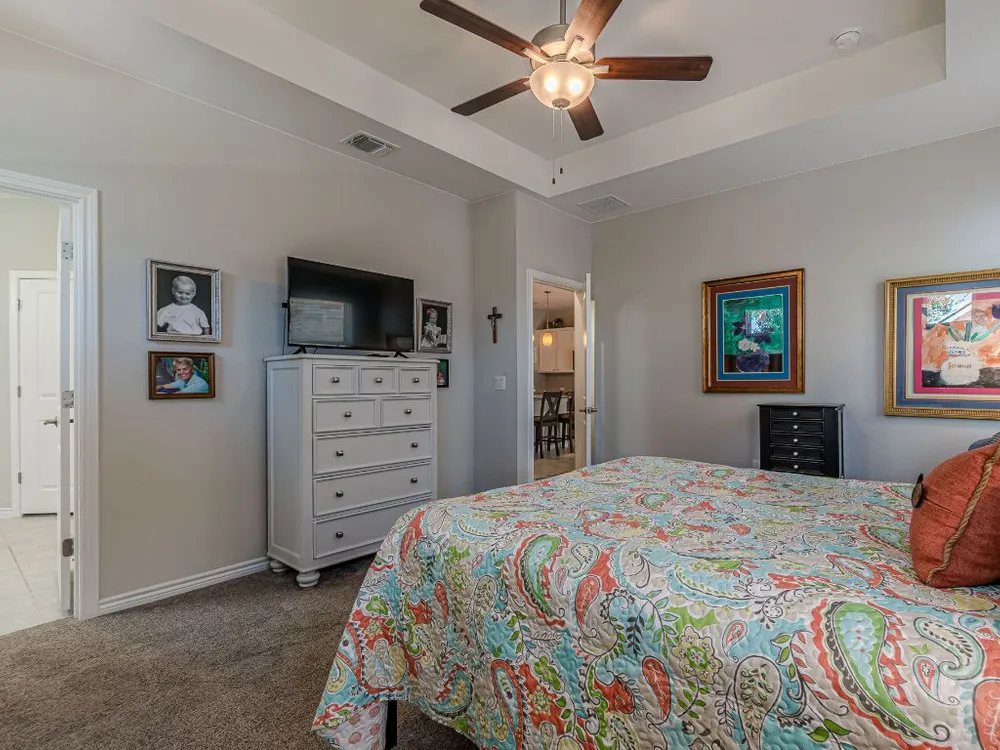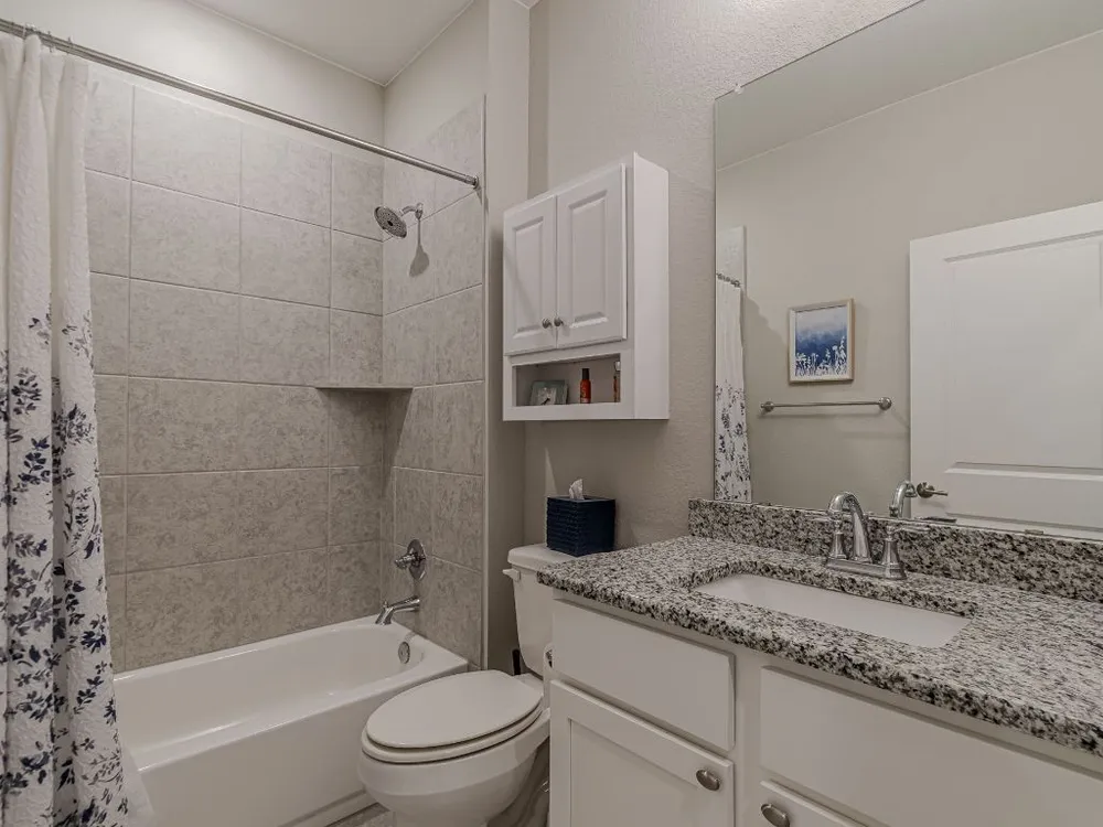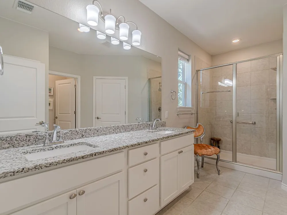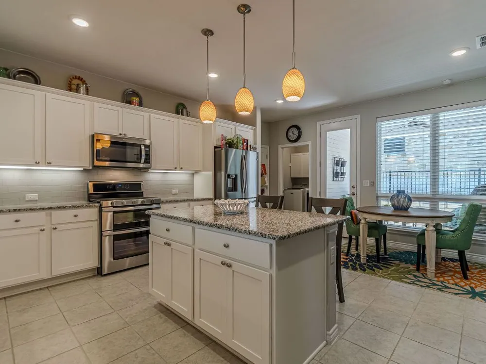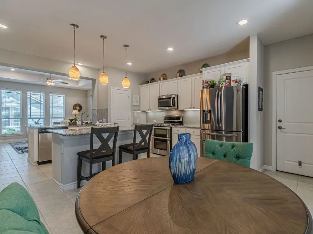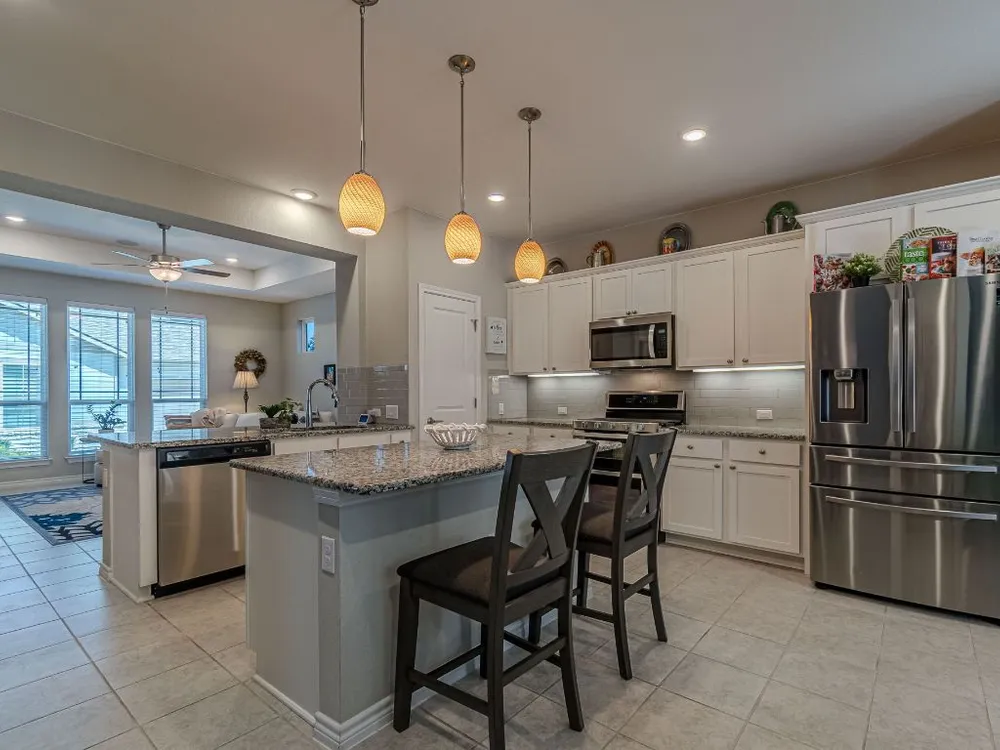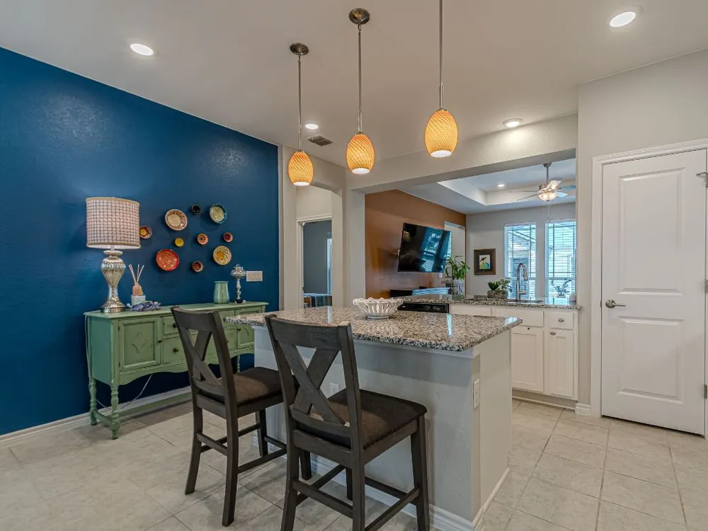 - Breakfast Bar, Tray Ceiling(s), Ceiling Fan(s), Double Vanity, Granite Counters, Kitchen Island, Main Level Primary, Pantry, Recessed Lighting, Smart Thermostat, Wired for Data, Bar