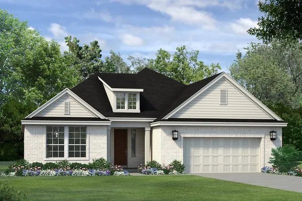 Monroe plan with upgraded kitchen, quartz countertops, tile flooring, optional study with double doors, optional shower in second bath, full gutters, upgraded bronze window frames, enlarged covered patio