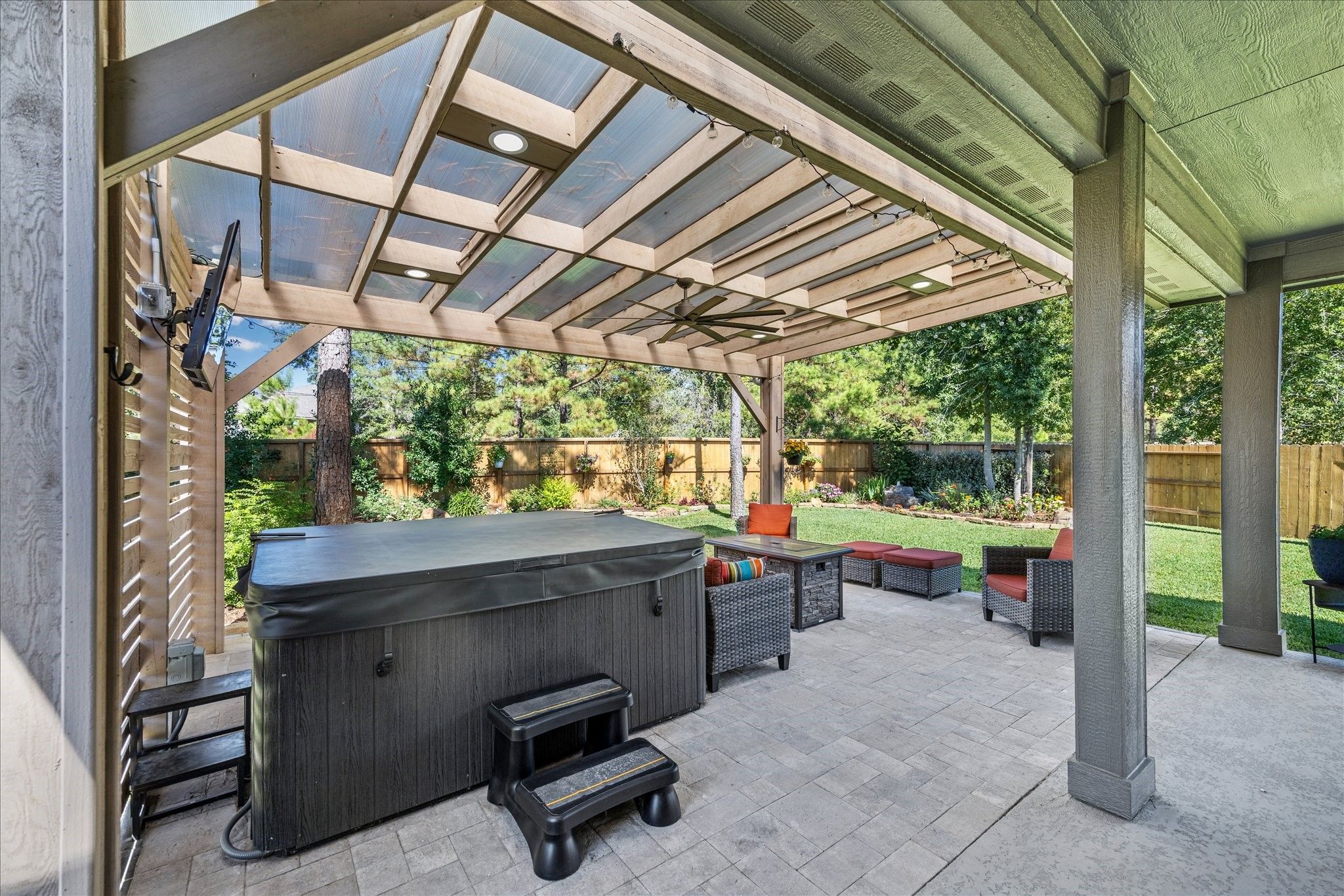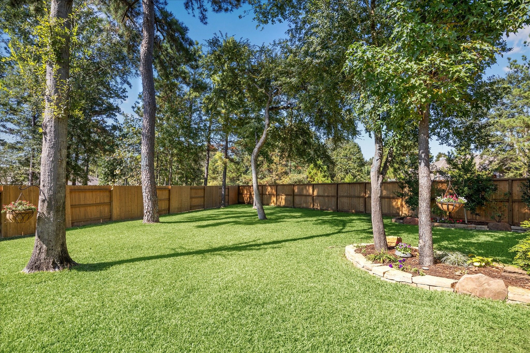 Beautifully upgraded 2-bed, 2-bath home in the 55+ Bonterra section of Woodforest. Situated on a rare near ¼-acre lot, this home features a private backyard retreat with lush landscaping, extended covered patio, spa, and self-mower. Interior upgrades include high ceilings, expanded kitchen cabinetry with lighting, gas fireplace with blower, and an extended garage. Front yard maintained by HOA. Enjoy full Woodforest amenities plus exclusive Bonterra perks—private pool, clubhouse, fitness center, and tennis/pickleball courts.