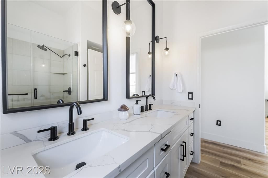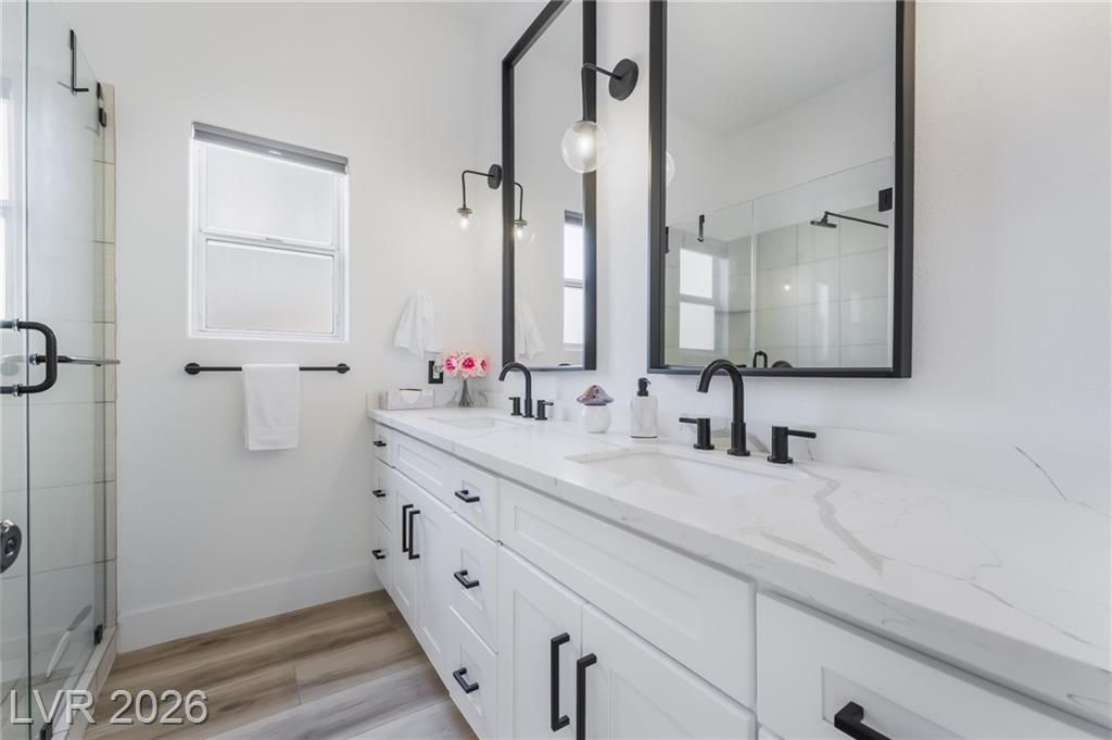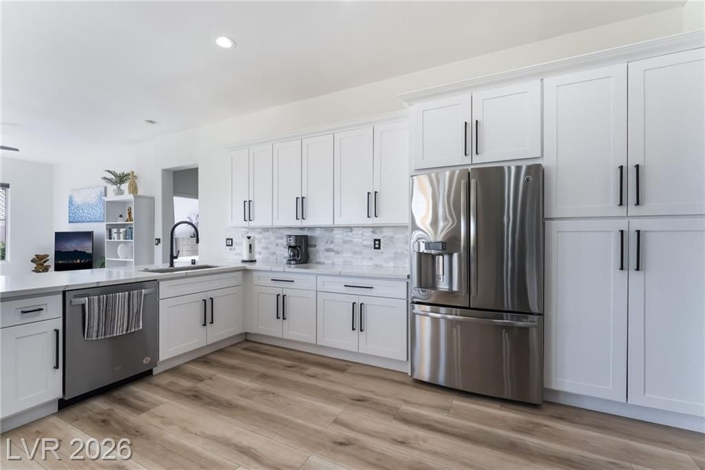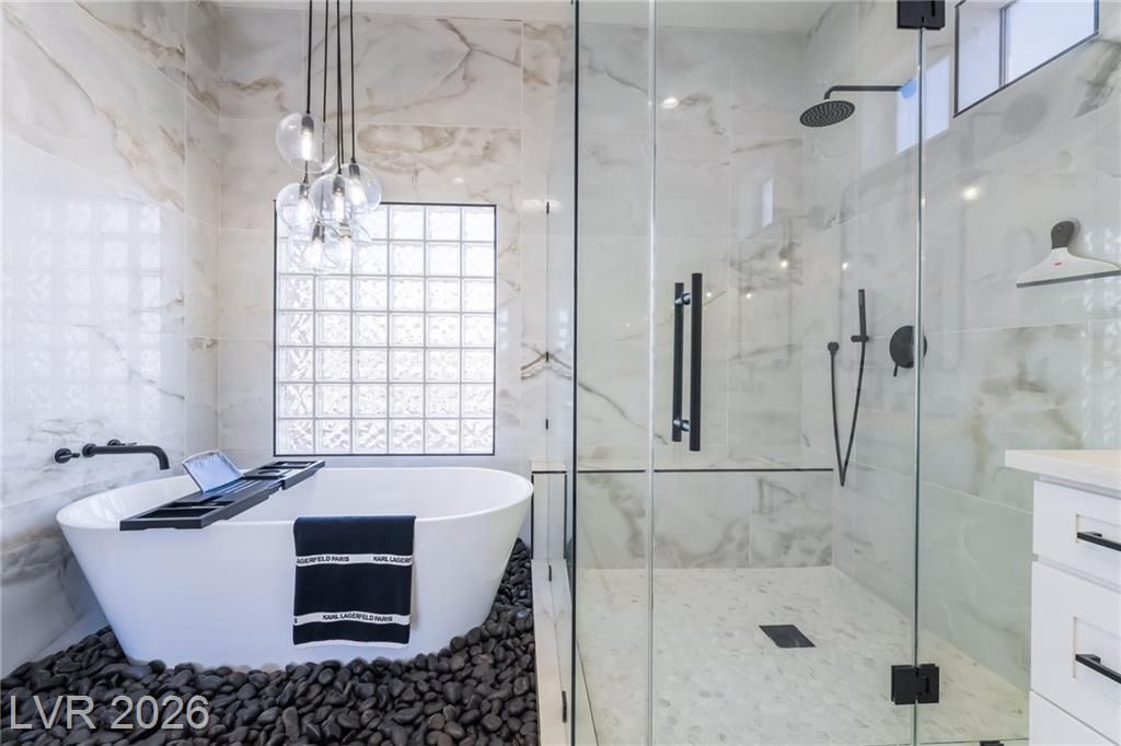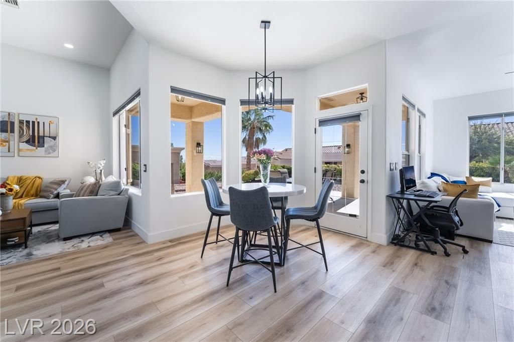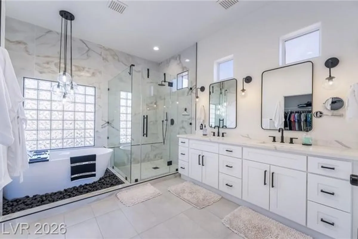 Welcome to your desert oasis in the heart of Sun City Summerlin! Ideal for snowbirds or year-round living, this fully remodeled, move-in-ready home blends comfort, elegance, and modern design. Enjoy fresh interior paint, custom white shaker cabinetry, quartz countertops, luxury vinyl plank flooring, plush bedroom carpet, tall 5.5” baseboards, stainless steel appliances, and sleek contemporary fixtures throughout. The open-concept layout is perfect for entertaining, relaxing, or unwinding after a day on the golf course or at one of the community’s many recreation centers. The spacious primary suite is a private retreat with a spa-inspired bathroom featuring a freestanding soaking tub, large step-in shower, and cozy fireplace. Outside, enjoy Las Vegas sunshine in your beautifully landscaped yard, just minutes from golf, dining, shopping, and entertainment. Live the resort lifestyle you’ve earned—welcome home to Sun City Summerlin!