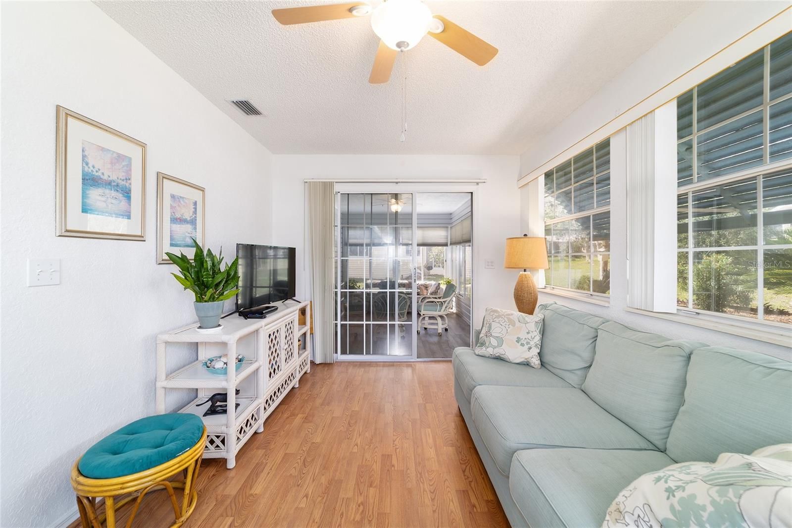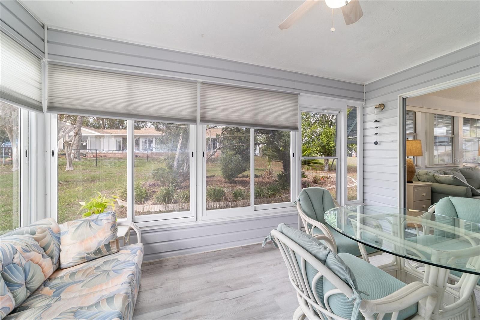 I'm SO PRETTY, OH SO PRETTY!!! EXPANDED HAMPTON 2/2/1.5 with BONUS ROOM and ACRYLIC ENCLOSED FLORIDA ROOM. Steps leading to the cozy front porch plus an added curved driveway for your guests. Low maintenance yard. Upon entering you can embrace the light and airy feeling of this home with its high ceilings and neutral colors. Big living room leads to an expanded dining room that will accommodate a 6 seat table and hutch. Off of the dining room is a glass enclosed bonus room with heat and air that can be used as office, den, craft room or whatever you like. Off of the bonus room is an acrylic enclosed Florida room to enjoy that morning coffee. The kitchen is to the right of the dining room and offers lots of cabinets, a pantry and quartz countertops and a breakfast area overlooking the backyard through a bay window. Off of the kitchen is the 1.5 garage that includes a very nice laundry area that includes a washer/dryer and utility sink and workbench. Extra storage has been put into this home with a linen closet in the hallway and extra cabinetry in the master bathroom. There is a walkway from the side garage to the front of the house too - very convenient! NEW ROOF 2023, AC has been meticulously maintained, NEW Electric Panel 2023. Located in Oak Run Country Club that offers 6 pools, 5 hot tubs, Golf Course, Restaurant, Dog Park, and so many amenities you definitely won't be bored. Shopping, medical facilities, restaurants and Walmart are right outside the gate as well. So come on over to Oak Run and enjoy the good life!