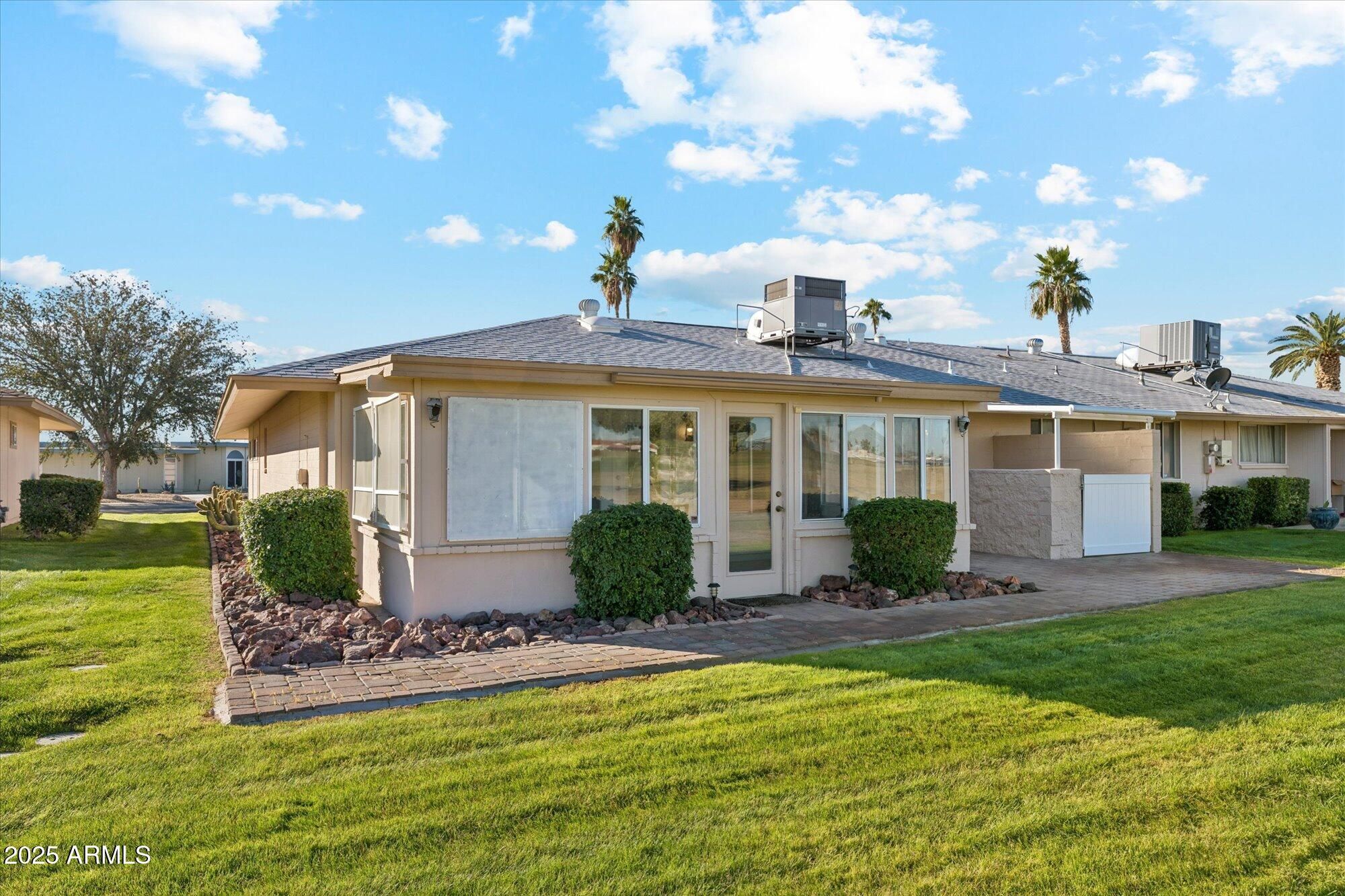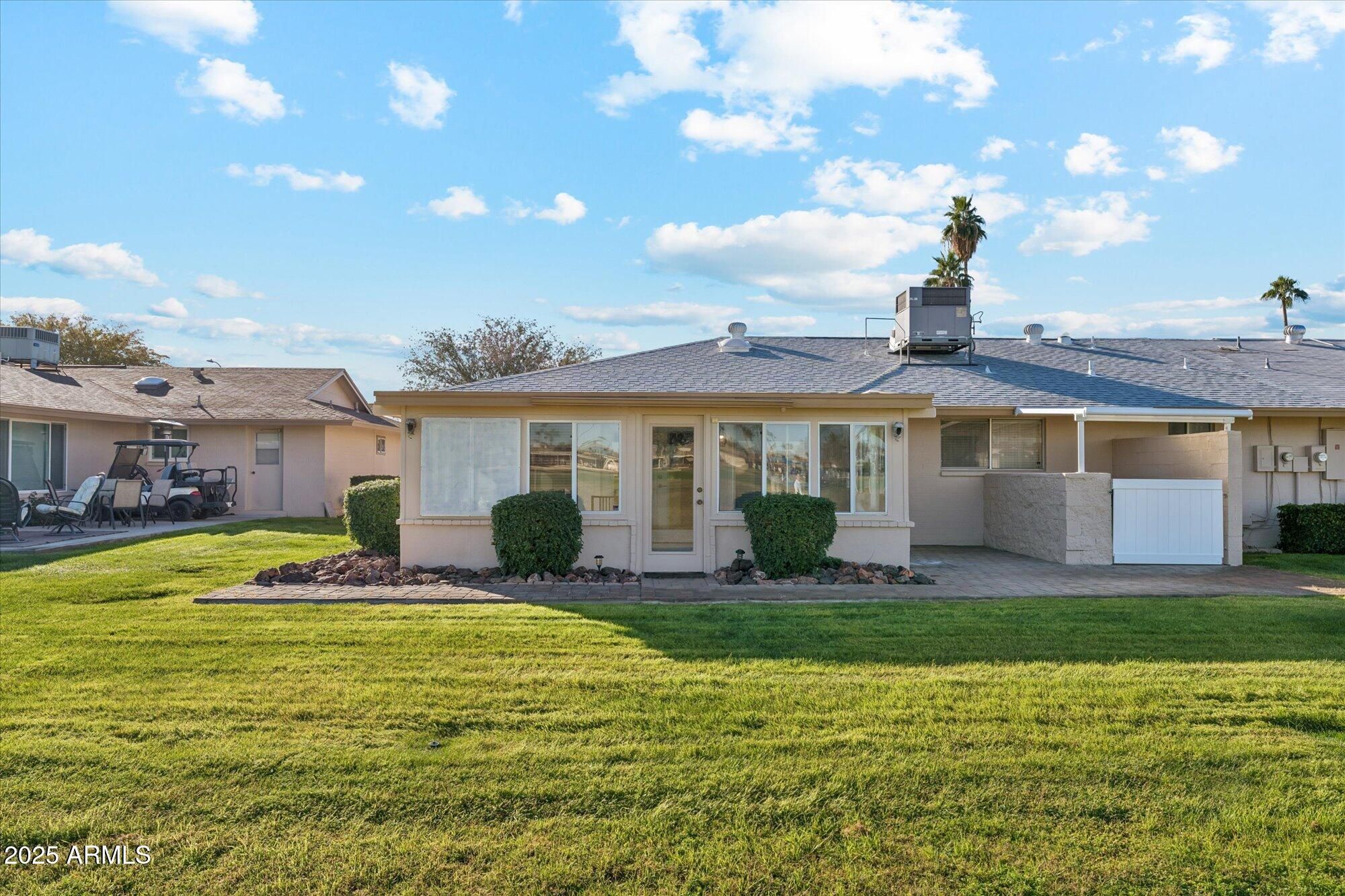 Stunning Golf Course home in Sun City! Discover this beautifully appointed single family home just west of the hole 4 tee box. Featuring 2 very spacious bedrooms, 2 recently update bathrooms. This home offers luxury, style & comfort. The Master suite boasts a spa-like ensuite with a steam shower, perfect for relaxation. The home also includes a large bonus room ideal for lounging, office, crafts etc. Additional Arizona Sun Room (air conditioned & also heated) overlooking the golf course. You will love the immaculate tile flooring throughout the living areas, complimented with nice plush carpeting in the bedrooms. The eat-in kitchen is perfect for casual meals, while the adjacent dining area is perfect for entertaining guests. The large laundry room is inside, not in the garage and offers plenty of storage. Out back is a quaint patio area to sit and overlook the golf course and there you'll find a dedicated golf car parking area, adding convenience and ease of access. This home truly combines luxury, comfort, style & a prime location. Priced below market value this is a screaming great buy. Golf enthusiasts, don't miss your opportunity to make living on a golf course your dream come true!