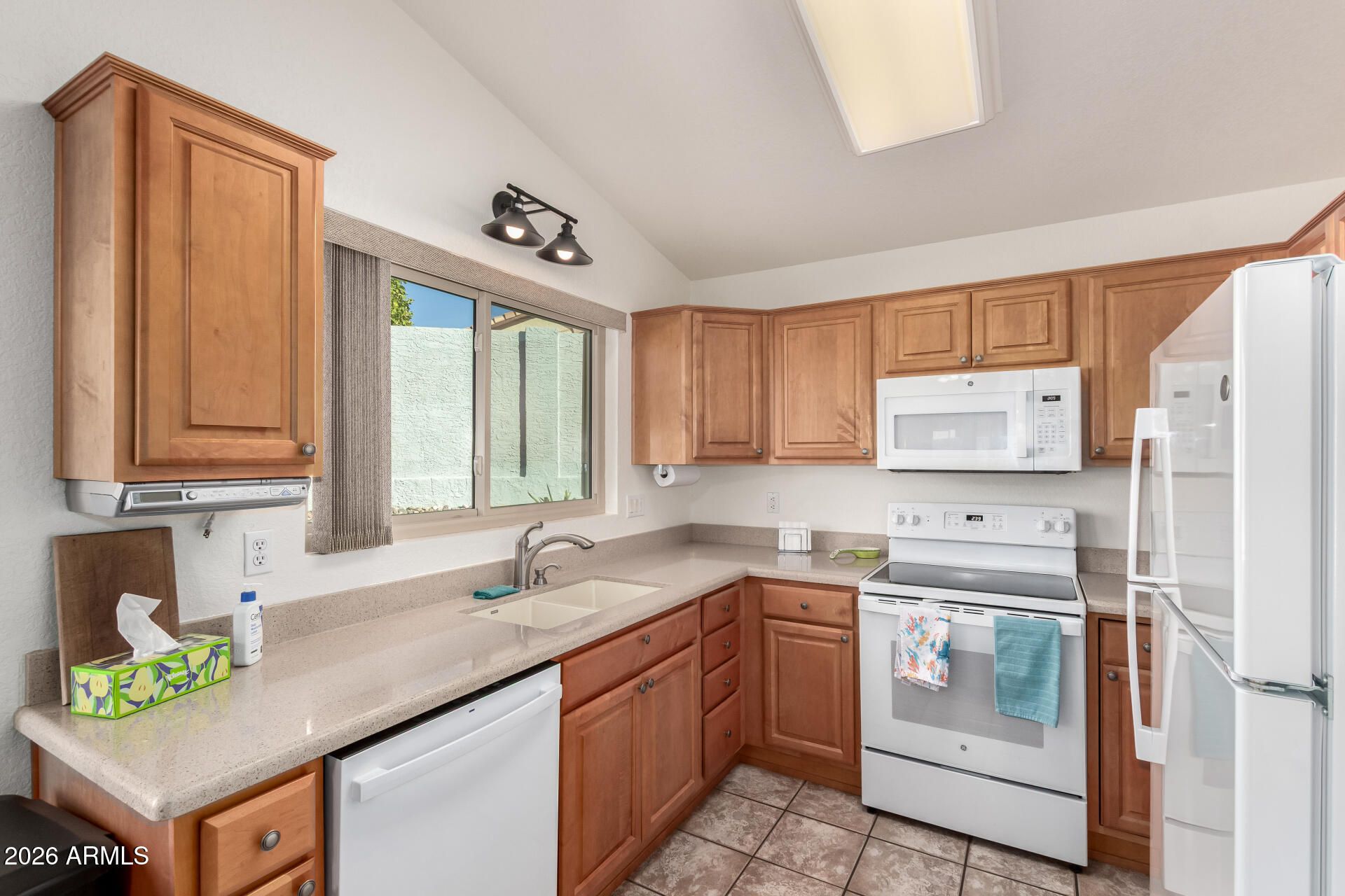 Beautifully updated, move-in ready home featuring two bedrooms plus a versatile den with French doors and space to add a closet. Vaulted ceilings and a plant shelf enhance the family room with plenty of natural light. The kitchen has been tastefully updated with quartz countertops, raised-panel cabinetry, stainless steel appliances and an electric range that is also stubbed for gas. A bayed dining window provides a pleasant view of the backyard Step outside to a private backyard retreat offering a generous well designed outdoor space. The finished stucco block wall, raised planter beds, and extensive paver patios, including a side patio for a polished, low-maintenance outdoor environment. A screened, enclosed patio is great for enjoying the AZ weather. Ventana Lakes offers the active adult life style with lakes and paths, clubhouses, pools and spas, fitness centers, tennis and pickleball courts, bocce ball, and a wide variety of clubs, activities, and social events.