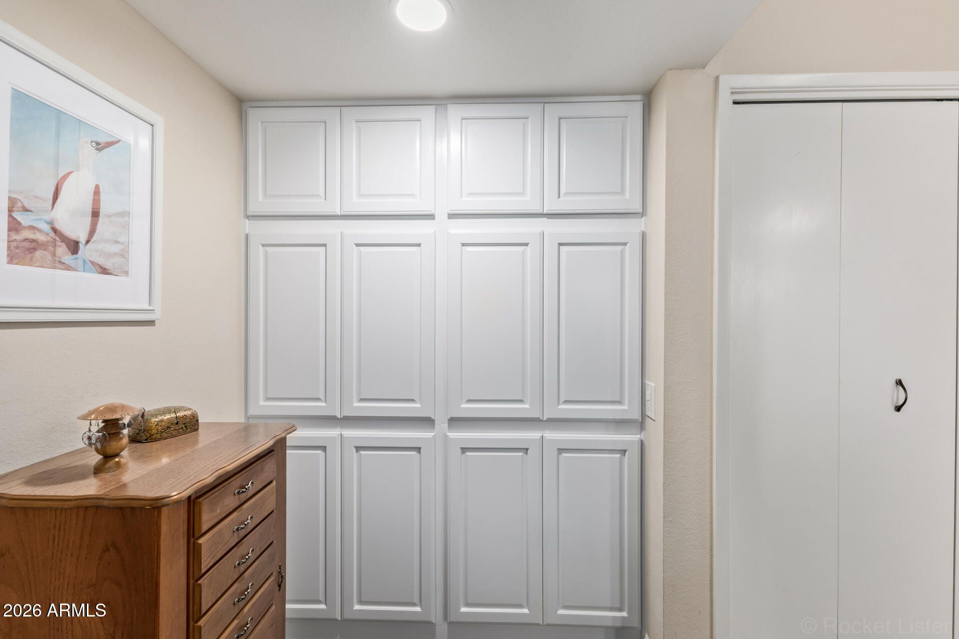 This beautifully updated home features a fully remodeled kitchen showcasing ceiling- height cabinetry with soft-close features, pull-out pantry shelves, quartz countertops, cracked glass backsplash, R/O water filter, GE Profile slate appliances, a solar tube for natural light, breakfast nook, recessed ceiling and under-cabinet LED lighting. Enjoy porcelain wood-grained tile flooring laid diagonally throughout the home. This 2-bedroom home offers thoughtful storage including floor-to-ceiling cabinets with pull- out shelves n the primary bedroom, closet organizers, and cordless double-cell shades. The Arizona room features motorized cell shades, while the spacious L-shaped living and dining area includes a built-in 9-ft entertainment center and 10-ft ceilings. Bathrooms are upgraded with quartz vanities, soft-close cabinetry, NuTone exhaust fans with heat and light, and pressure-assisted toilets (2024). Energy saving features include vinyl dual-pane low-E windows, a newer 4-ton, 2-stage, 16 SEER heat pump A/C with warranty, a smart programmable thermostat, mini-splits in the Arizona and utility rooms, ceiling fans throughout, and a solar water heater. North/south exposure adds energy efficiency, making this home as practical as it is inviting. Additional highlights include a large utility/workroom with extensive cabinetry, a utility sink with a cabinet, and a new front-load washer and dryer on pedestals. Enjoy a fully enclosed patio with wall-to-wall openable screened windows and paver flooring. Front entry to the home is through a private courtyard with 6 foot walls and screened in gate. Perfect for pets! Courtyard features an attractive steel sun-filtering cover and brick pavers that flow out to the driveway. This home has a 2-car garage with epoxy flooring, full wall storage cabinets, bright LED lighting, and automatic opener. The exterior boasts colorful brick pavers covering the driveway, walkways on the side of the house and across the backyard, and a large outdoor seating area. The home has a fully fenced backyard, attractive landscaping, programmable irrigation, and a well- maintained roof with elastomeric coating and transferable warranty. Located in an active adult community offering recreation centers., golf, over 150 clubs, and entertainment (annual fee required). NO HOA FEES, NO PET RESTRICTIONS. The home is a short walk from the Bell Camino shopping center (CVS, Safeway, and a new standalone Starbucks), along with additional nearby shopping and everyday conveniences--making this location as desirable as the home itself.