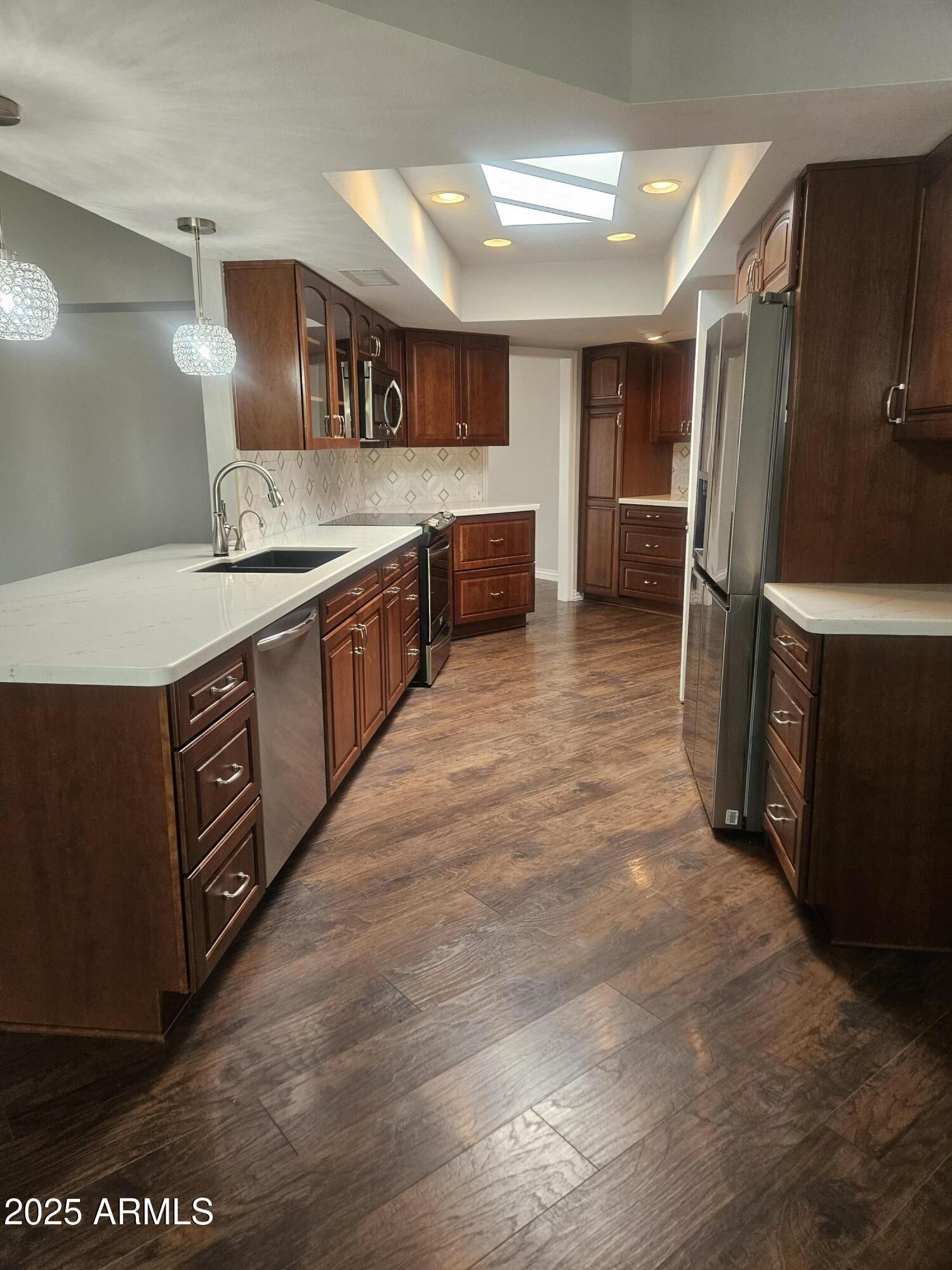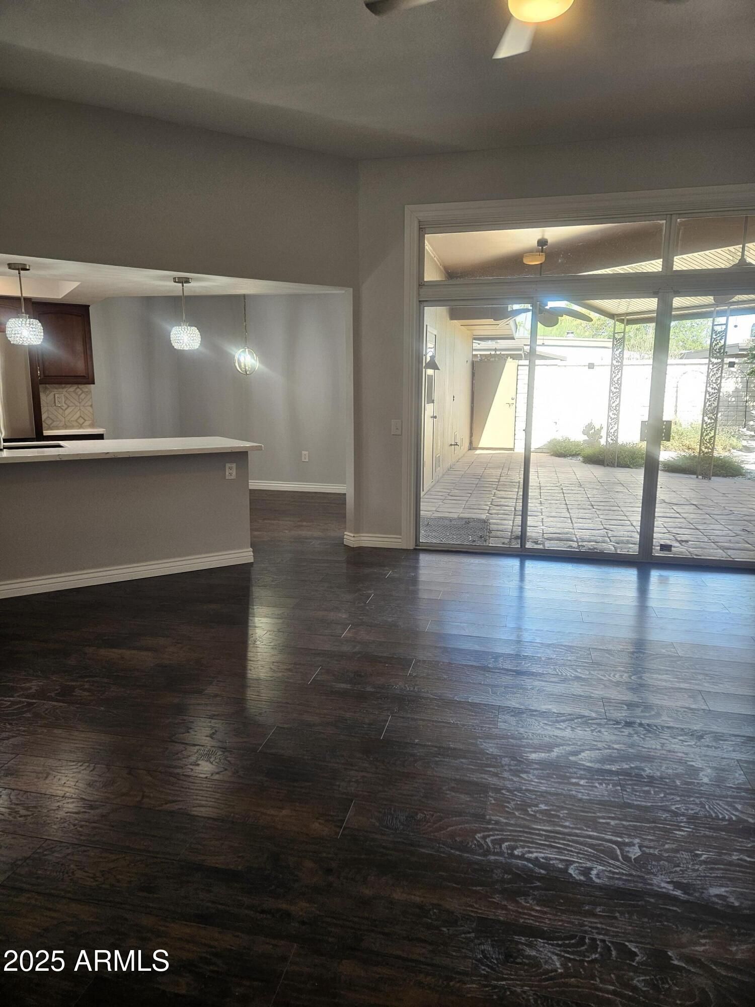 Beautifully updated garden townhome! This spacious unit features over 2100 SF of living space in the heart of Sun City.! Soaring ceilings with an open floor plan, this natural light filled home features neutral paint, gorgeous wood laminate flooring (updated in 2017) and tile throughout. Updated (2024) classic custom kitchen with quartz counters, plentiful quality cherry cabinetry (self closing drawers), newer stainless appliances and classic backsplash. The formal dining and charming living room are great areas for entertaining guests and the breakfast nook is awesome for more casual meals! Your new owners suite features a walk-in closet with separate dressing area. Matching cabinetry and counters (bathrooms updated in 2017) are featured throughout this home. Guest room features a walk-in closet and offers its own backyard access! Enjoy relaxing in your completely private backyard with a large (extended) covered patio. Owned Solar System with backup battery (2018) ensures energy efficiency and savings and makes your electric bill almost non-existent! Home recently appraised at value.