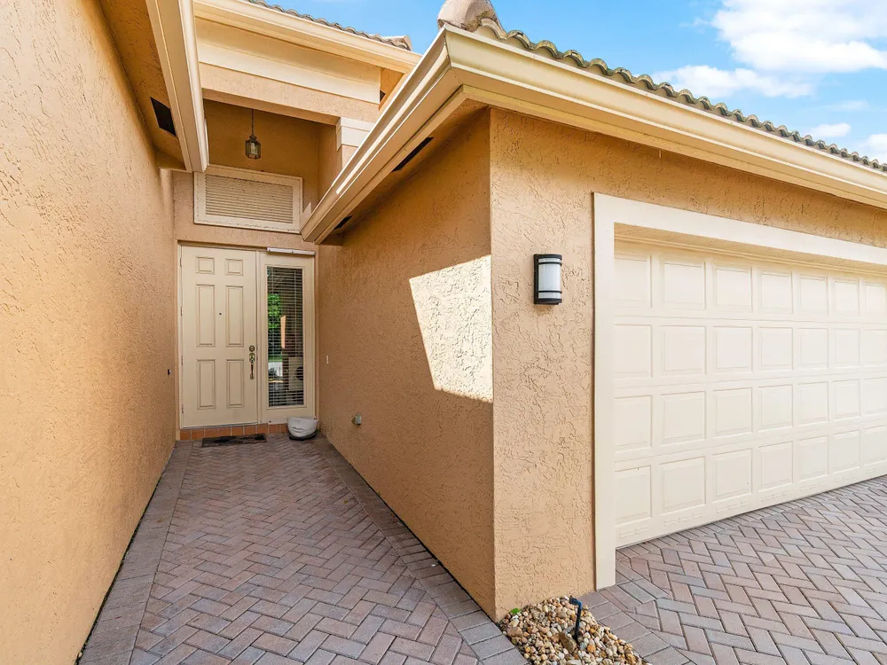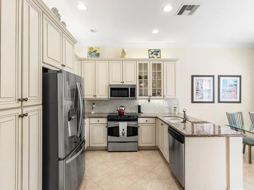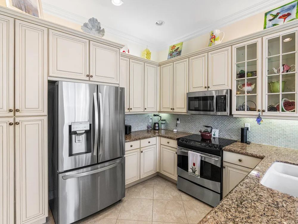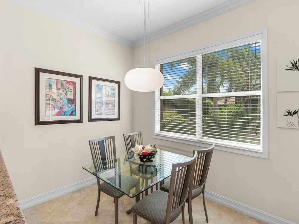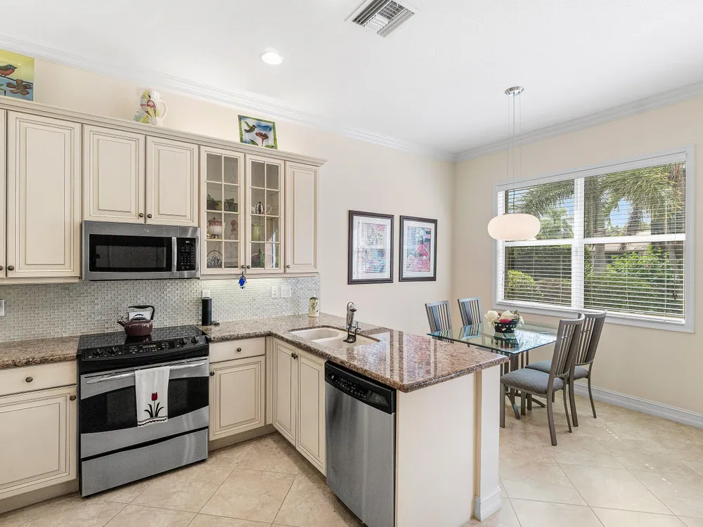 Beautifully landscaped, meticulously maintained, light and bright 2 bedroom + den/2 bath home with a 2 car garage! The decorative paver driveway and walkway, rock garden and colorful flowers will greet you. On entry, take in the neutral tile on the diagonal, crown mouldings, and light and airy paint throughout. The great room is spacious, and is open to both the dining room and the kitchen. The eat-in kitchen offers wood 42'' cabinets in a Bisque finish w/grey glaze, large pantry, granite countertops with a mosaic glass tile back splash and top of the line stainless steel appliances. There is a formal dining room for entertaining. Lots of natural light, LED hi hat lighting and LED light fixtures add to this home's appeal. The primary suite offers garden views, closet built ins,