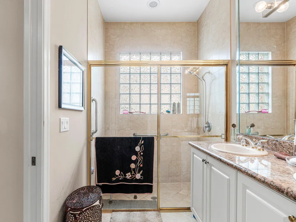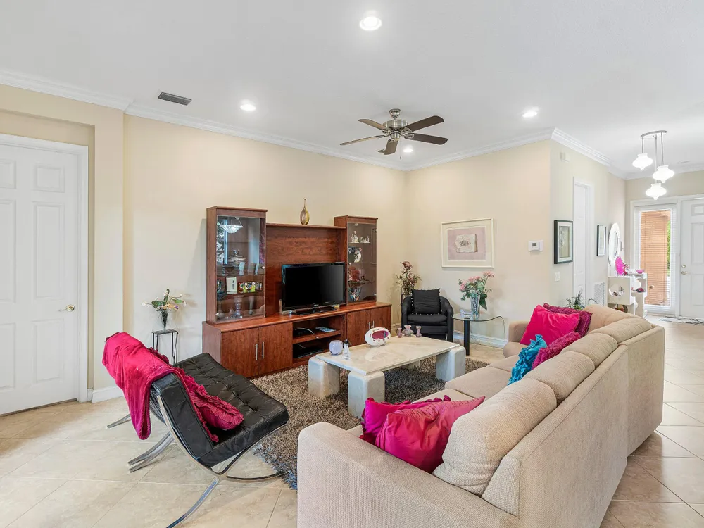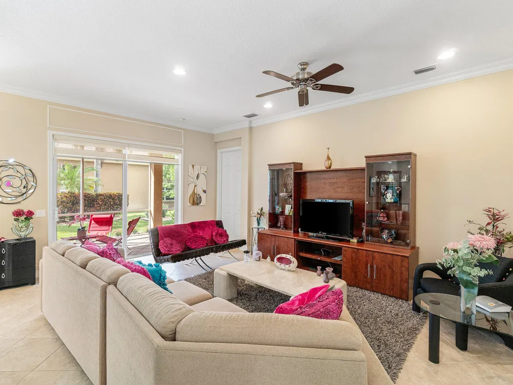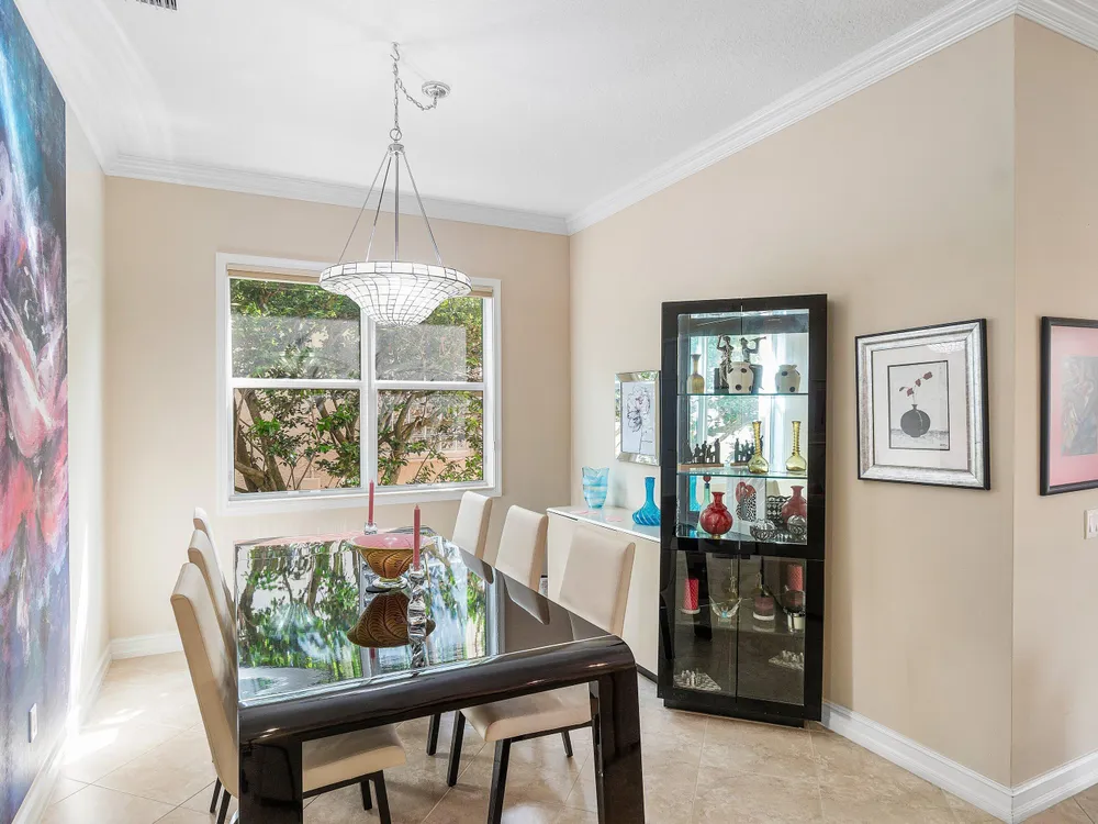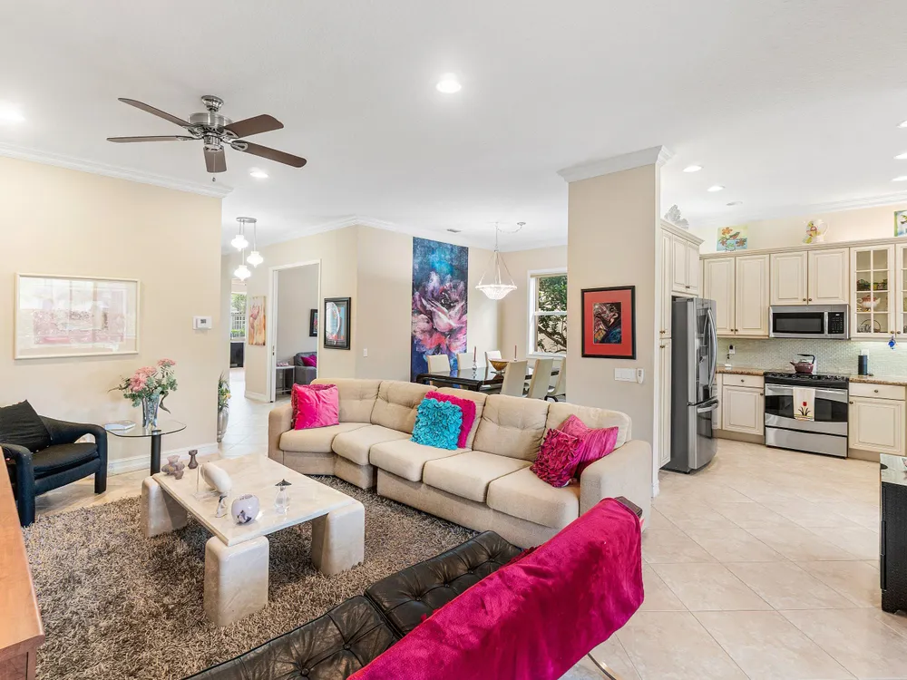 Beautifully landscaped, meticulously maintained, light and bright 2 bedroom + den/2 bath home with a 2 car garage! The decorative paver driveway and walkway, rock garden and colorful flowers will greet you. On entry, take in the neutral tile on the diagonal, crown mouldings, and light and airy paint throughout. The great room is spacious, and is open to both the dining room and the kitchen. The eat-in kitchen offers wood 42'' cabinets in a Bisque finish w/grey glaze, large pantry, granite countertops with a mosaic glass tile back splash and top of the line stainless steel appliances. There is a formal dining room for entertaining. Lots of natural light, LED hi hat lighting and LED light fixtures add to this home's appeal. The primary suite offers garden views, closet built ins,