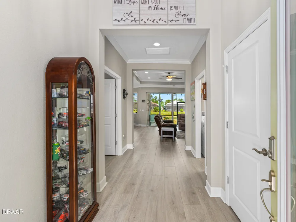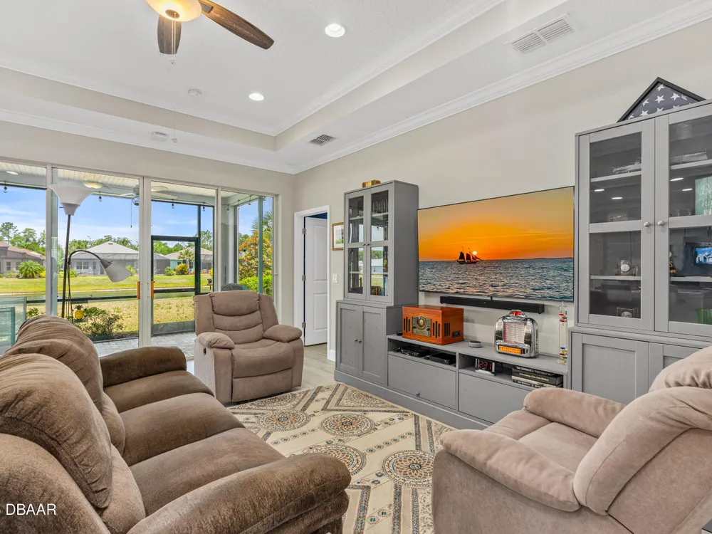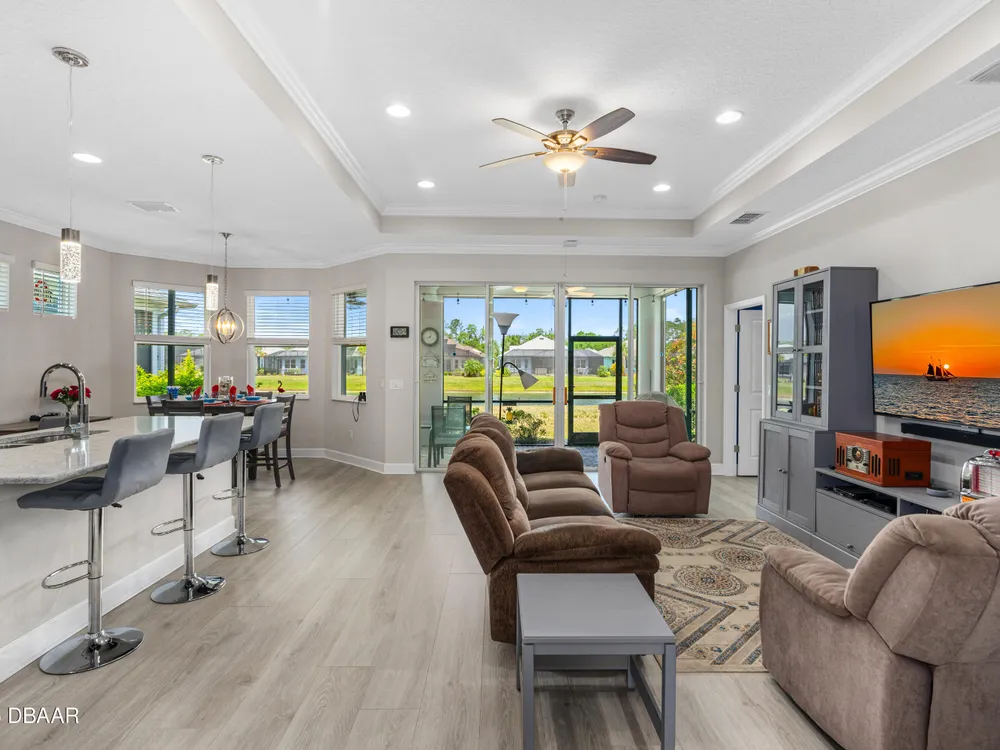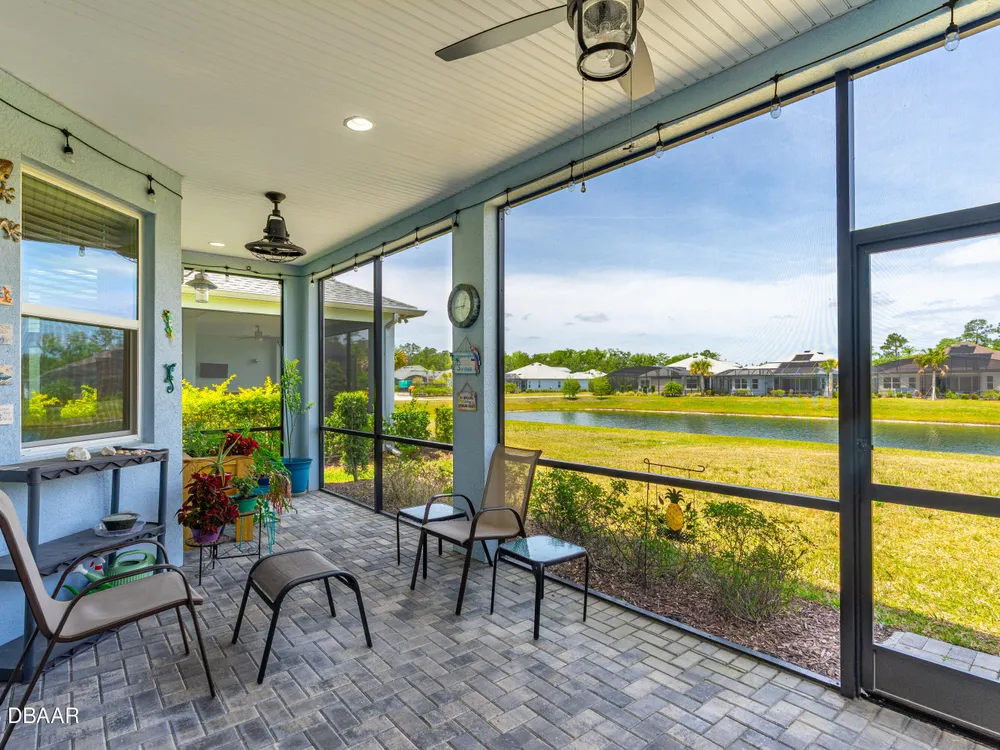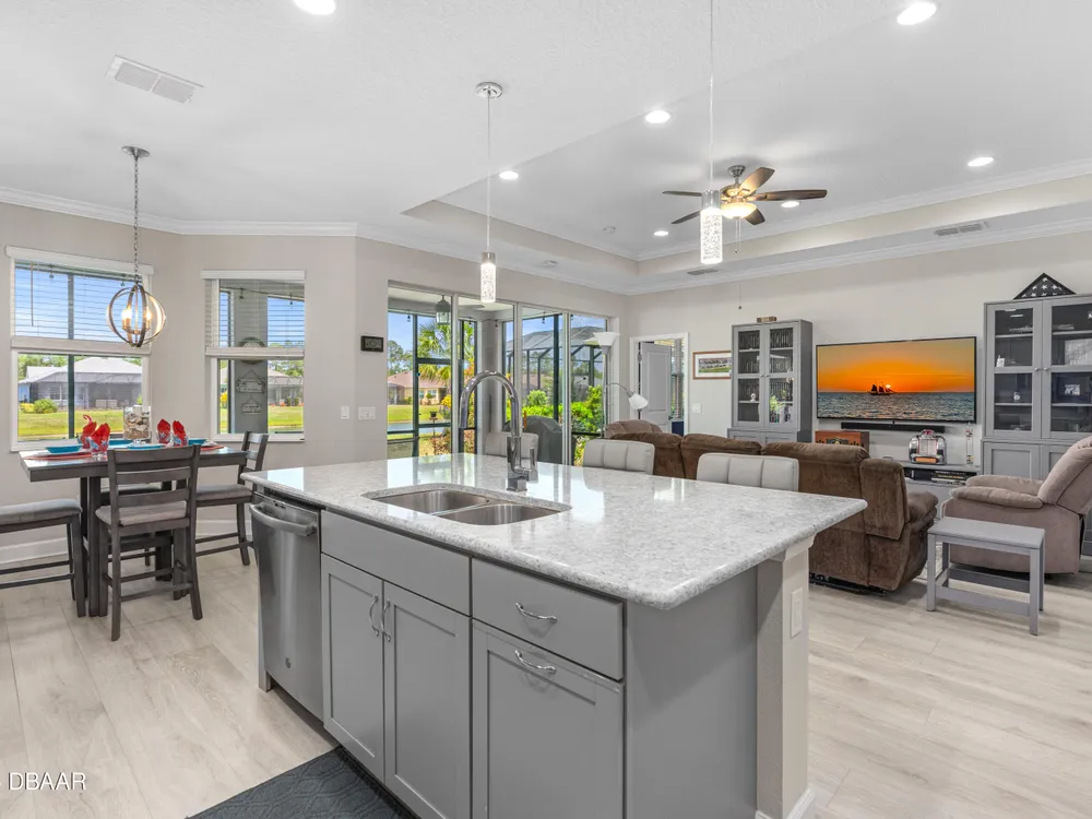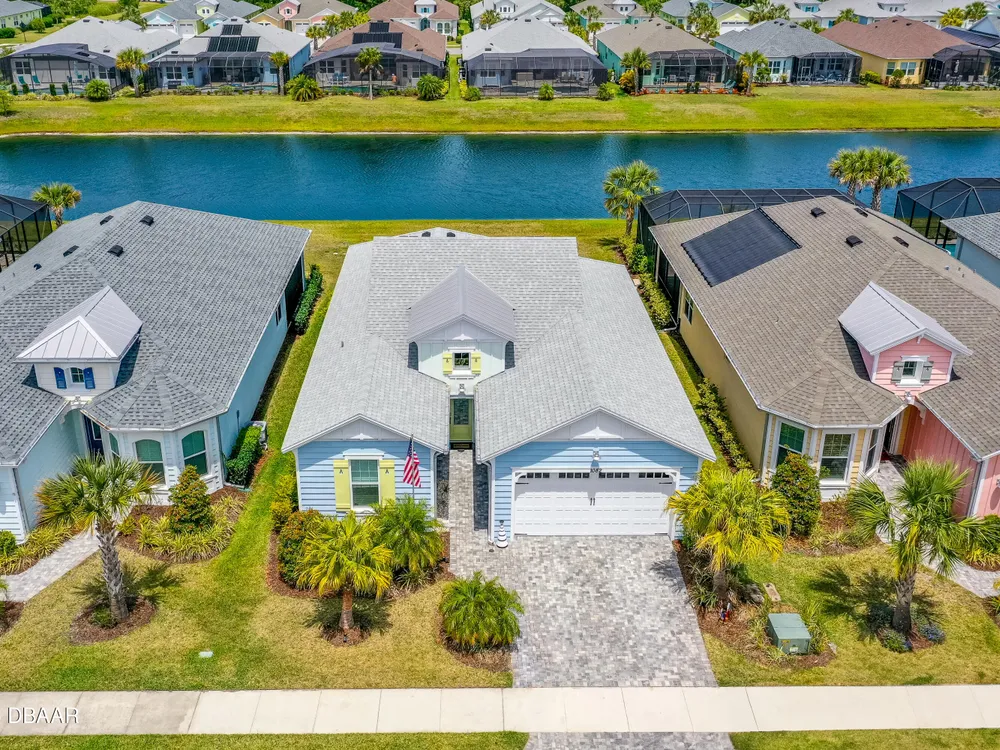 New price improvement!!! Don't miss out on this stunning Coconut model on a premium waterfront lot loaded with upgrades! Impact glass on all windows, doors & sliders. Wide plank laminate flooring throughout. Gourmet kitchen features quartz countertops, crown molding, pendant lights, electric cooktop, wall oven & pot drawers. Den with double doors, wall shelves & ceiling fan. Primary suite includes soaking tub, tiled walk-in shower, dual sinks with quartz counters, extra cabinet & humidity-sensing fan. Garage boasts insulated door, tinted windows, Smart Racks, extra lights, outlets & attic storage. Screened lanai offers peaceful water views, 2 ceiling fans, string lights & added outlet. Additional upgrades: termite control system, retractable screen door, solar spotlights, and more. Located in a resort-style community with pools, fitness center, beach club, restaurant & events. Move-in ready—schedule your tour today!