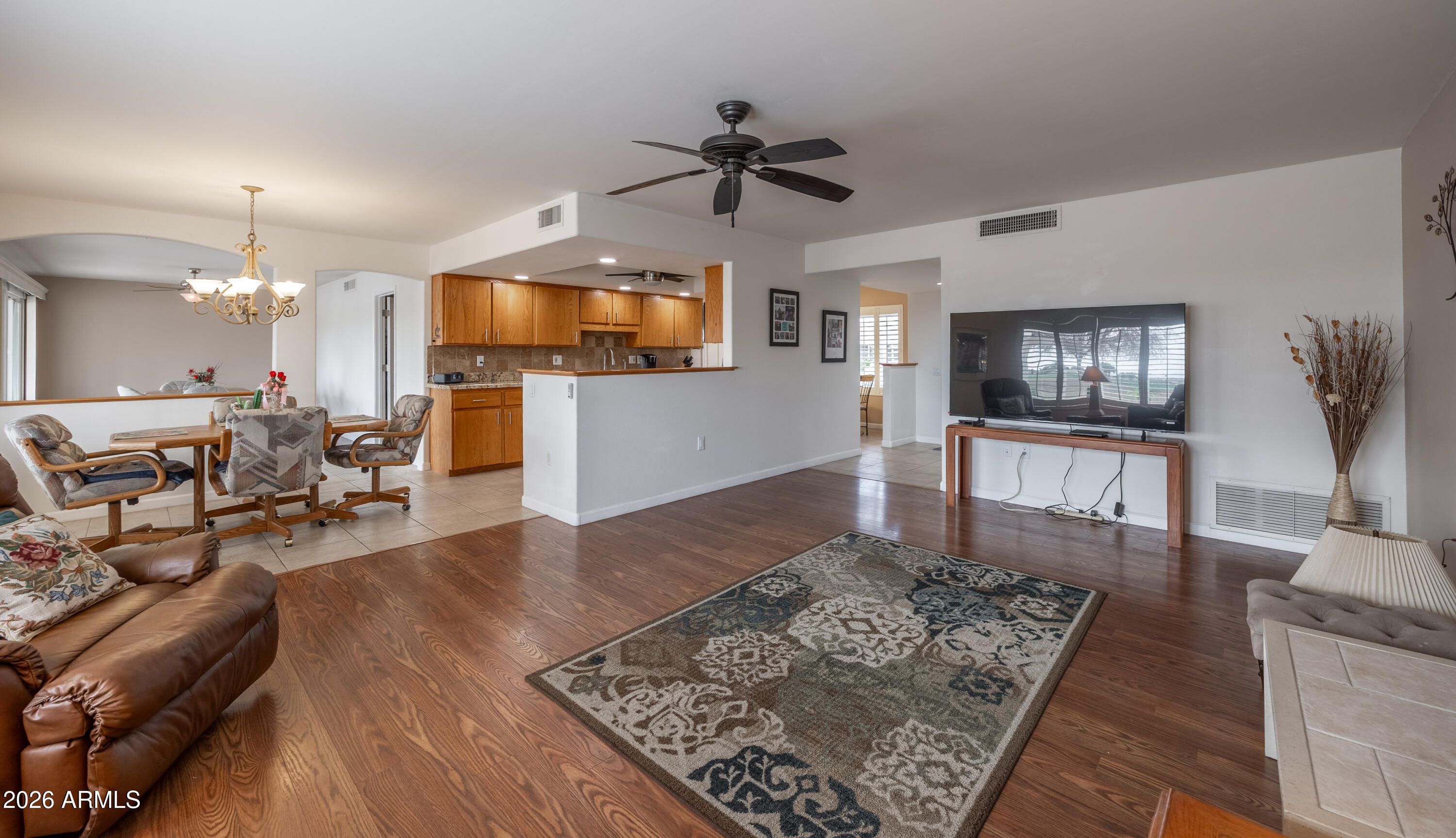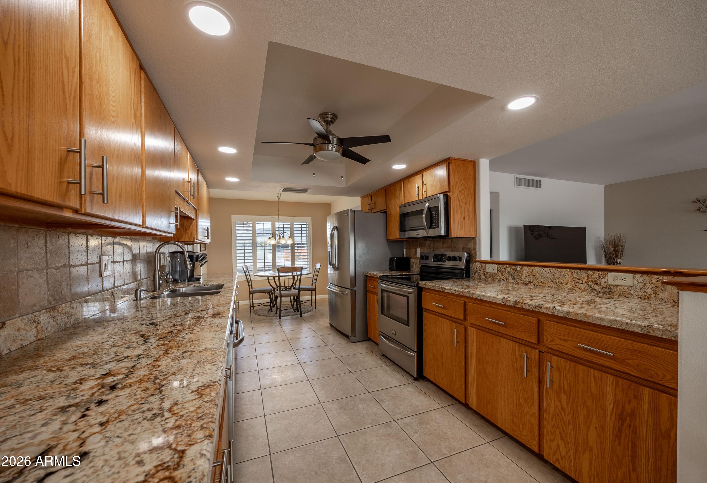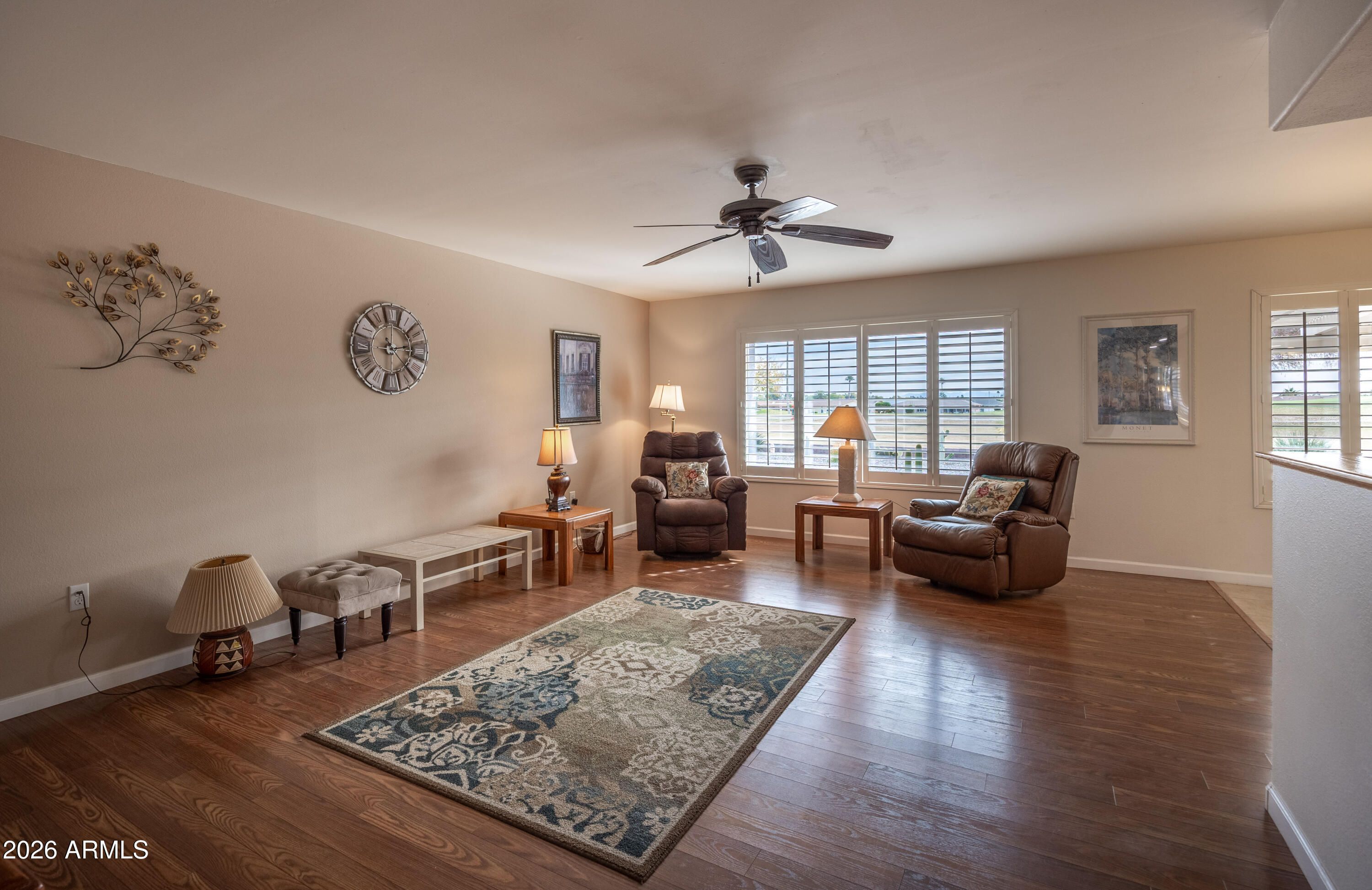GORGEOUS GOLF COURSE AND MOUNTAIN VIEWS! THE ARIZONA ROOM OPENS TO AN OVERSIZED BACKYARD WITH UNOBSTRUCTED FAIRWAY VISTAS AND AMPLE SPACE TO ENTERTAIN. A SPACIOUS COVERED PATIO W/ PAVERS, PROFESSIONAL LANDSCAPING, NEWER WINDOWS, AND PLANTATION SHUTTERS ALL ENHANCE THIS BEAUTIFULLY MAINTAINED HOME. LARGE PICTURE WINDOWS FILL THE INTERIOR WITH NATURAL LIGHT. THE KITCHEN OFFERS GENEROUS CABINET STORAGE, STAINLESS STEEL APPLIANCES, GRANITE COUNTERS, AND TWO DINING AREAS. THE MAIN BEDROOM FEATURES A CEILING FAN, WALK‑IN CLOSET, AND A 3/4 BATH PLUS A SEPARATE BEAUTY VANITY. SEE THIS HOME TODAY AND MAKE IT YOURS.