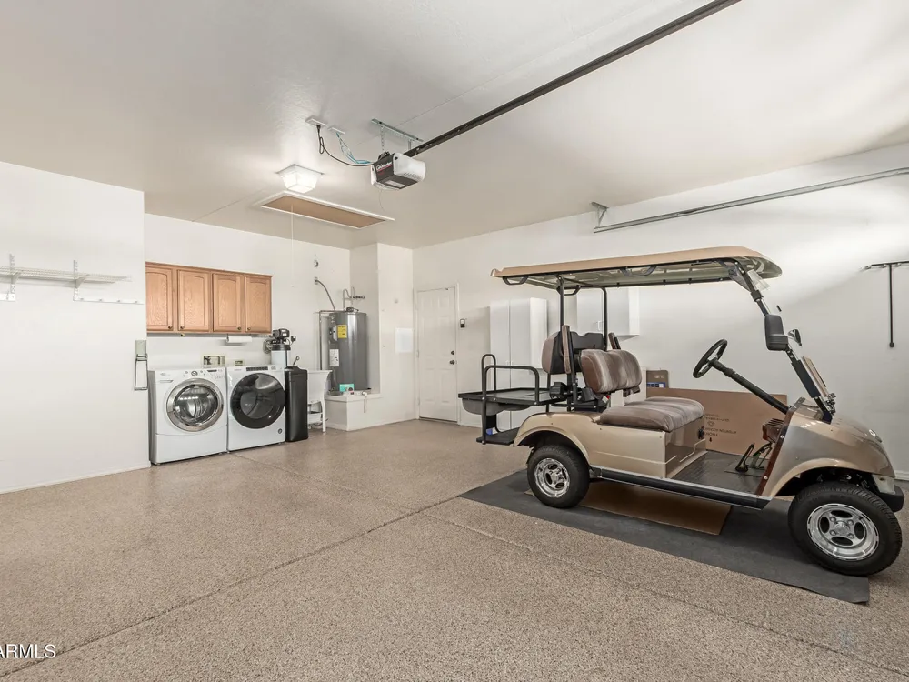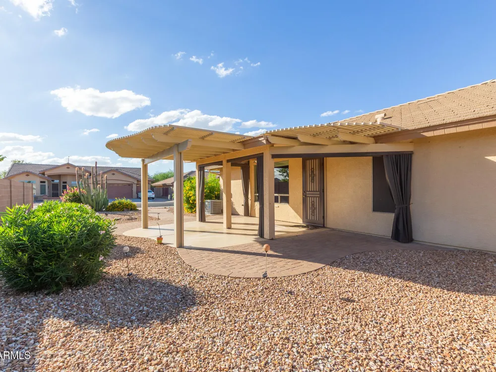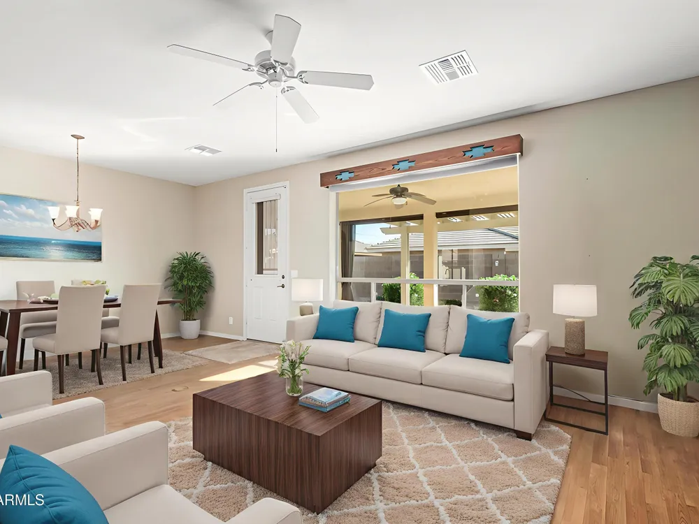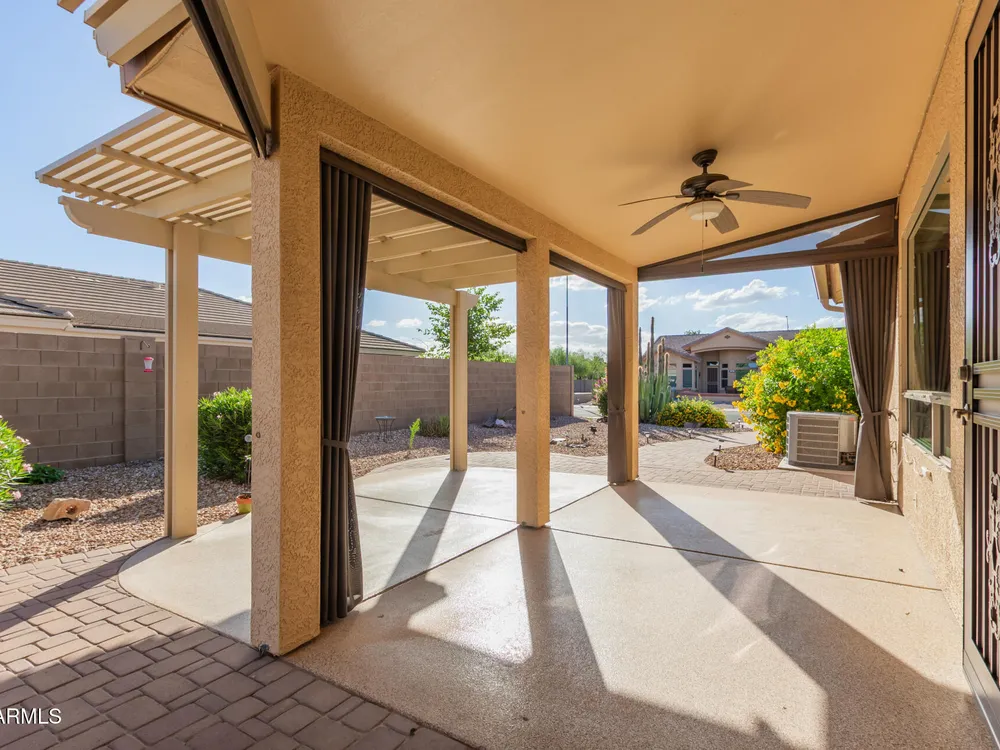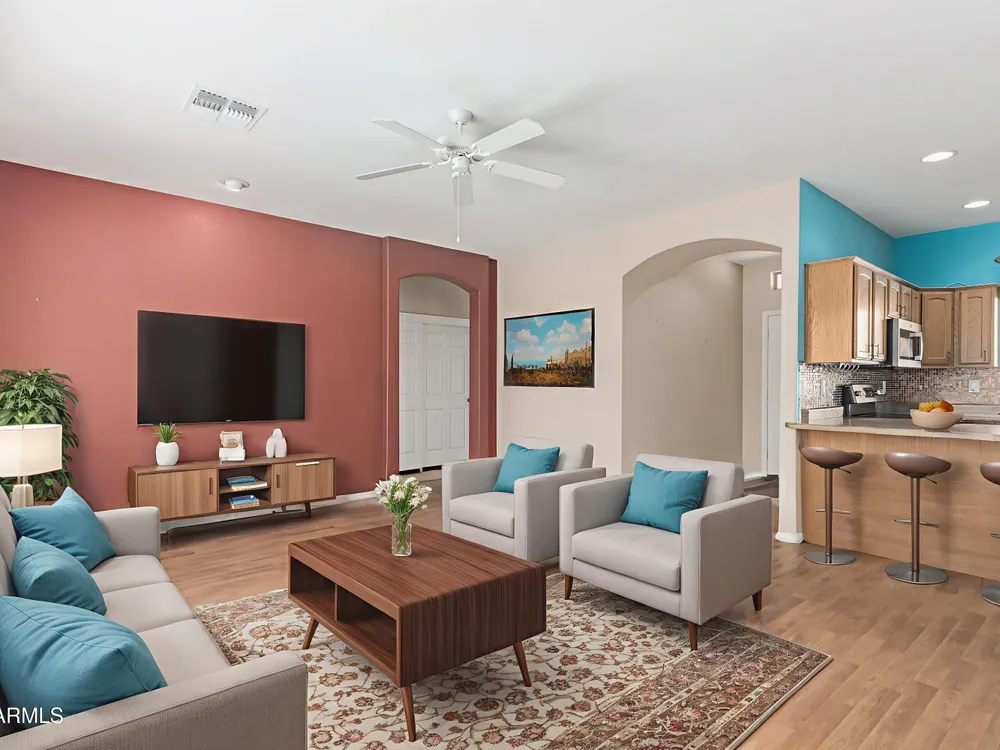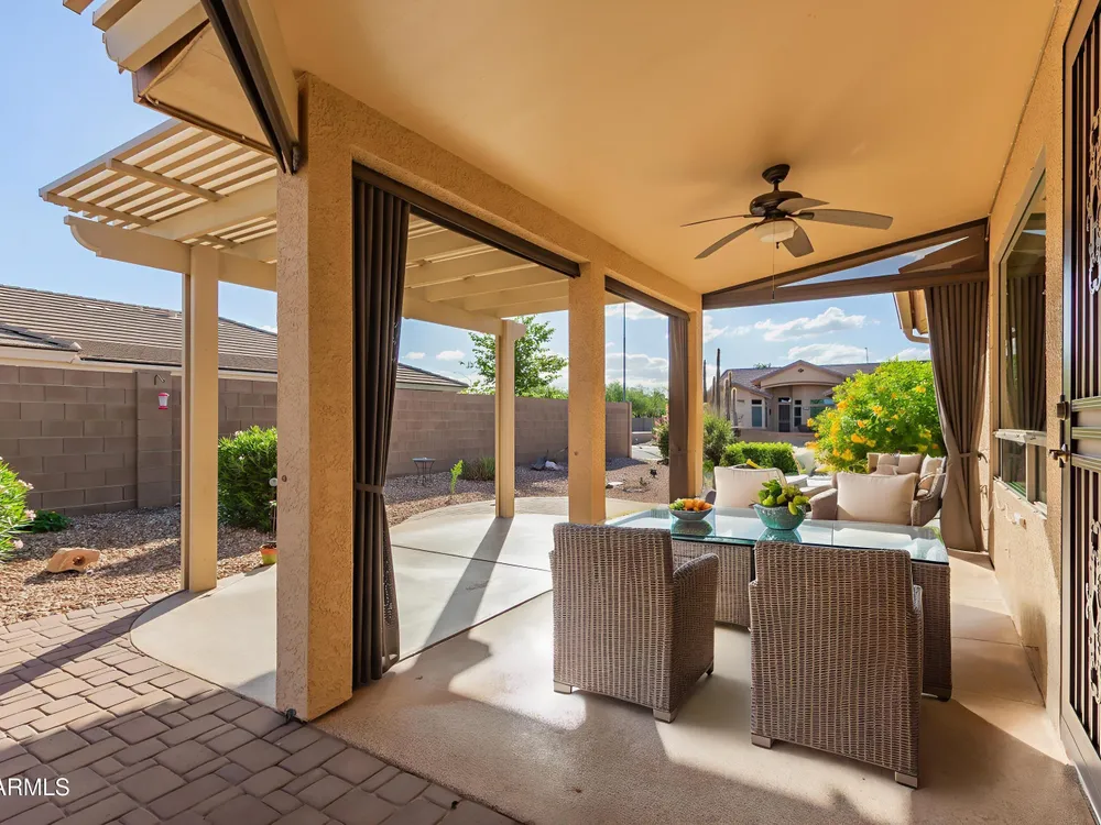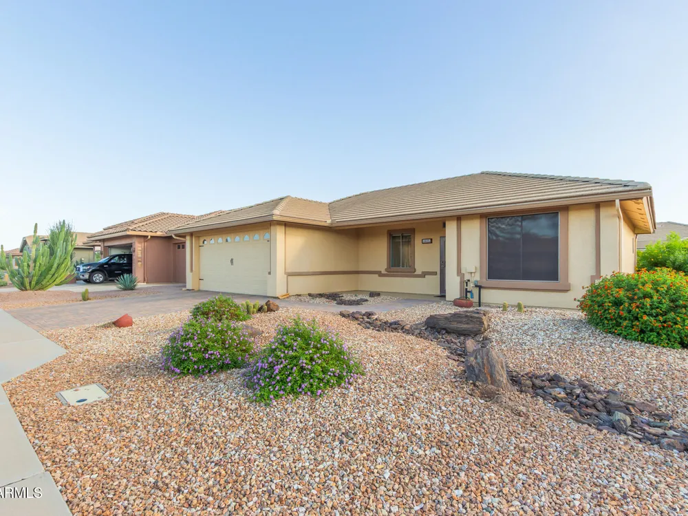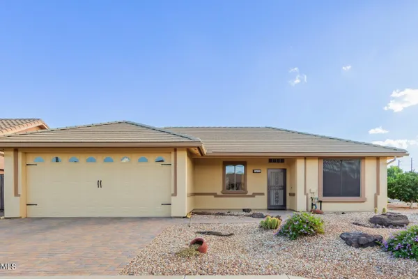 Welcome to Sunland Springs Village, a premier 55+ community where active adult living meets Southwest charm! This beautifully maintained home perfectly captures Arizona living, featuring 2 bedrooms, 2 baths, and an oversized 2-car garage complete with cabinetry, epoxy flooring, and a convenient laundry area. Step inside to discover a bright and inviting interior showcasing southwest color palette, high ceilings, and abundant natural light. With no carpet throughout, you'll appreciate the blend of tile and luxury vinyl plank flooring for both comfort and easy maintenance. The open great room design is ideal for entertaining, while the kitchen offers stainless steel appliances, a refrigerator, recessed lighting, pantry, roll-out shelves, a stunning a stunning copper tile and glass backsplash, and a peninsula breakfast bar for casual dining. The primary suite is your private retreat featuring a remodeled bathroom with quartz countertops, a step-in shower, and a walk-in closet. Thoughtful upgrades continue throughout: Bali honeycomb shades, solar sun screens, saltwater system, and decorative wrought iron security doors at both front and back. Enjoy the best of Arizona's outdoor living and sunsets with a paver driveway and patio, extended patio cover with elegant outdoor curtains, and plenty of space for relaxing or entertaining guests year-round. Located in a vibrant golf course community offering world-class amenities, including pools, fitness center, pickleball, tennis, and endless social clubs, this home invites you to live the active lifestyle you've always dreamed of!
