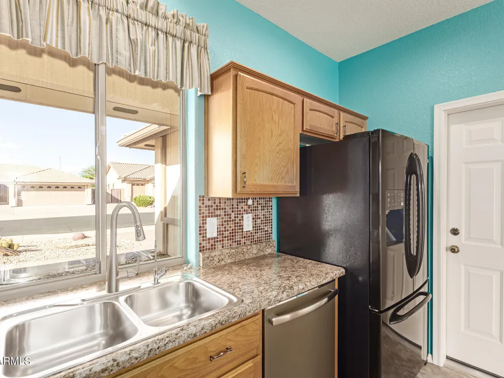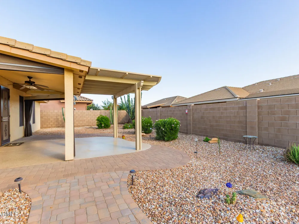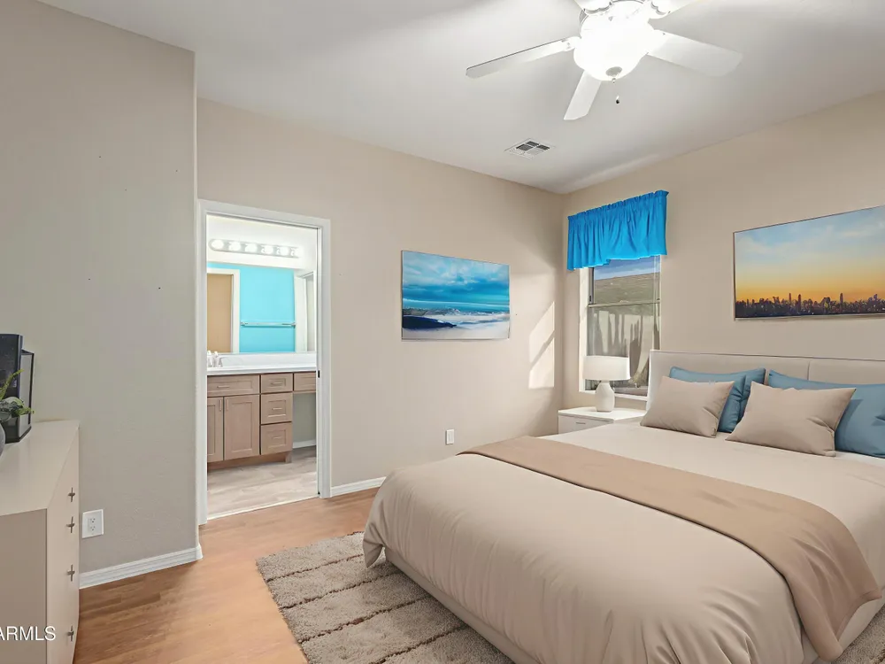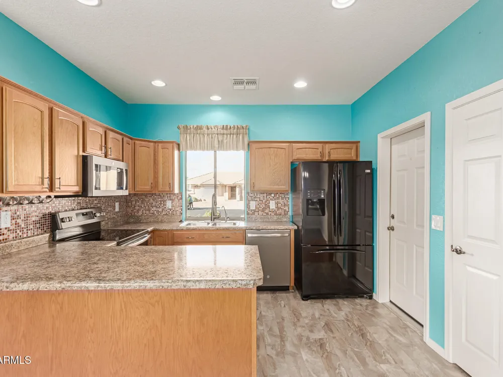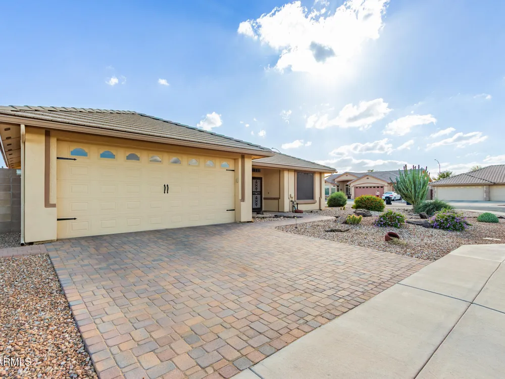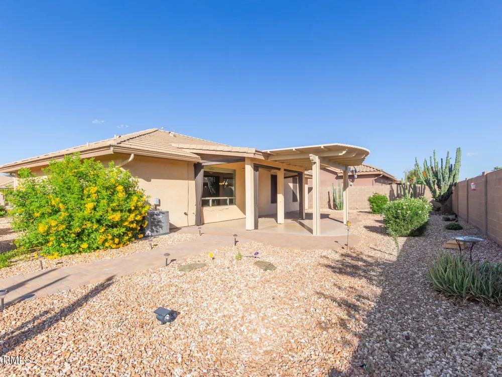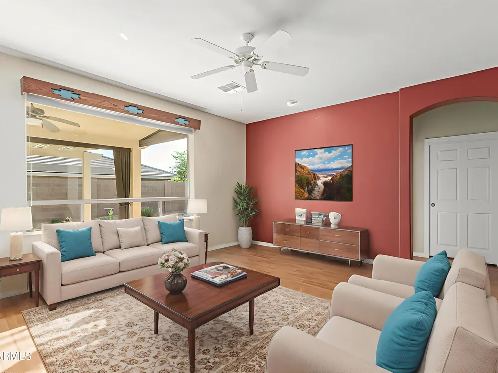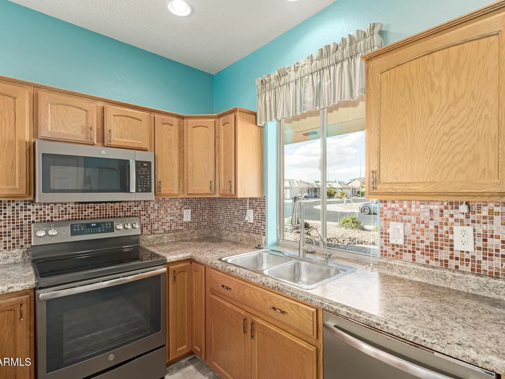 Welcome to Sunland Springs Village, a premier 55+ community where active adult living meets Southwest charm! This beautifully maintained home perfectly captures Arizona living, featuring 2 bedrooms, 2 baths, and an oversized 2-car garage complete with cabinetry, epoxy flooring, and a convenient laundry area. Step inside to discover a bright and inviting interior showcasing southwest color palette, high ceilings, and abundant natural light. With no carpet throughout, you'll appreciate the blend of tile and luxury vinyl plank flooring for both comfort and easy maintenance. The open great room design is ideal for entertaining, while the kitchen offers stainless steel appliances, a refrigerator, recessed lighting, pantry, roll-out shelves, a stunning a stunning copper tile and glass backsplash, and a peninsula breakfast bar for casual dining. The primary suite is your private retreat featuring a remodeled bathroom with quartz countertops, a step-in shower, and a walk-in closet. Thoughtful upgrades continue throughout: Bali honeycomb shades, solar sun screens, saltwater system, and decorative wrought iron security doors at both front and back. Enjoy the best of Arizona's outdoor living and sunsets with a paver driveway and patio, extended patio cover with elegant outdoor curtains, and plenty of space for relaxing or entertaining guests year-round. Located in a vibrant golf course community offering world-class amenities, including pools, fitness center, pickleball, tennis, and endless social clubs, this home invites you to live the active lifestyle you've always dreamed of!