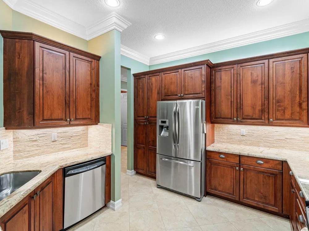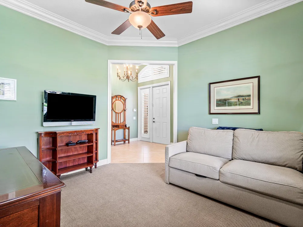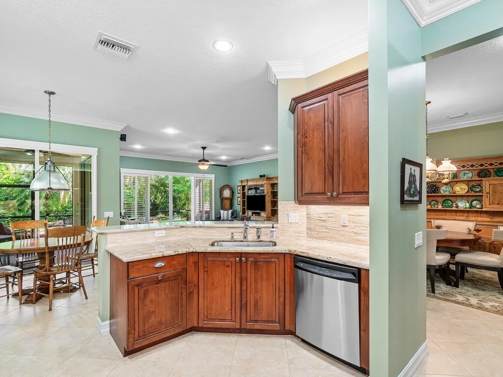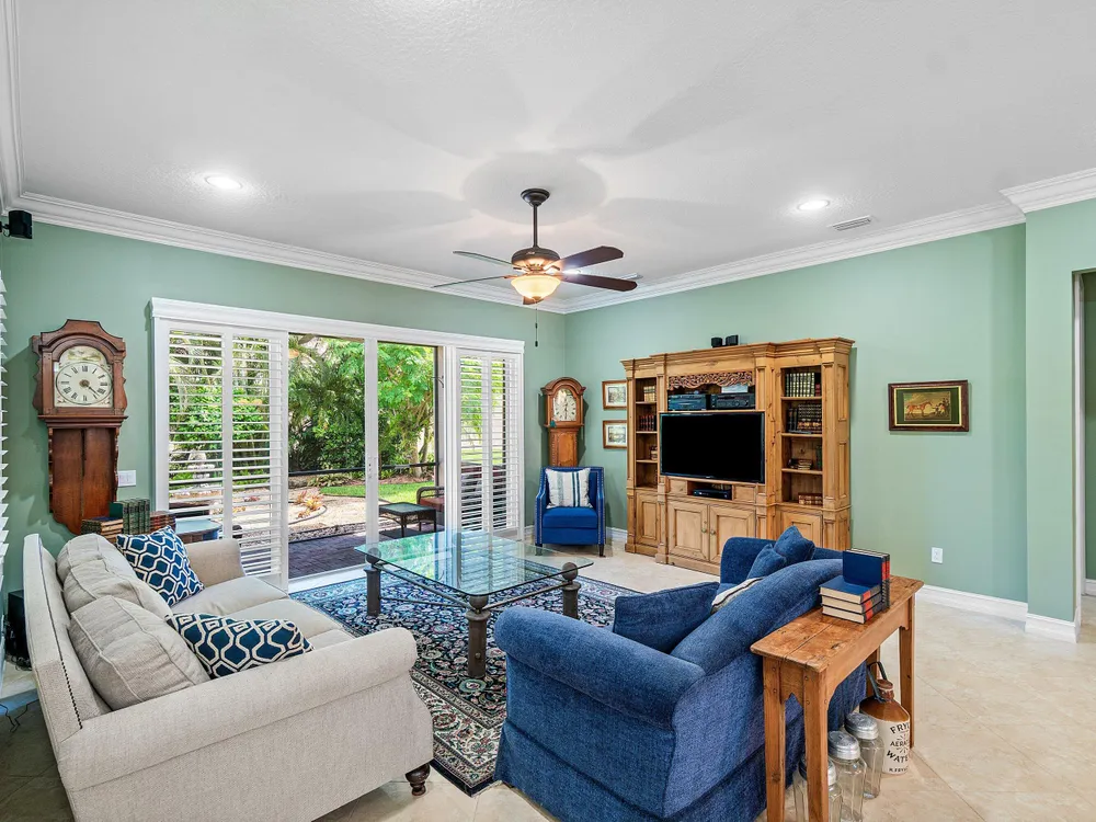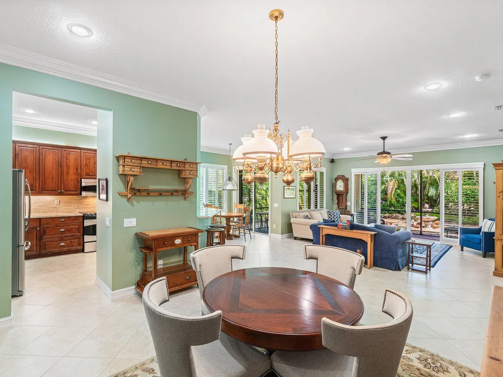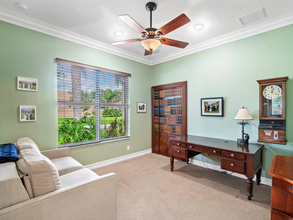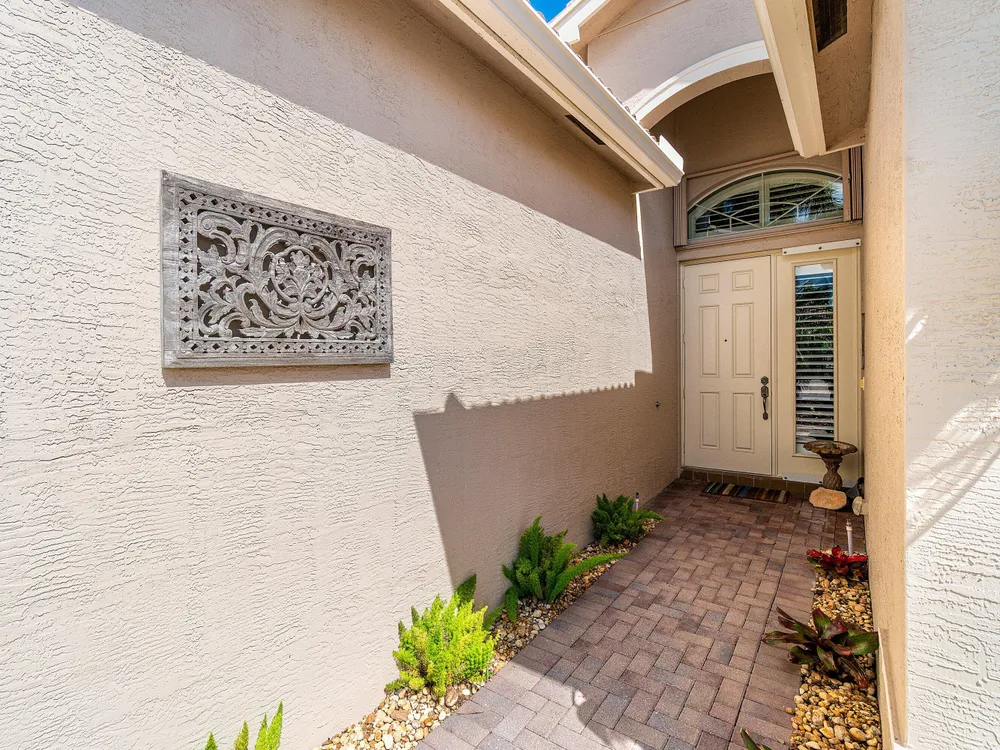 Charming Atlantic Grand features 2 bedrooms + den, 2.5 baths and a screen-enclosed patio overlooking a beautifully landscaped and private backyard with a partial water view. Upgrade highlights include neutral tile on the diagonal throughout main living areas and Den, tons of kitchen and bath upgrades, custom closet systems and upgraded vanities in the Primary suite, crown molding throughout, hi hats, plantation shutters, and accordion shutters. Please call for details on Valencia Reserve clubhouse renovations including renovation renderings. HOA Fee includes exterior painting of house, lawn care, alarm monitoring, cable and internet.