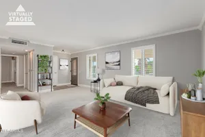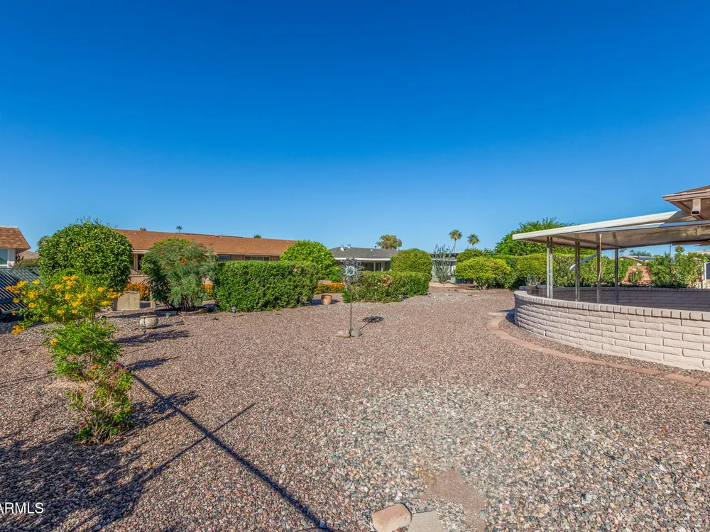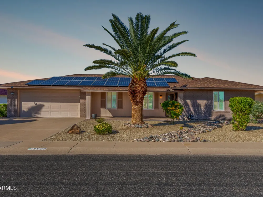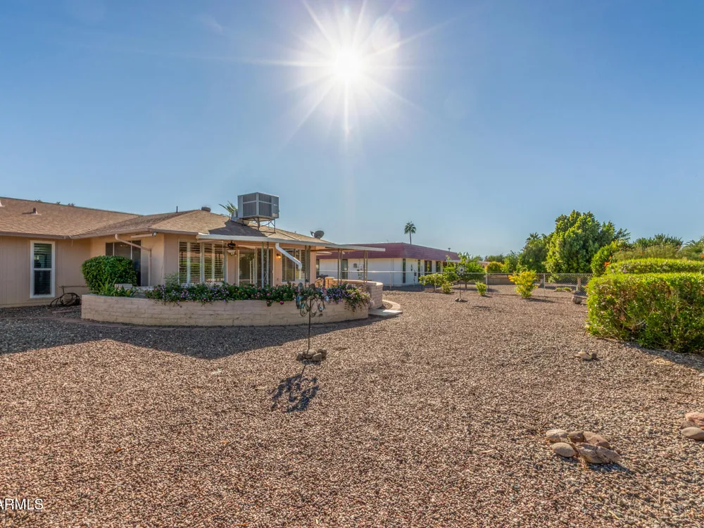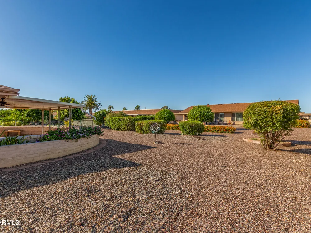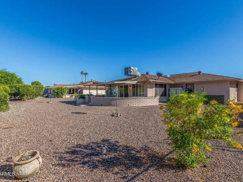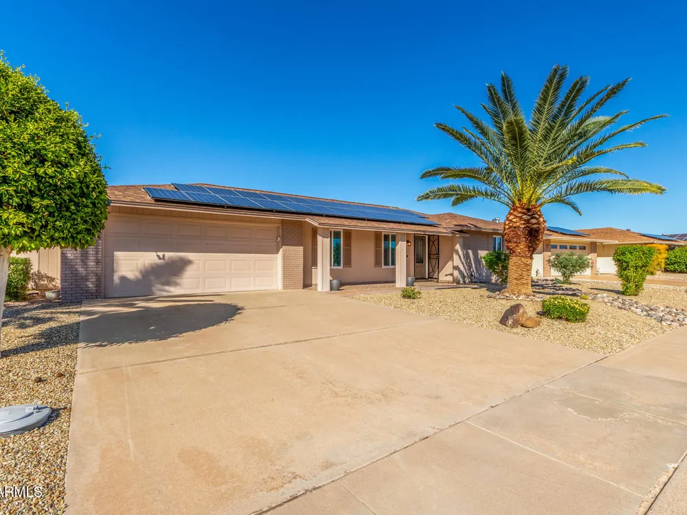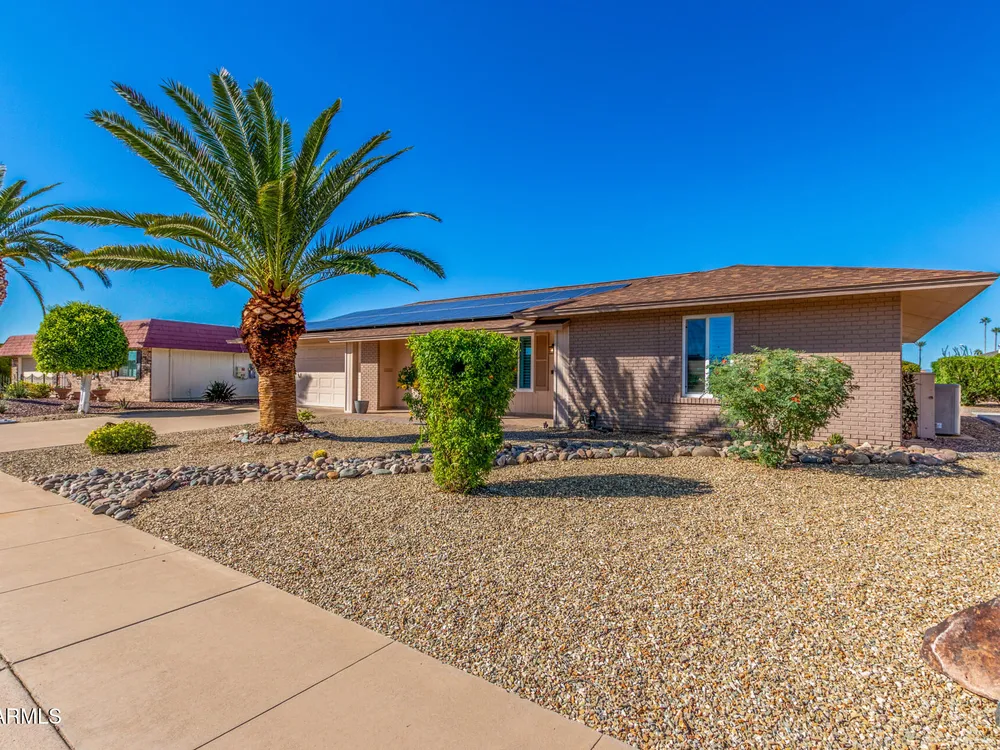 Discover the charm of this beautifully updated single-story home in Sun City! Blending comfort, style, and convenience, this gem offers 2 bedrooms, 2 bathrooms, and a 2-car garage. Recent upgrades include Brand New Windows (2025), New Front Door, and Solar with a small balance for energy savings. Inside, enjoy spacious and inviting living areas with wood-look flooring, carpet in all the right places, plantation shutters, crown molding, 4-inch trim, and soothing neutral tones. The galley-style kitchen impresses with shaker cabinets, tile backsplash, quartz countertops, all appliances included and a convenient pass-through breakfast bar. The primary suite features mirrored closet doors and a full ensuite bath, perfect for rest and relaxation. Step outside to a private retreat an extended covered patio with a ceiling fan, sun shade, pavers, and tile flooring. The low-maintenance backyard offers a storage shed, knee wall, and tranquil landscaping. The 2-car garage includes built-in cabinetry, a Big Horn Safe, and laundry area for convenience. The exterior was freshly painted in 2022. Enjoy all that this vibrant 55+ Sun City community has to offer: pools, spa, golf, tennis, media room, and a wide range of activities that make every day feel like a getaway. Don't miss this charming home!