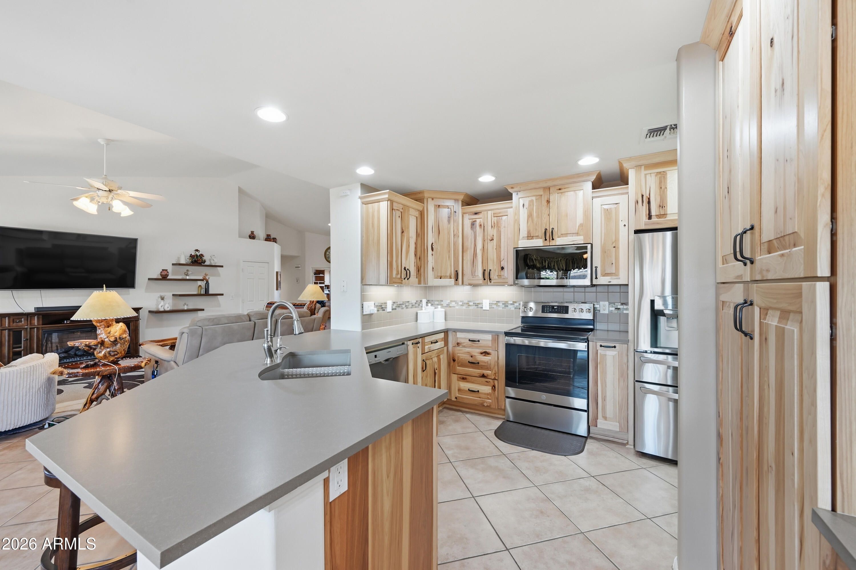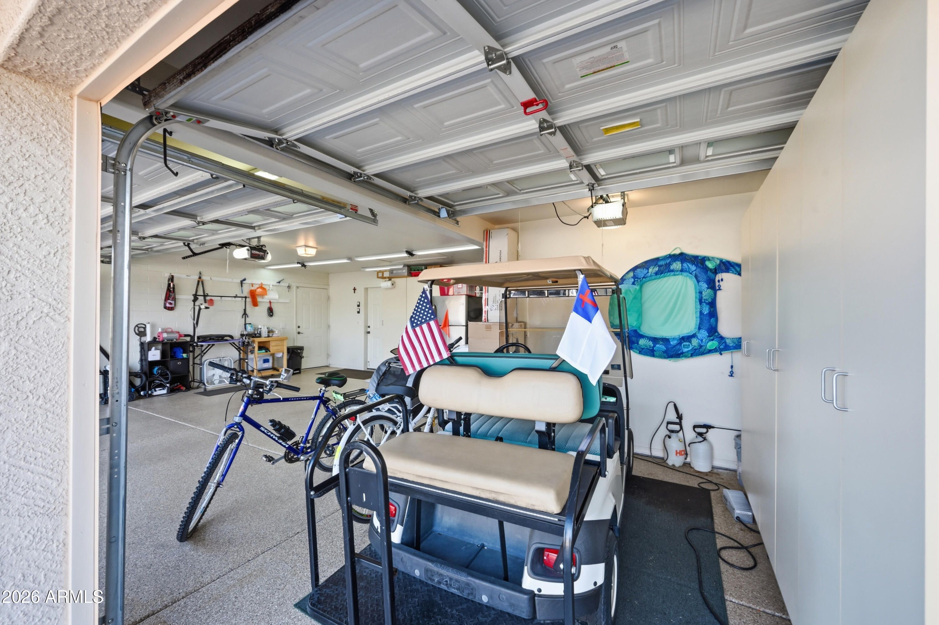 A dream kitchen awaits you in this 1989 SF, 2 bedroom, plus den home. Bonus features 2.5 baths, a golf garage, and beautiful fully fenced yard! What is not to love! Enjoy easy living in this recently updated and well-maintained home. You won't want to miss the renovated kitchen designed with entertaining in mind. The high-end hickory cabinets feature full-extension roll-out shelving, rotating pantry and quartz countertops. Fresh paint in the interior offers a light and refreshed feel, while the vaulted ceiling in the living room creates a bright open living space. This popular floor plan includes a roll-in shower for added accessibility and a bidet. Plantation shutters and remote honeycomb blinds provide window coverings with attention to comfort and convenience. Spacious 2-car garage with built-in cabinets and a 12' by 10' golf cart garage with 8' door. Situated on a corner lot with low-maintenance landscaping and a designer backyard water fountain, this home is perfect for relaxing and entertaining. Key highlights of newer items- Kitchen renovated 2025 Newer appliances 2022-2025 Primary bathroom updated 2025 New water heater 2024 New water softener 2025 New air handler motor 2024 You will want to see this in person and make it your home.