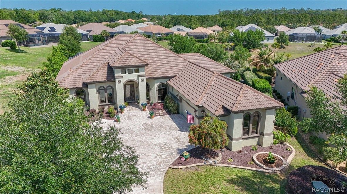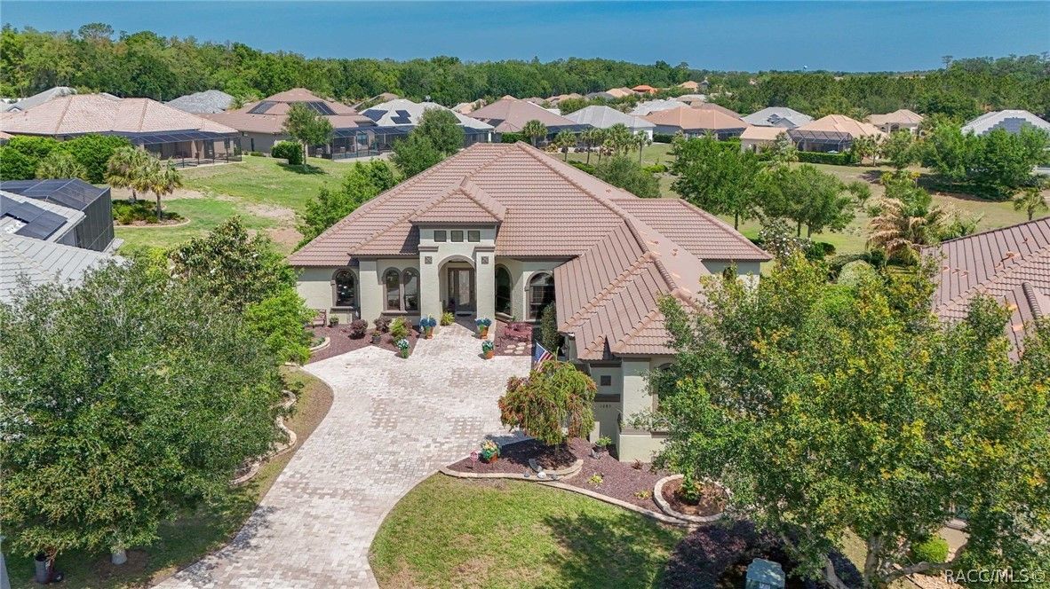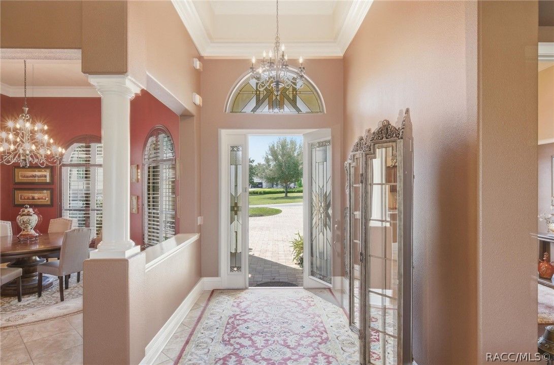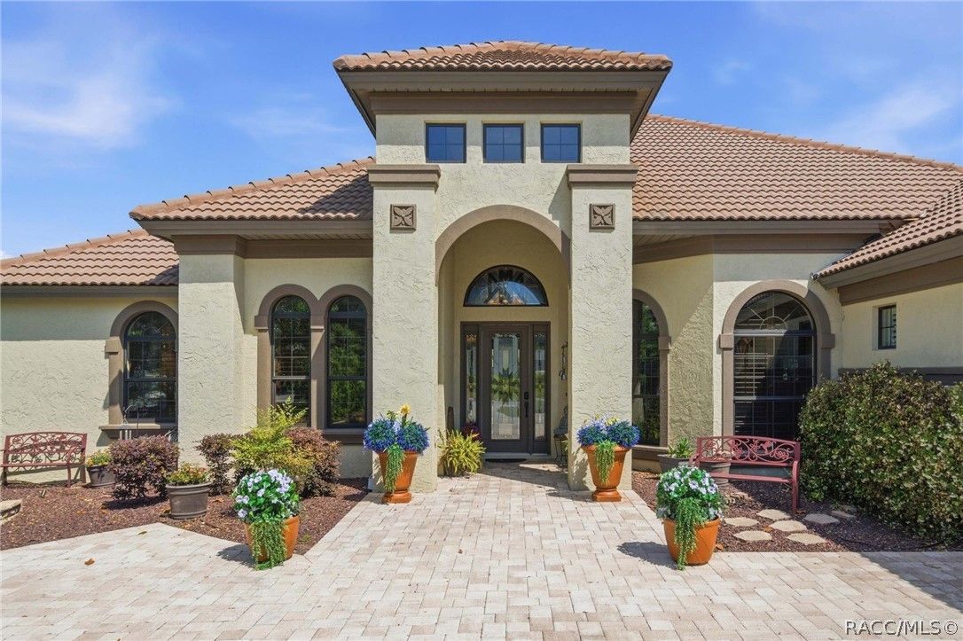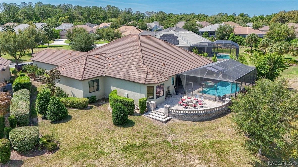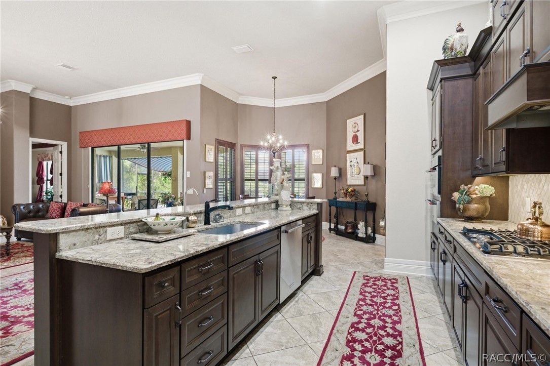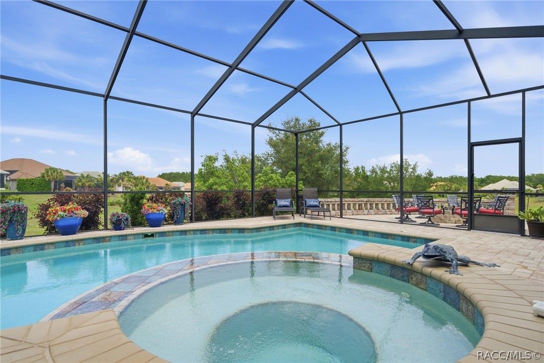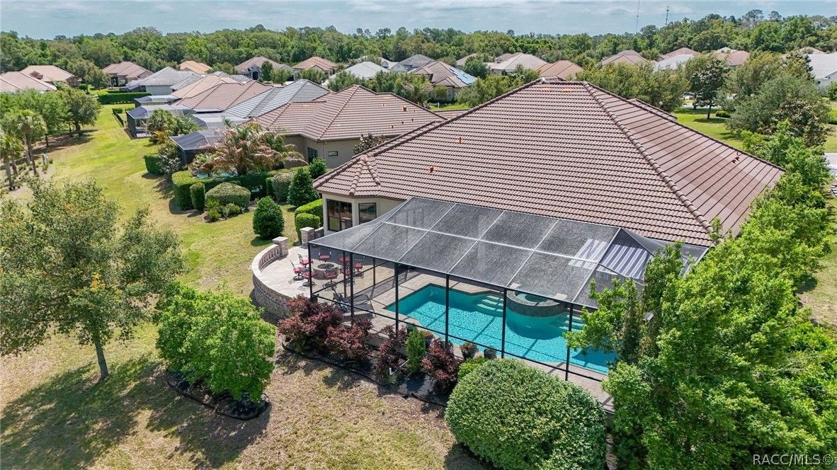 Imagine living in a masterfully crafted luxury home, where grand architectural details and resort-style living converge on an exceptional 0.36 acre lot. A wide paver driveway and lush tropical landscaping set the stage before you step through custom glass-and-leaded-transom entry doors into a welcoming foyer adorned with decorative columns, a tray ceiling, and a sparkling chandelier. This sophisticated entry features a wet bar- the perfect station for welcoming guests and serving beverages as they arrive, creating an effortless entertaining experience from the moment they enter. The expansive open floor plan seamlessly connects formal and casual living spaces into the chef's kitchen, which is nothing short of spectacular — featuring tall custom dark wood cabinetry, granite countertops, a gas cooktop with custom hood, KitchenAid double wall ovens, large stainless refrigerator, an island with seating for four, travertine diamond backsplash, and an enormous butler's pantry. The spacious great room with soaring ceilings opens to the entire living and kitchen area, making it the true heart of the home. This three-bedroom, four-and-a-half-bath home features two generous primary suites positioned on opposite sides of the residence; ideal for guests, multi-generational living, or personal preference. Each primary suite includes hardwood flooring, sitting areas, bay windows with plantation shutters, walk-in closets, and luxurious en-suite bathrooms with dual vanities and beautifully tiled walk-in showers. The third bedroom suite accommodates guests with grace. Additional highlights include a private home office with high ceilings, and an impressive craft room with full custom cabinetry, utility sink, built-in desk and dedicated laundry area; an amazing workspace for hobbies and projects. Crown molding, custom windows, recessed lighting, and tile floors throughout, complete the interior of this exceptional home. An oversized 3-car garage offers dedicated golf cart parking and tons of overhead storage. Outside, the resort-style backyard is an entertainer's paradise. A stunning screened-in lanai with sparkling pool and spa, also features an outdoor kitchen with built-in Coyote grill, granite counters and backsplash, perfect for al fresco dining. A curved stone balustrade terrace with a large gas fire pit overlooks serene, manicured green space. Located in Terra Vista at Citrus Hills, this home offers access to world-class resort-style amenities including championship golf courses, a state-of-the-art fitness center and spa, resort-style pools, tennis and pickleball courts, fine dining, and an active lifestyle in this highly sought after gated community. This exceptional property represents outstanding value; offering unparalleled quality at a price that truly reflects the remarkable opportunity before you.