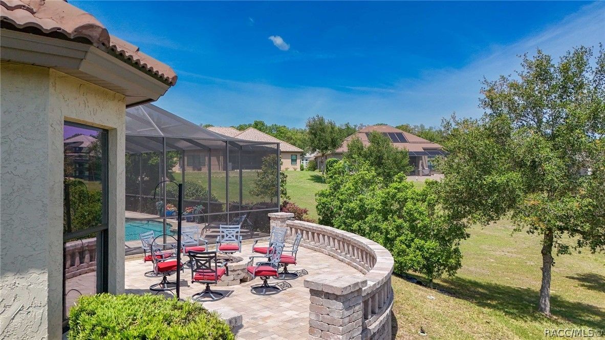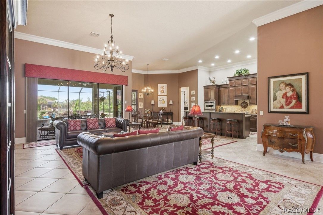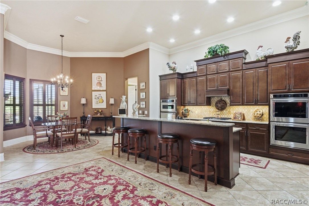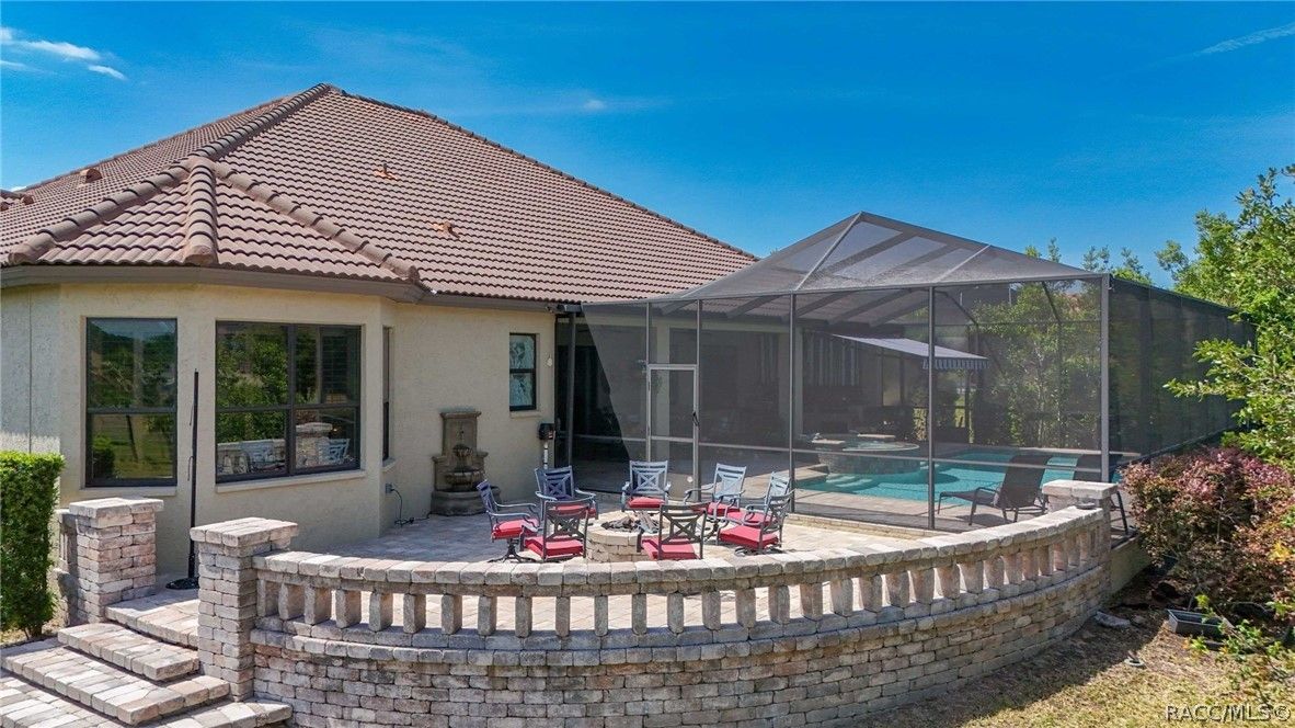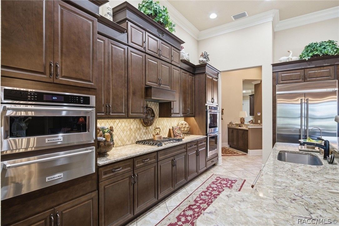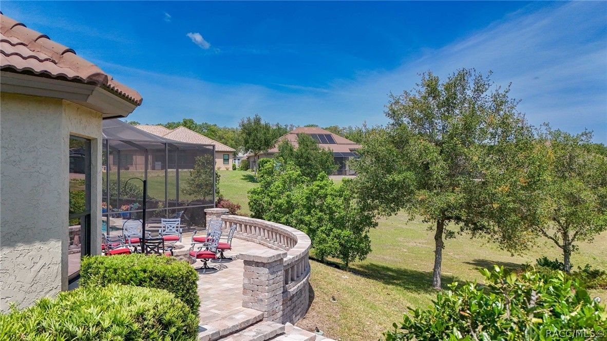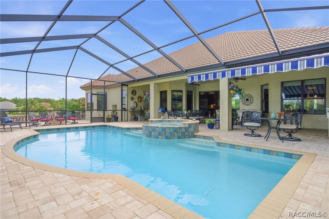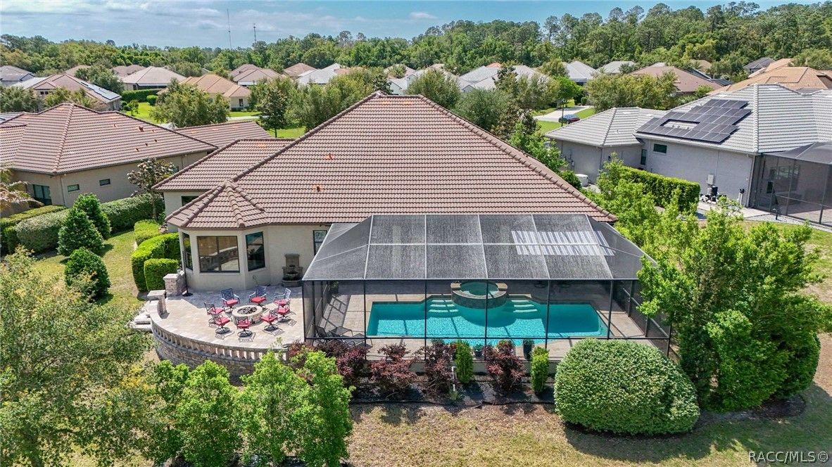 Imagine living in a masterfully crafted luxury home, where grand architectural details and resort-style living converge on an exceptional 0.36 acre lot. A wide paver driveway and lush tropical landscaping set the stage before you step through custom glass-and-leaded-transom entry doors into a welcoming foyer adorned with decorative columns, a tray ceiling, and a sparkling chandelier. This sophisticated entry features a wet bar- the perfect station for welcoming guests and serving beverages as they arrive, creating an effortless entertaining experience from the moment they enter. The expansive open floor plan seamlessly connects formal and casual living spaces into the chef's kitchen, which is nothing short of spectacular — featuring tall custom dark wood cabinetry, granite countertops, a gas cooktop with custom hood, KitchenAid double wall ovens, large stainless refrigerator, an island with seating for four, travertine diamond backsplash, and an enormous butler's pantry. The spacious great room with soaring ceilings opens to the entire living and kitchen area, making it the true heart of the home. This three-bedroom, four-and-a-half-bath home features two generous primary suites positioned on opposite sides of the residence; ideal for guests, multi-generational living, or personal preference. Each primary suite includes hardwood flooring, sitting areas, bay windows with plantation shutters, walk-in closets, and luxurious en-suite bathrooms with dual vanities and beautifully tiled walk-in showers. The third bedroom suite accommodates guests with grace. Additional highlights include a private home office with high ceilings, and an impressive craft room with full custom cabinetry, utility sink, built-in desk and dedicated laundry area; an amazing workspace for hobbies and projects. Crown molding, custom windows, recessed lighting, and tile floors throughout, complete the interior of this exceptional home. An oversized 3-car garage offers dedicated golf cart parking and tons of overhead storage. Outside, the resort-style backyard is an entertainer's paradise. A stunning screened-in lanai with sparkling pool and spa, also features an outdoor kitchen with built-in Coyote grill, granite counters and backsplash, perfect for al fresco dining. A curved stone balustrade terrace with a large gas fire pit overlooks serene, manicured green space. Located in Terra Vista at Citrus Hills, this home offers access to world-class resort-style amenities including championship golf courses, a state-of-the-art fitness center and spa, resort-style pools, tennis and pickleball courts, fine dining, and an active lifestyle in this highly sought after gated community. This exceptional property represents outstanding value; offering unparalleled quality at a price that truly reflects the remarkable opportunity before you.