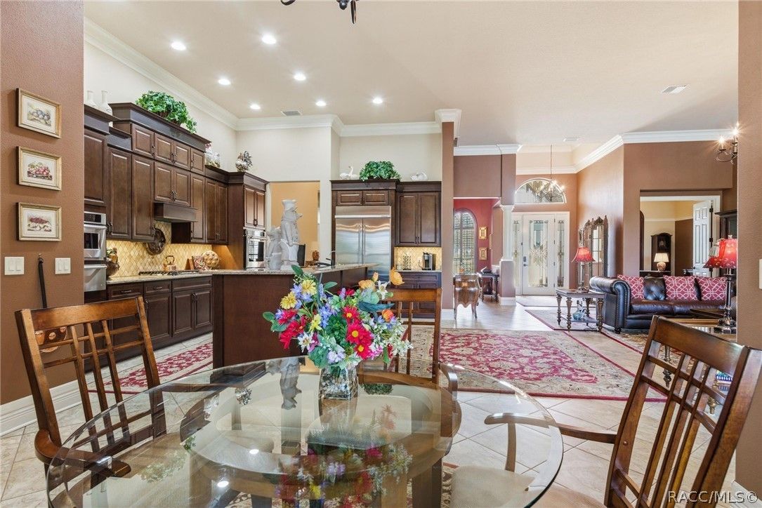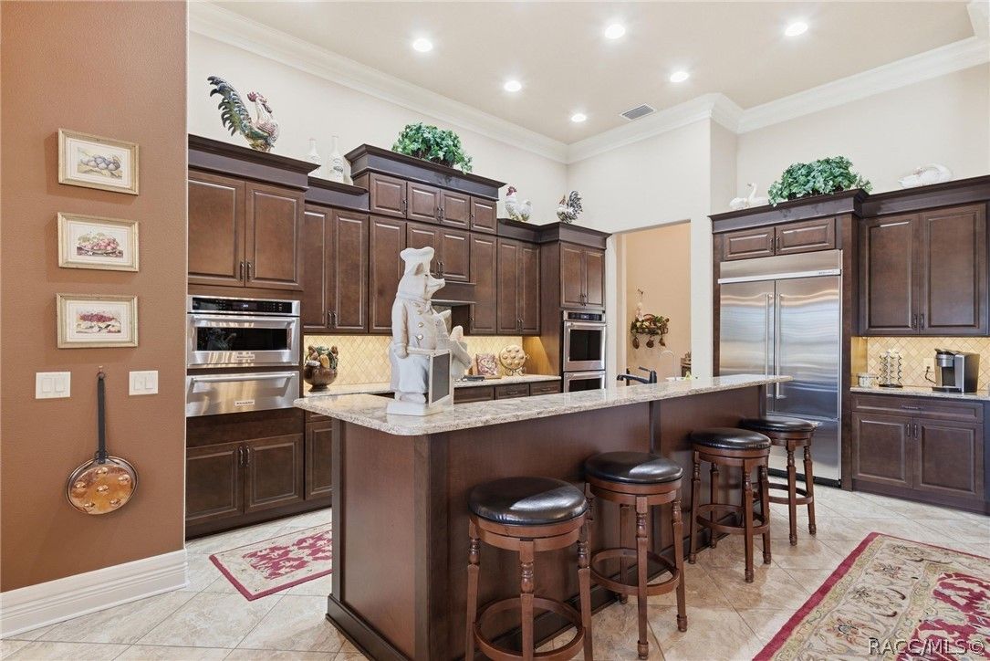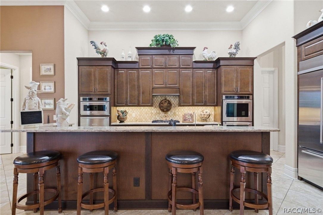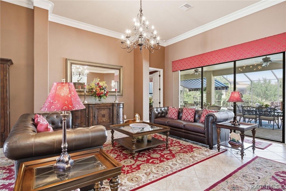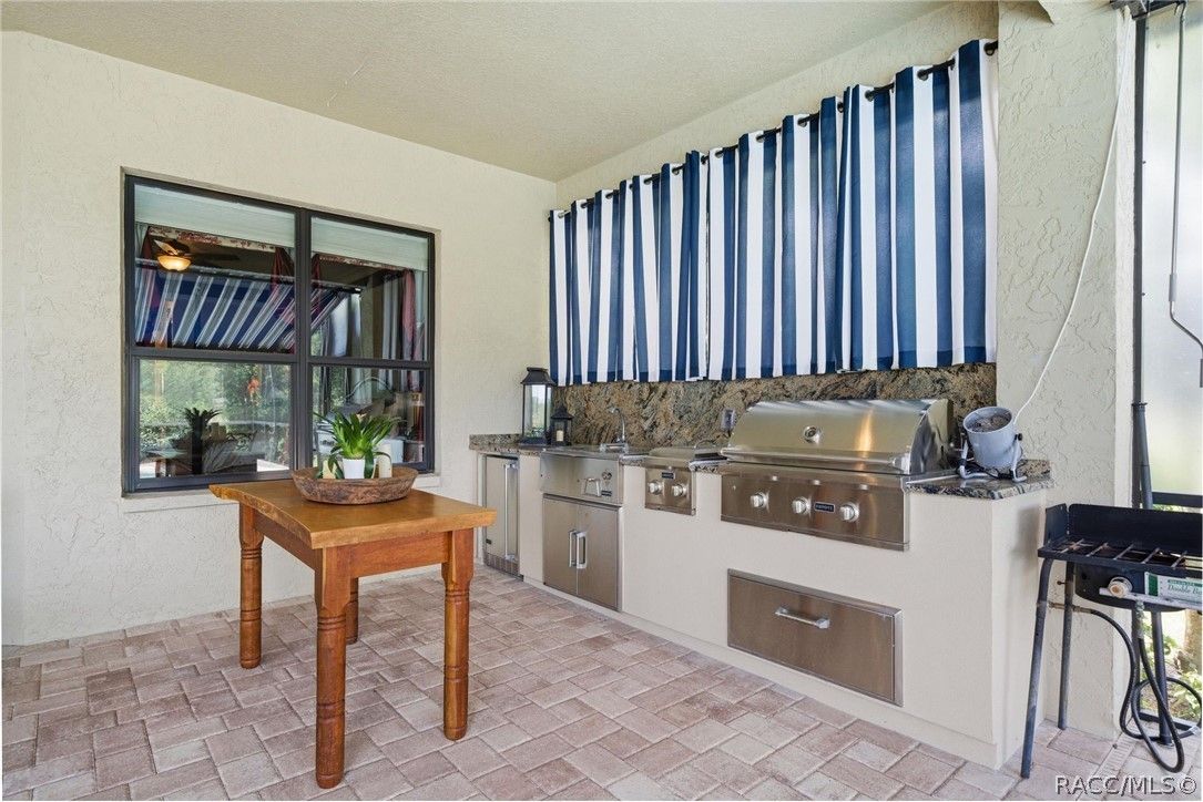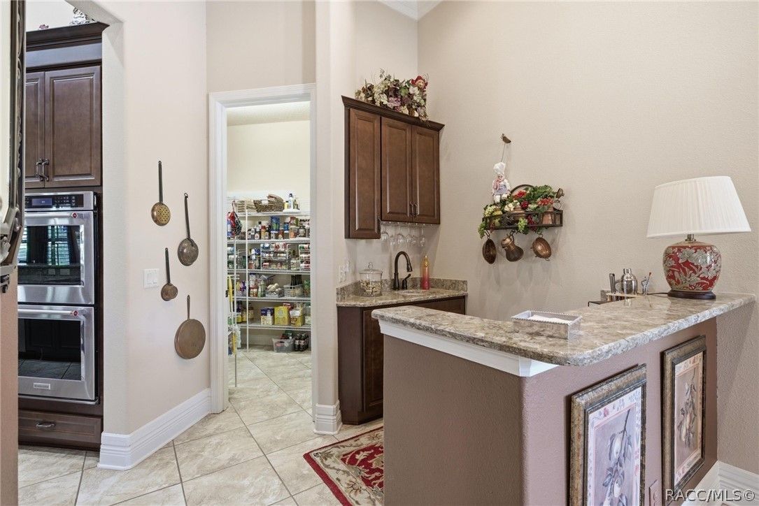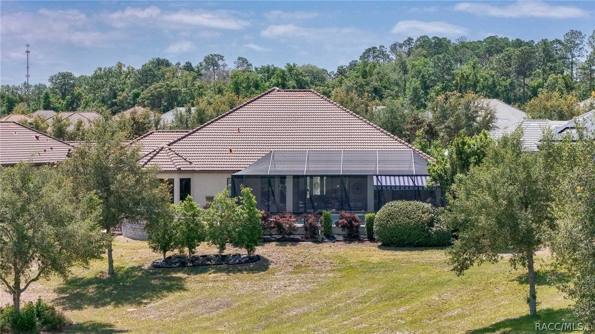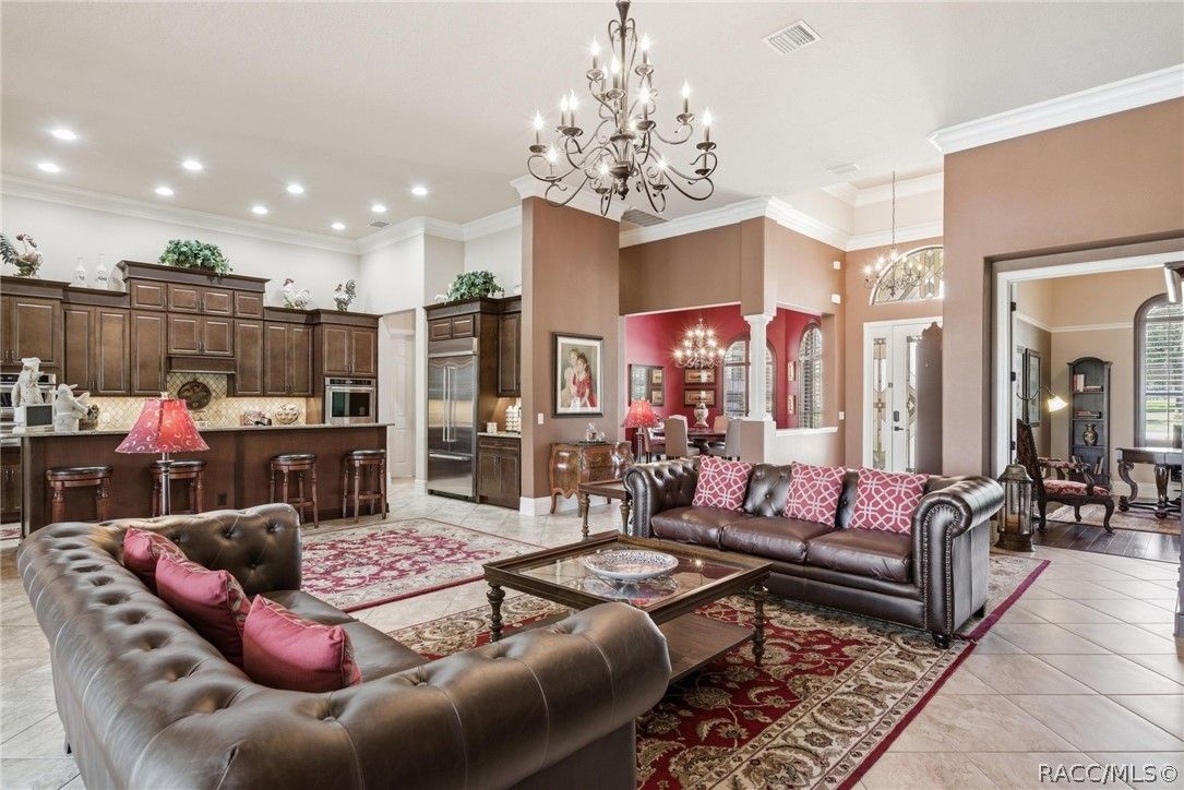 Imagine living in a masterfully crafted luxury home, where grand architectural details and resort-style living converge on an exceptional 0.36 acre lot. A wide paver driveway and lush tropical landscaping set the stage before you step through custom glass-and-leaded-transom entry doors into a welcoming foyer adorned with decorative columns, a tray ceiling, and a sparkling chandelier. This sophisticated entry features a wet bar- the perfect station for welcoming guests and serving beverages as they arrive, creating an effortless entertaining experience from the moment they enter. The expansive open floor plan seamlessly connects formal and casual living spaces into the chef's kitchen, which is nothing short of spectacular — featuring tall custom dark wood cabinetry, granite countertops, a gas cooktop with custom hood, KitchenAid double wall ovens, large stainless refrigerator, an island with seating for four, travertine diamond backsplash, and an enormous butler's pantry. The spacious great room with soaring ceilings opens to the entire living and kitchen area, making it the true heart of the home. This three-bedroom, four-and-a-half-bath home features two generous primary suites positioned on opposite sides of the residence; ideal for guests, multi-generational living, or personal preference. Each primary suite includes hardwood flooring, sitting areas, bay windows with plantation shutters, walk-in closets, and luxurious en-suite bathrooms with dual vanities and beautifully tiled walk-in showers. The third bedroom suite accommodates guests with grace. Additional highlights include a private home office with high ceilings, and an impressive craft room with full custom cabinetry, utility sink, built-in desk and dedicated laundry area; an amazing workspace for hobbies and projects. Crown molding, custom windows, recessed lighting, and tile floors throughout, complete the interior of this exceptional home. An oversized 3-car garage offers dedicated golf cart parking and tons of overhead storage. Outside, the resort-style backyard is an entertainer's paradise. A stunning screened-in lanai with sparkling pool and spa, also features an outdoor kitchen with built-in Coyote grill, granite counters and backsplash, perfect for al fresco dining. A curved stone balustrade terrace with a large gas fire pit overlooks serene, manicured green space. Located in Terra Vista at Citrus Hills, this home offers access to world-class resort-style amenities including championship golf courses, a state-of-the-art fitness center and spa, resort-style pools, tennis and pickleball courts, fine dining, and an active lifestyle in this highly sought after gated community. This exceptional property represents outstanding value; offering unparalleled quality at a price that truly reflects the remarkable opportunity before you.