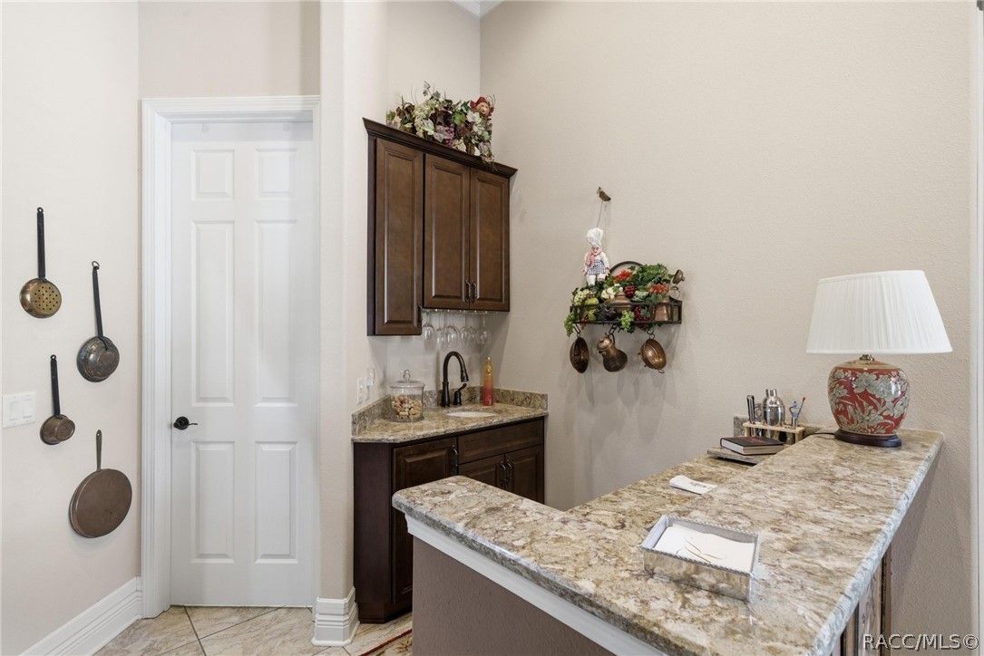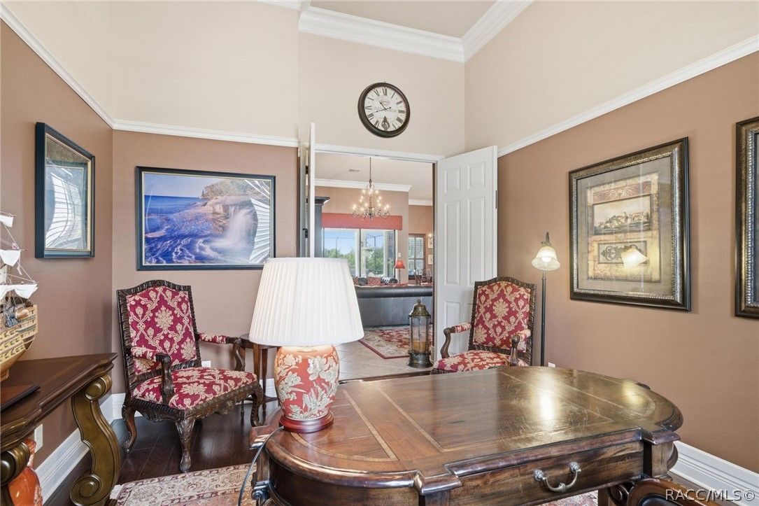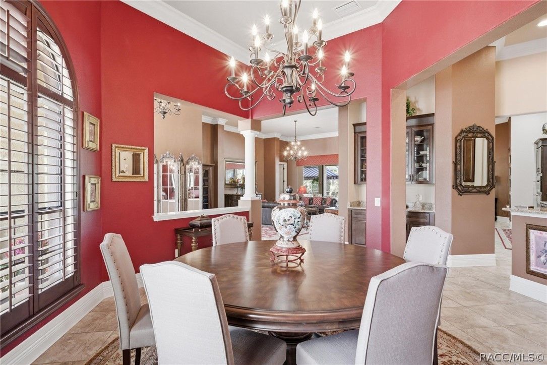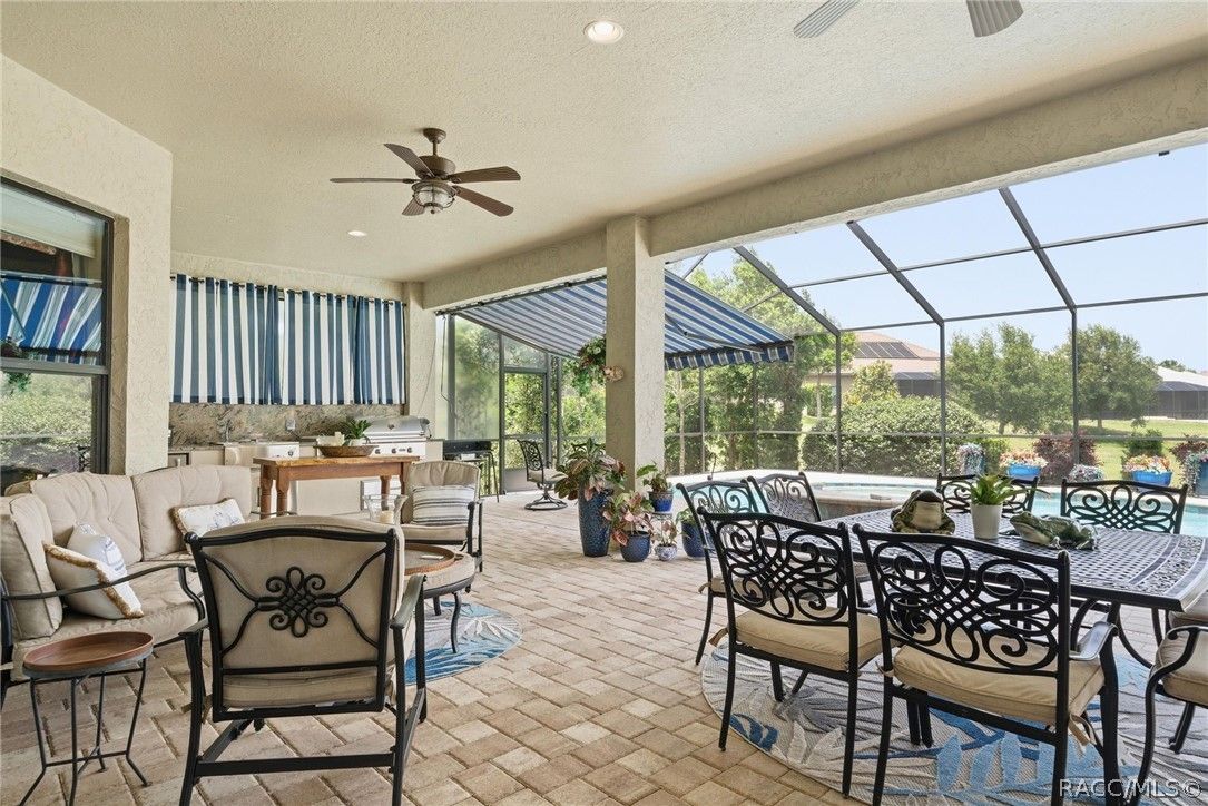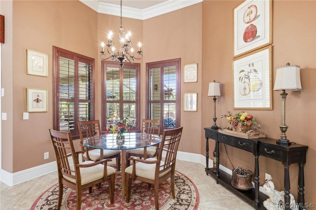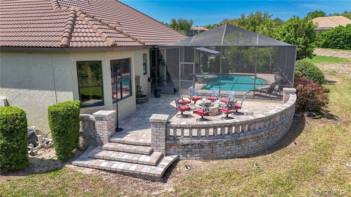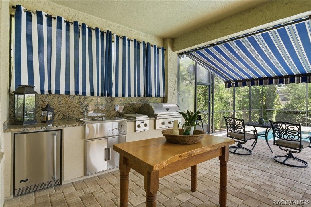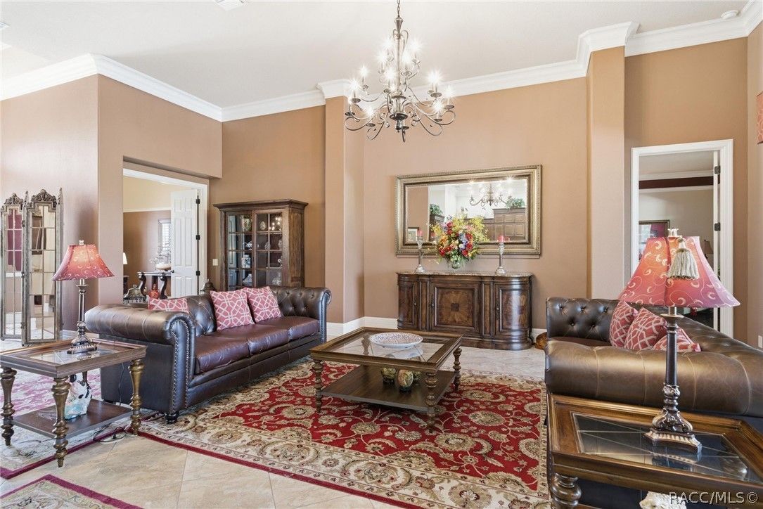 Imagine living in a masterfully crafted luxury home, where grand architectural details and resort-style living converge on an exceptional 0.36 acre lot. A wide paver driveway and lush tropical landscaping set the stage before you step through custom glass-and-leaded-transom entry doors into a welcoming foyer adorned with decorative columns, a tray ceiling, and a sparkling chandelier. This sophisticated entry features a wet bar- the perfect station for welcoming guests and serving beverages as they arrive, creating an effortless entertaining experience from the moment they enter. The expansive open floor plan seamlessly connects formal and casual living spaces into the chef's kitchen, which is nothing short of spectacular — featuring tall custom dark wood cabinetry, granite countertops, a gas cooktop with custom hood, KitchenAid double wall ovens, large stainless refrigerator, an island with seating for four, travertine diamond backsplash, and an enormous butler's pantry. The spacious great room with soaring ceilings opens to the entire living and kitchen area, making it the true heart of the home. This three-bedroom, four-and-a-half-bath home features two generous primary suites positioned on opposite sides of the residence; ideal for guests, multi-generational living, or personal preference. Each primary suite includes hardwood flooring, sitting areas, bay windows with plantation shutters, walk-in closets, and luxurious en-suite bathrooms with dual vanities and beautifully tiled walk-in showers. The third bedroom suite accommodates guests with grace. Additional highlights include a private home office with high ceilings, and an impressive craft room with full custom cabinetry, utility sink, built-in desk and dedicated laundry area; an amazing workspace for hobbies and projects. Crown molding, custom windows, recessed lighting, and tile floors throughout, complete the interior of this exceptional home. An oversized 3-car garage offers dedicated golf cart parking and tons of overhead storage. Outside, the resort-style backyard is an entertainer's paradise. A stunning screened-in lanai with sparkling pool and spa, also features an outdoor kitchen with built-in Coyote grill, granite counters and backsplash, perfect for al fresco dining. A curved stone balustrade terrace with a large gas fire pit overlooks serene, manicured green space. Located in Terra Vista at Citrus Hills, this home offers access to world-class resort-style amenities including championship golf courses, a state-of-the-art fitness center and spa, resort-style pools, tennis and pickleball courts, fine dining, and an active lifestyle in this highly sought after gated community. This exceptional property represents outstanding value; offering unparalleled quality at a price that truly reflects the remarkable opportunity before you.