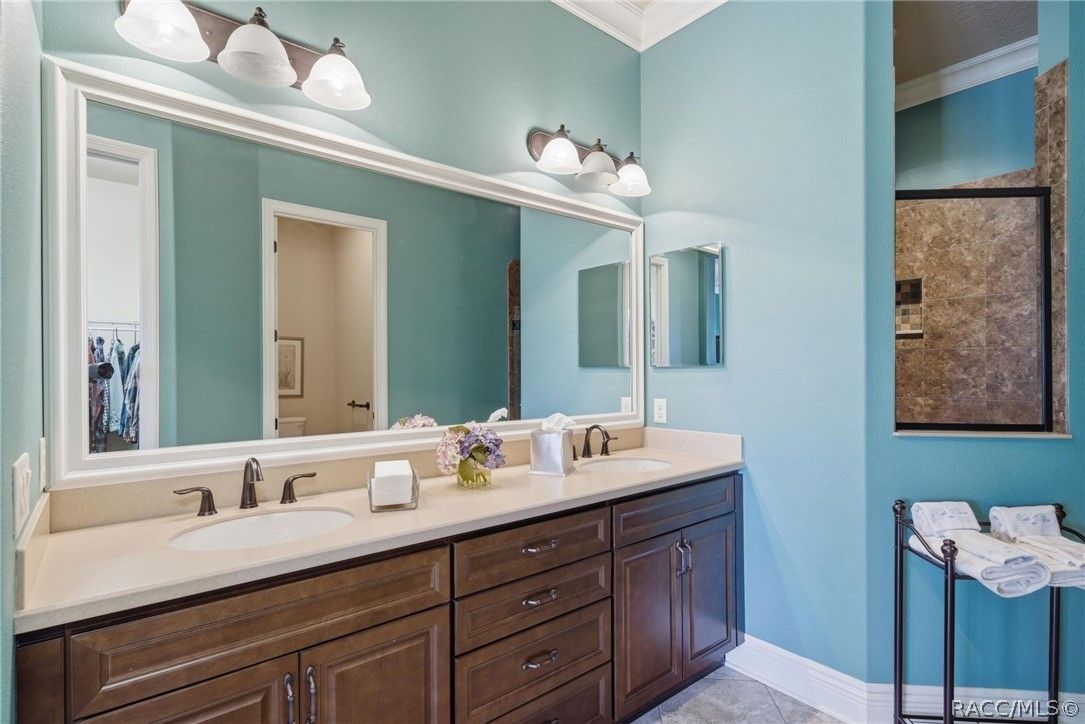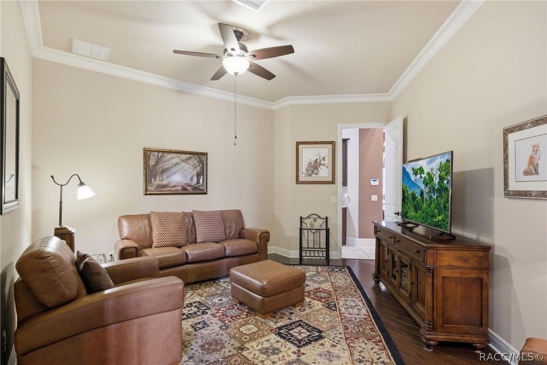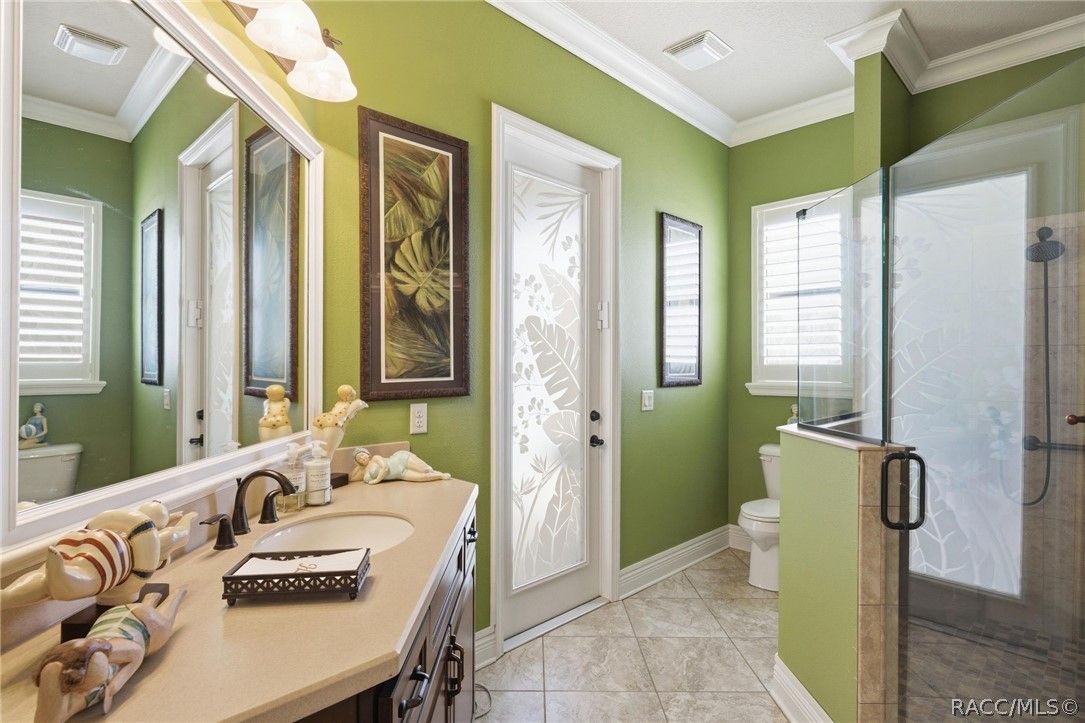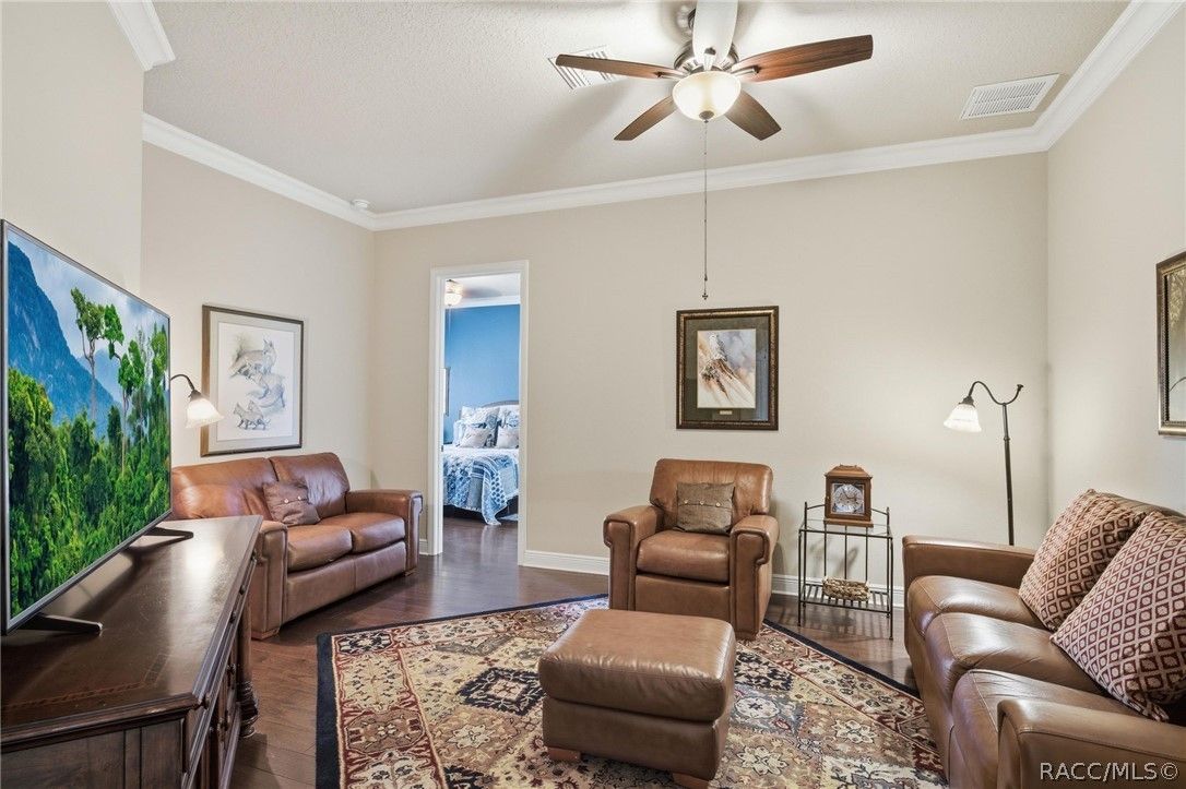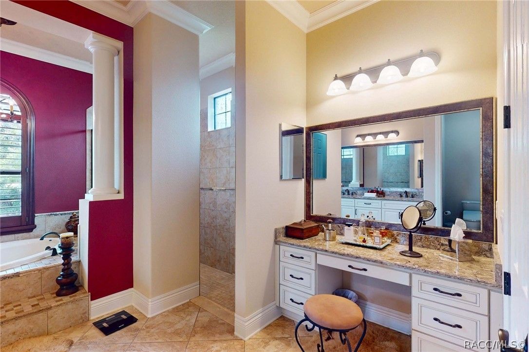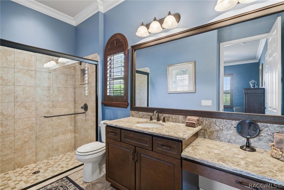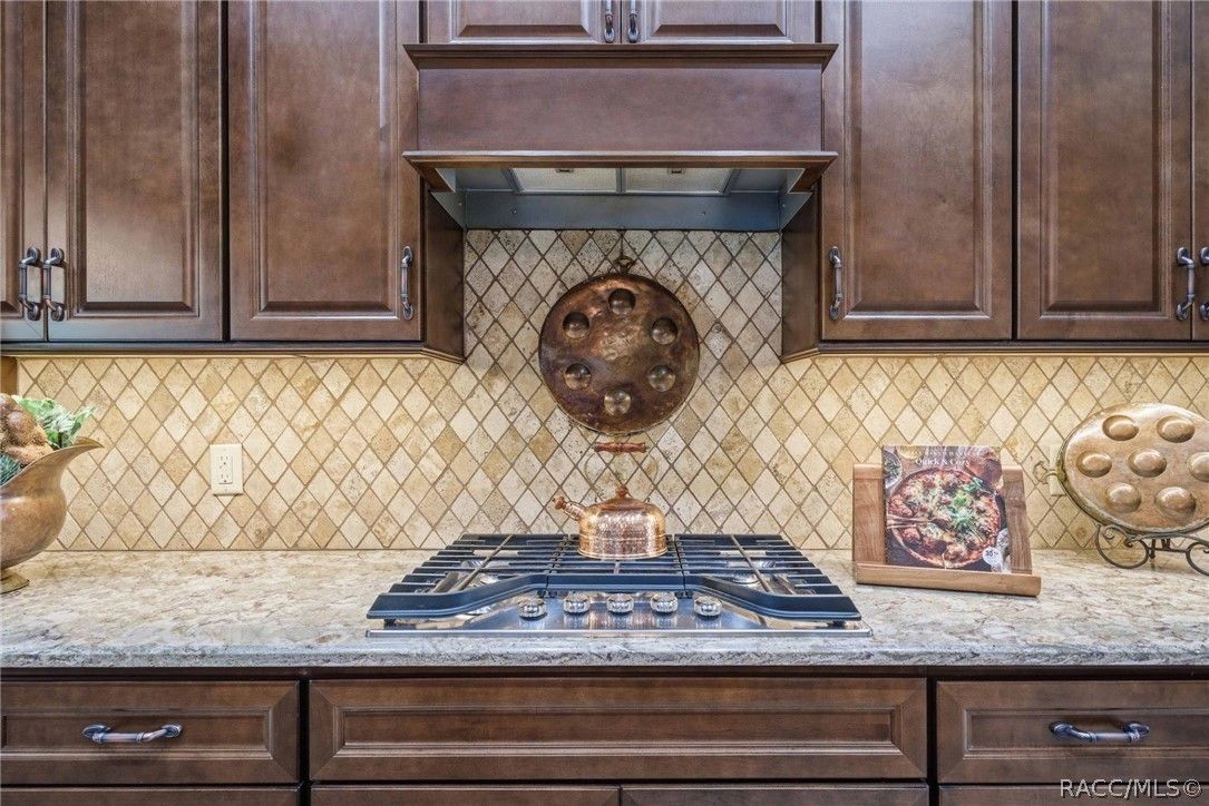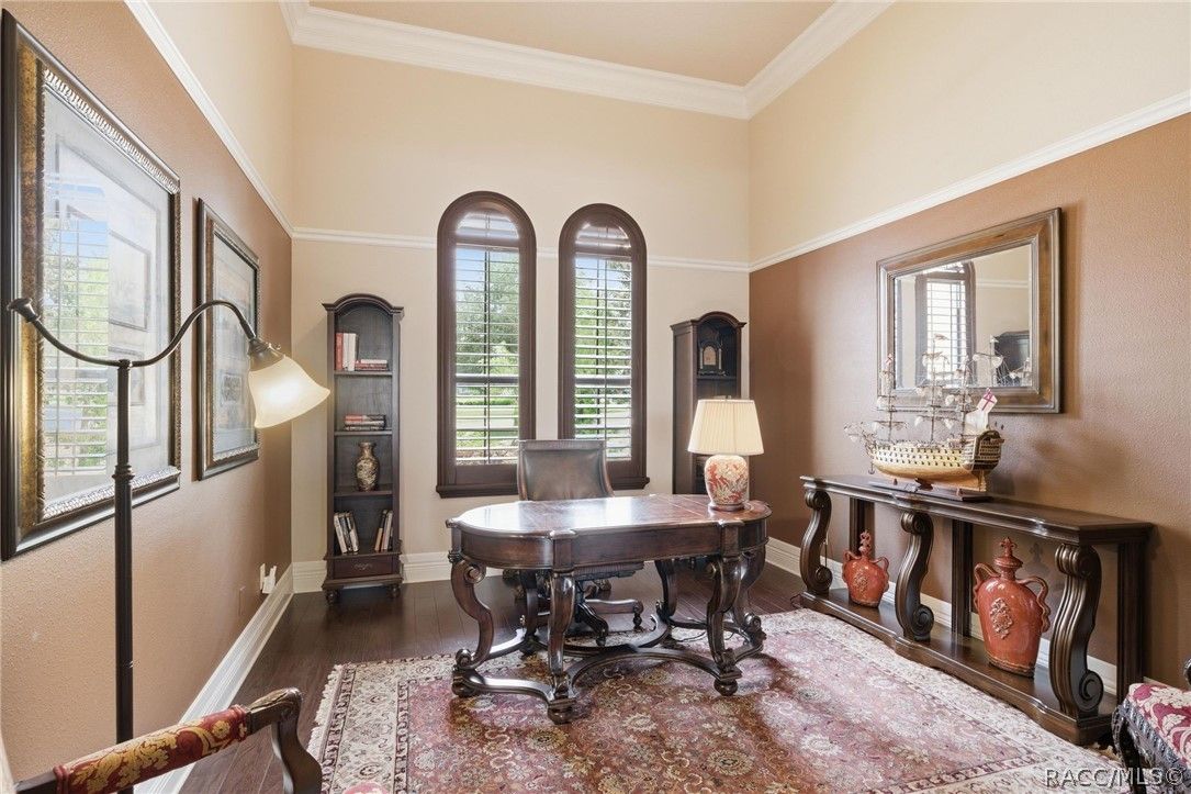 Imagine living in a masterfully crafted luxury home, where grand architectural details and resort-style living converge on an exceptional 0.36 acre lot. A wide paver driveway and lush tropical landscaping set the stage before you step through custom glass-and-leaded-transom entry doors into a welcoming foyer adorned with decorative columns, a tray ceiling, and a sparkling chandelier. This sophisticated entry features a wet bar- the perfect station for welcoming guests and serving beverages as they arrive, creating an effortless entertaining experience from the moment they enter. The expansive open floor plan seamlessly connects formal and casual living spaces into the chef's kitchen, which is nothing short of spectacular — featuring tall custom dark wood cabinetry, granite countertops, a gas cooktop with custom hood, KitchenAid double wall ovens, large stainless refrigerator, an island with seating for four, travertine diamond backsplash, and an enormous butler's pantry. The spacious great room with soaring ceilings opens to the entire living and kitchen area, making it the true heart of the home. This three-bedroom, four-and-a-half-bath home features two generous primary suites positioned on opposite sides of the residence; ideal for guests, multi-generational living, or personal preference. Each primary suite includes hardwood flooring, sitting areas, bay windows with plantation shutters, walk-in closets, and luxurious en-suite bathrooms with dual vanities and beautifully tiled walk-in showers. The third bedroom suite accommodates guests with grace. Additional highlights include a private home office with high ceilings, and an impressive craft room with full custom cabinetry, utility sink, built-in desk and dedicated laundry area; an amazing workspace for hobbies and projects. Crown molding, custom windows, recessed lighting, and tile floors throughout, complete the interior of this exceptional home. An oversized 3-car garage offers dedicated golf cart parking and tons of overhead storage. Outside, the resort-style backyard is an entertainer's paradise. A stunning screened-in lanai with sparkling pool and spa, also features an outdoor kitchen with built-in Coyote grill, granite counters and backsplash, perfect for al fresco dining. A curved stone balustrade terrace with a large gas fire pit overlooks serene, manicured green space. Located in Terra Vista at Citrus Hills, this home offers access to world-class resort-style amenities including championship golf courses, a state-of-the-art fitness center and spa, resort-style pools, tennis and pickleball courts, fine dining, and an active lifestyle in this highly sought after gated community. This exceptional property represents outstanding value; offering unparalleled quality at a price that truly reflects the remarkable opportunity before you.